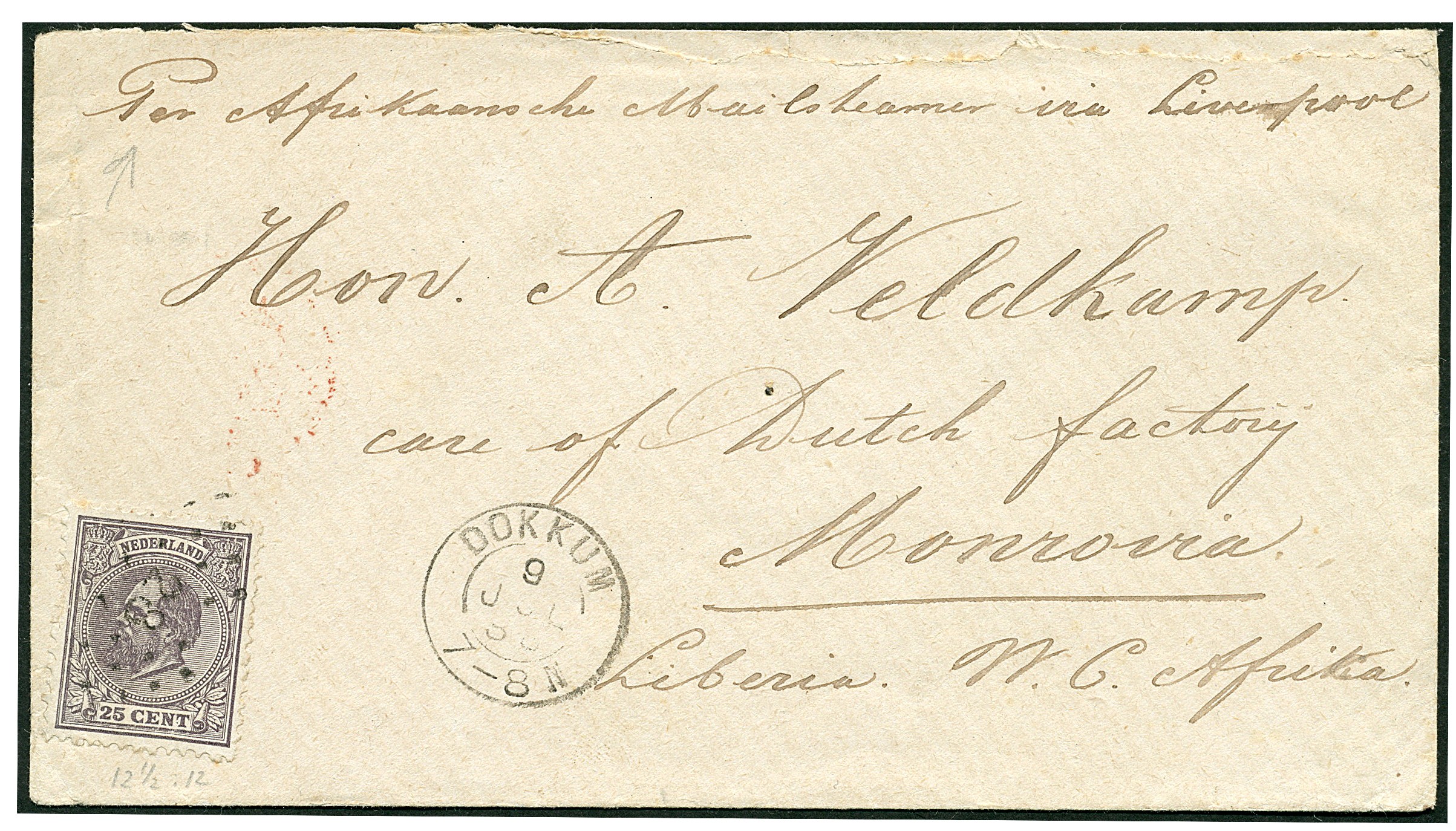 25 Cent nr. 26H op env. van Dokkum 9-7-1888 ´Per Afrikaansche Mailsteamer via Liverpool´ naar geadresseerde ´care of Dutch factorij´ te Monrovia, Liberia, westkust van Afrika met op az. rode afst. Nederland had daar een handelsnederzetting