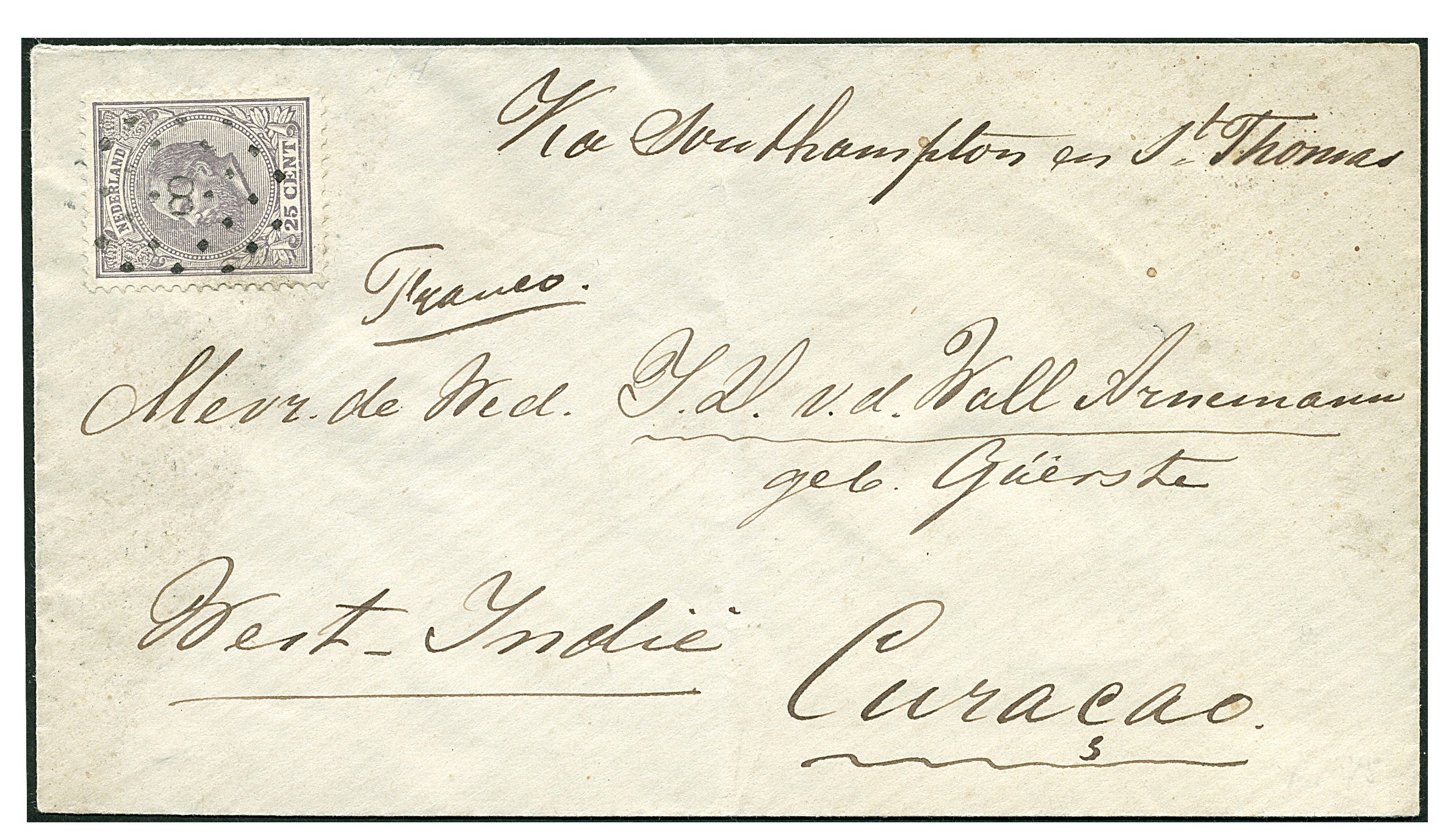 25 Cent nr. 26L op env. (vert. vouw) afgest. met puntstempel 8 van Arnhem ´Via Southampton en St. Thomas´ naar een mevrouw te Curaçao. Geen overige stempels