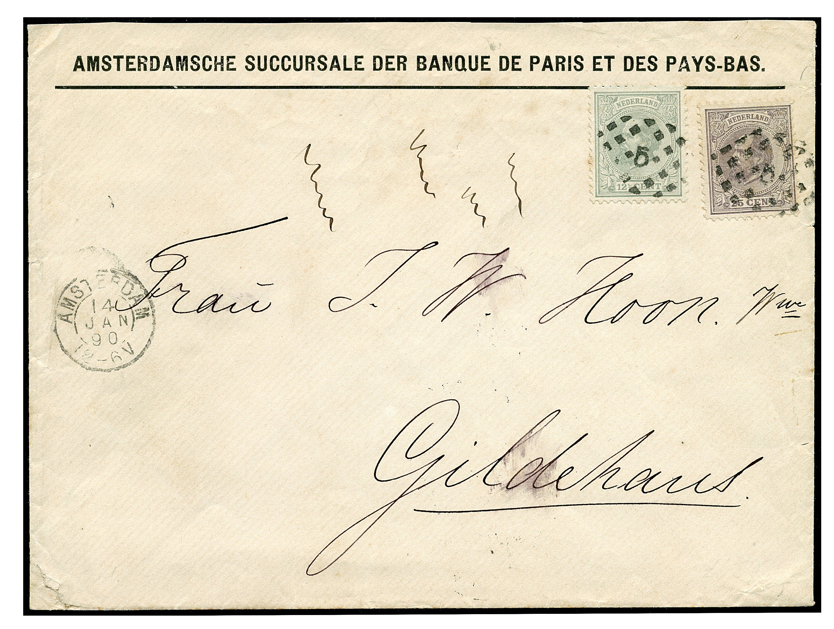 12½ Cent nr. 22L en 25 cent nr. 26H op 3e gew. klasse firmacouvert van een Amsterdamsche Succursale 14-1-1890 naar Gildehaus 14-1. Attest Dr. Louis (1993)