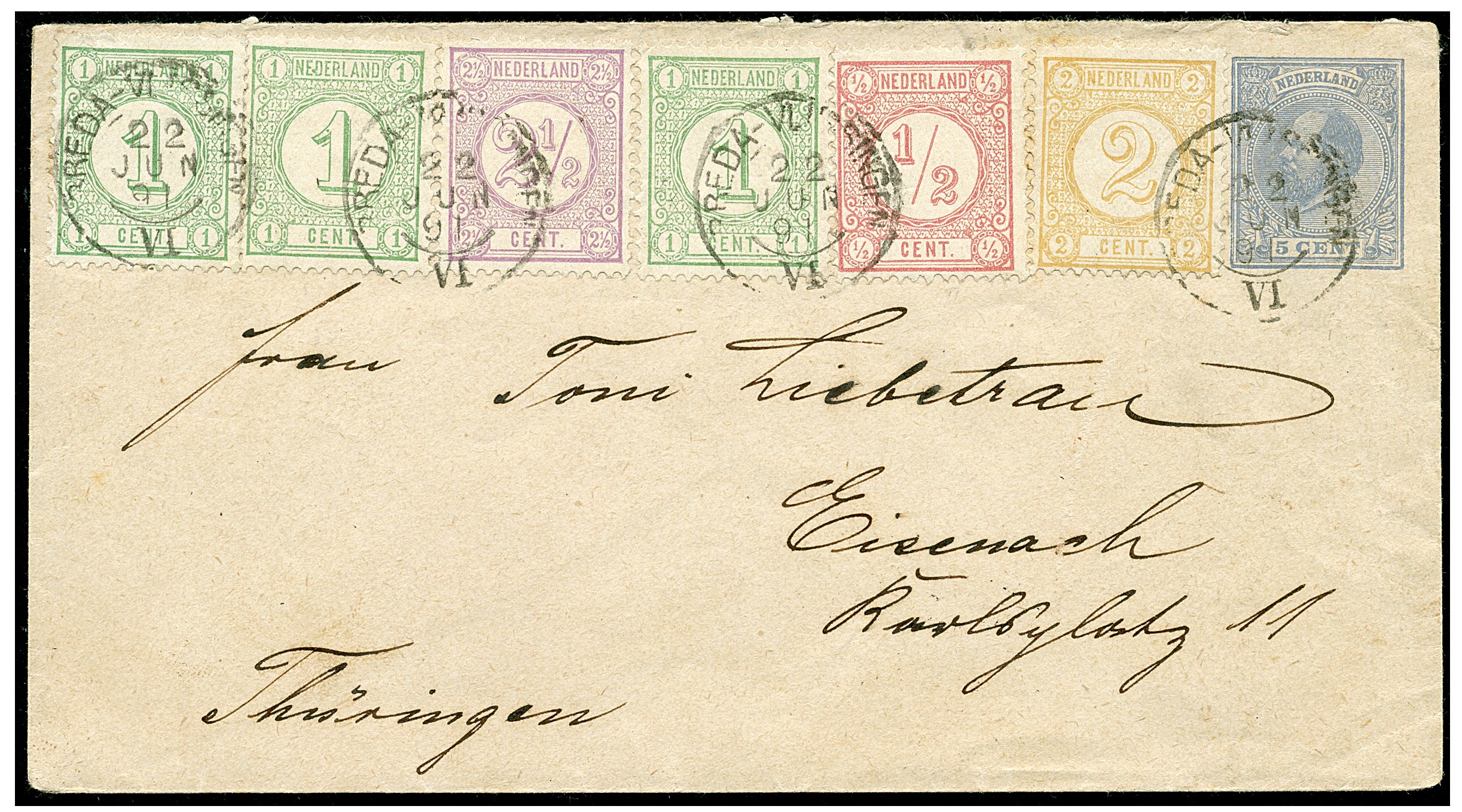 Env. G4 kleurrijk bijgefr. met Cijferserie op het traject Breda-Vlissingen VI 22-6-1891 naar Eisenach 23-6. Attest Dr. Louis (1999)