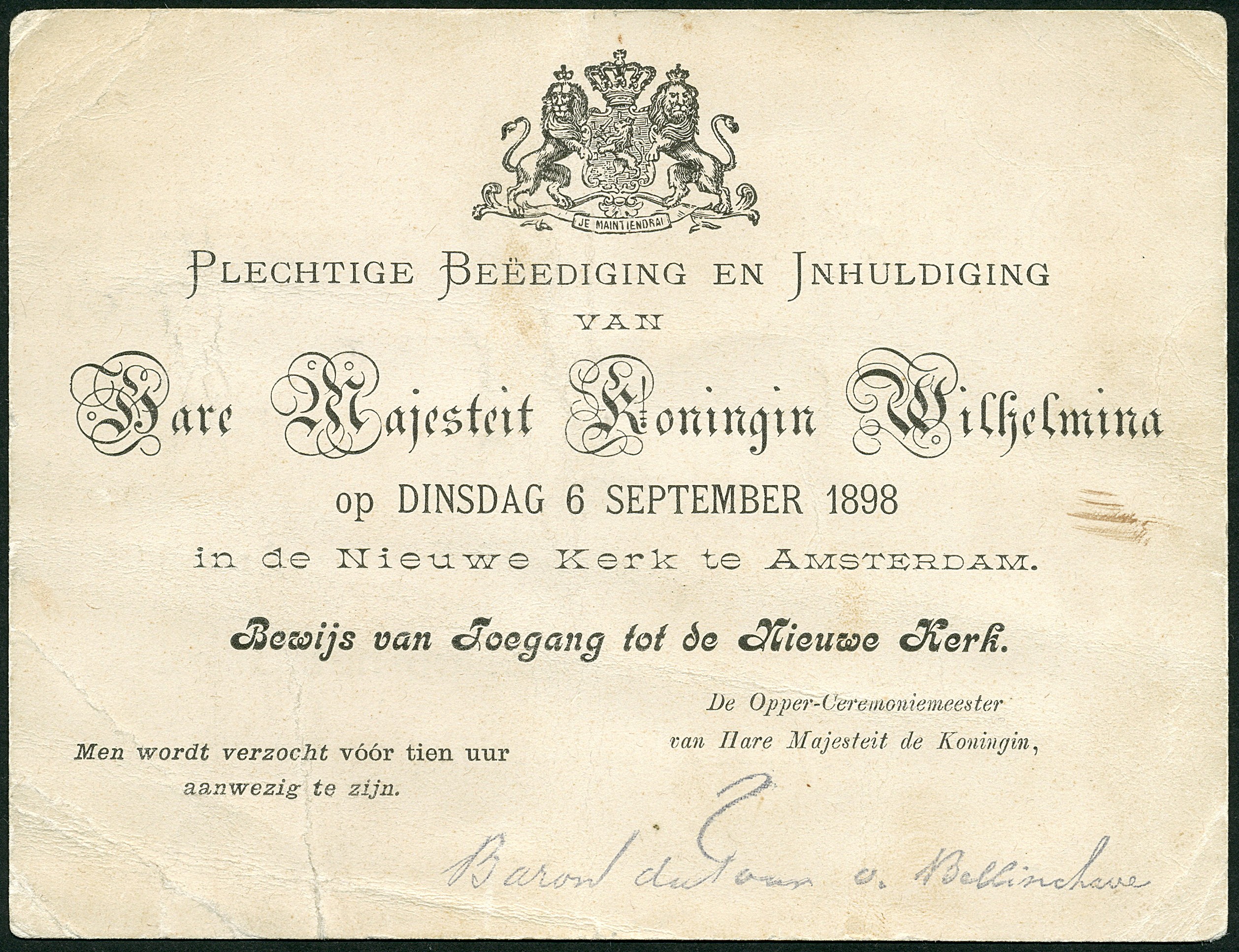 Koninklijk Huis. Origineel Bewijs van Toegang tot de Nieuwe Kerk in Amsterdam om de plechtige beëdiging en inhuldiging van Koningin Wilhelmina op 6-9-1898 bij te wonen. Deze kaart geeft 'Toegang tot de plaatsen op het Orgel'. Hoewel wat gebruikssporen een historisch belangrijk document! Past perfect in verzameling van het Koninklijk Huis of in speciaalcollectie Koningin Wilhelmina