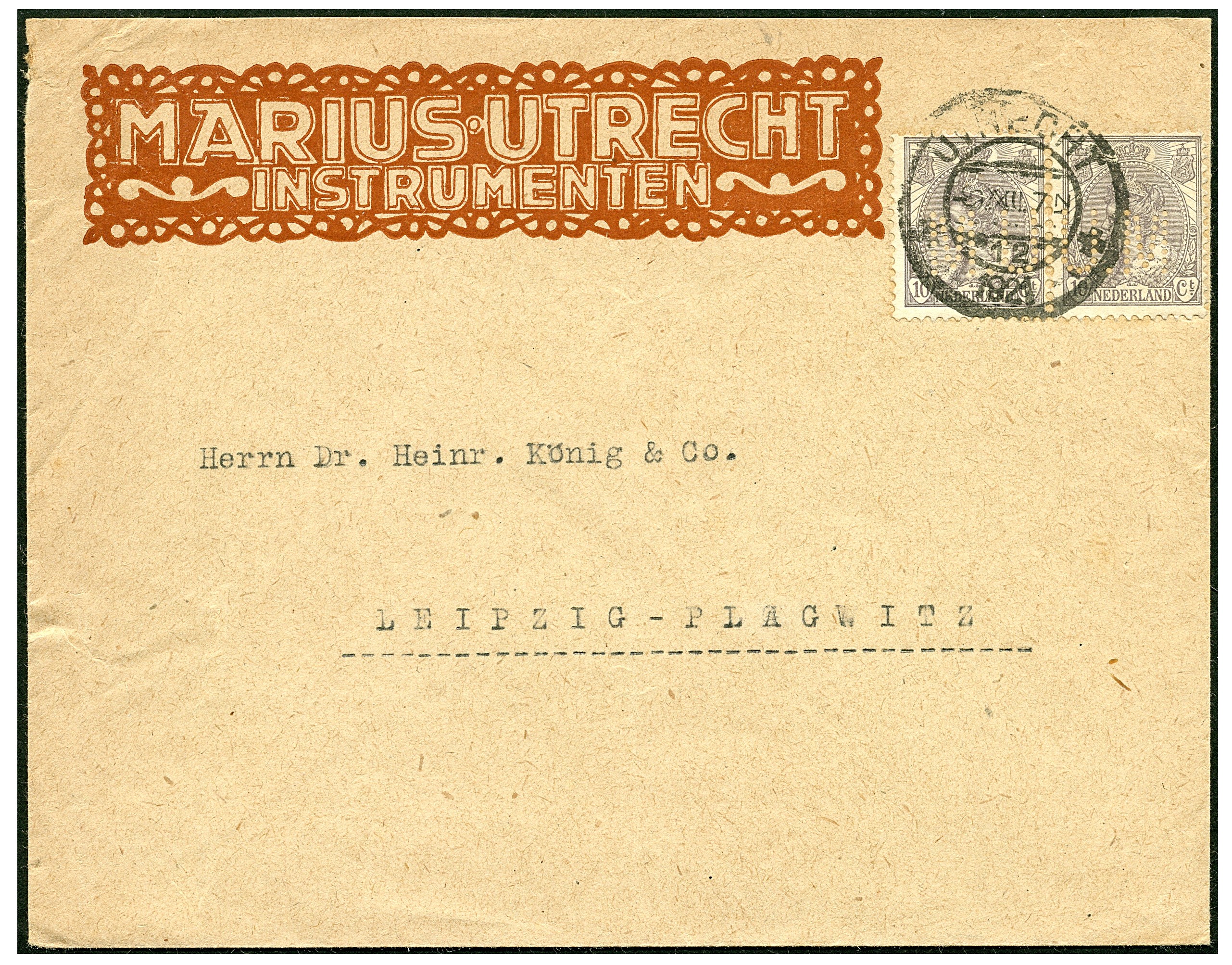 Perfin. 10 Cent Bontkraag in paar waarvan de linker zegel met perfin M.U. rechtstaand en de rechter zegel M.U. kopstaand (!) op prachtig couvert van Marius uit Utrecht van 9-12-1921 naar Leipzig