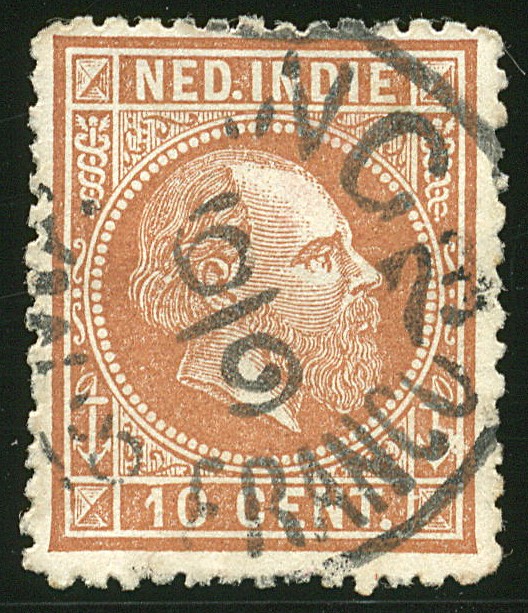 Rond-franco MALANG op 10c. Prachtex. met volledige, maar niet geheel overgekomen afdruk van 6-9-1873. Zeer zeldzaam! Voerman (1994): slechts 3 ex. op losse zegels emissie 1870 bekend!
