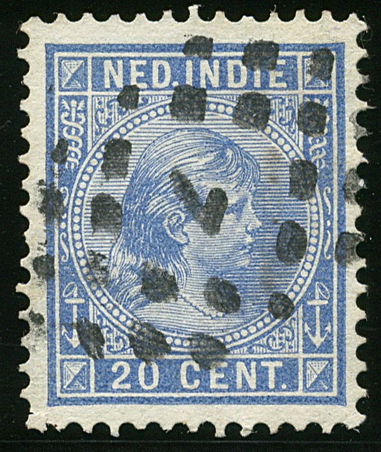 Puntstempel 1 = Weltevreden op 20c Hangend Haar. Vrijwel prachtex. met volledige afst.