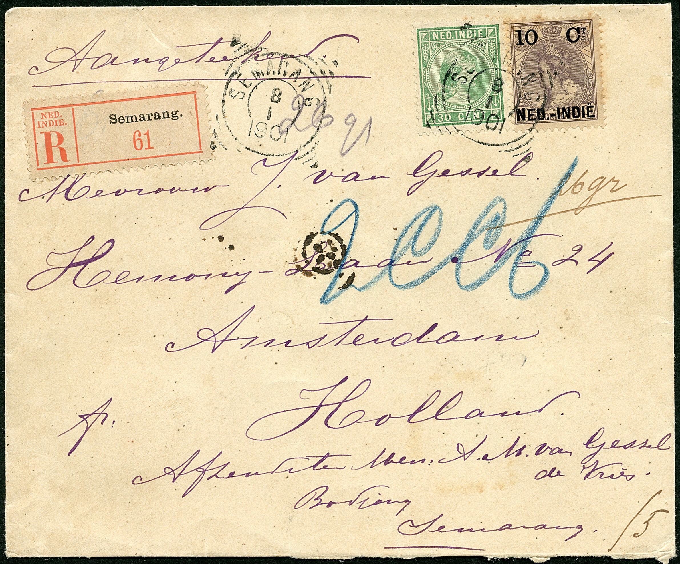 30 Cent en 10 cent Bontkraag op env. van 26 gr. van Semarang 8-1-1901 aangetekend naar Amsterdam 5-2. Schaarse mengfrankering!