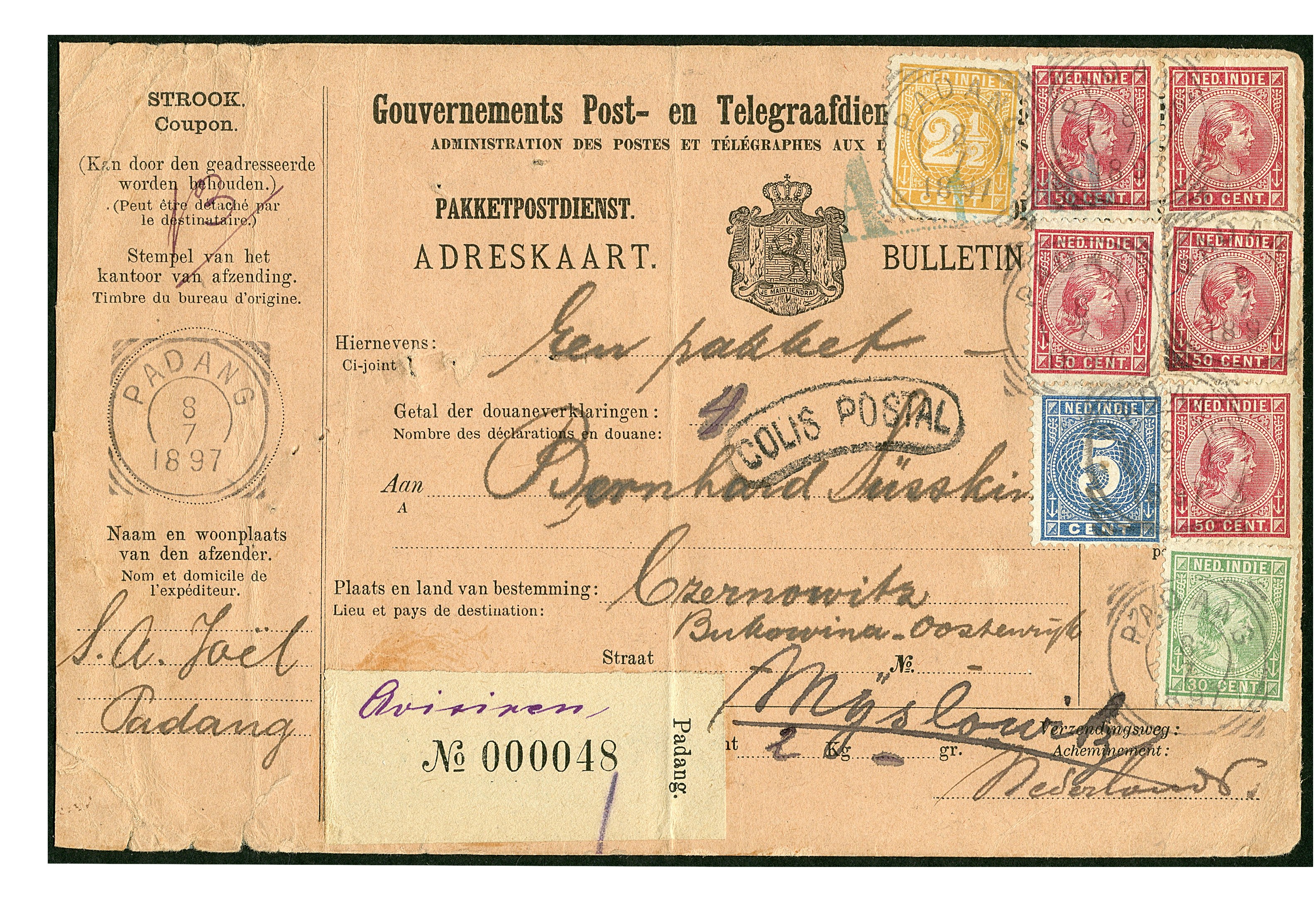 50 Cent (5x), 30 cent, 5 en 2½ cent (= 287½ cent) op een complete (iets gerepareerde) adreskaart behorende bij de verzending van een pakket van 2 kg. van Padang 8-7-1897 over Rotterdam 11-8, Emmerich 12-8 en de Poolse steden Myslowitz 15-8 en Krakau 15-8 naar Czernowitz (Oostenrijk, hoofdstad van Bukowina, nu in Oekraine). Zeldzame bestemming van dit bewaard gebleven stuk! Ex Bulterman