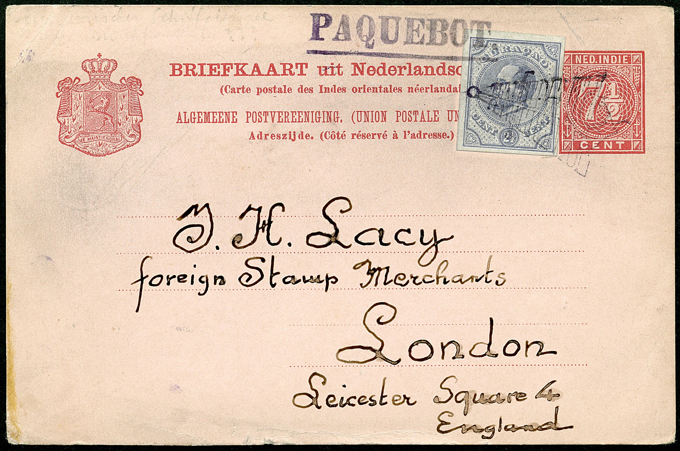 Bk. G12 met daarop geplakt een ongetande kleurproef van de 2½ cent Curaçao, afgest. met Paquebot en ons onbekend stempel in dezelfde kleur, van de filatelist Charles Nash te Soerabaja 16-10-1893 naar een postzegelhandelaar te Londen. Verzamelwaardig maakwerk