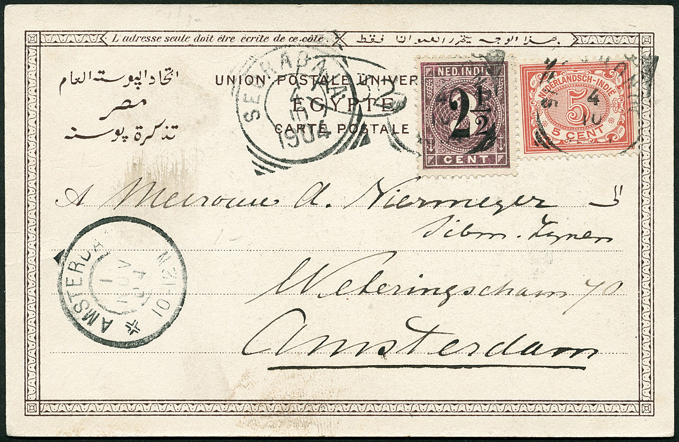 Vierkantstempel met spelfout SEORABAJA als doorgangsstempel op prentbk. van Sitoebondo 4-10-1904 naar Amsterdam 1-11-1904