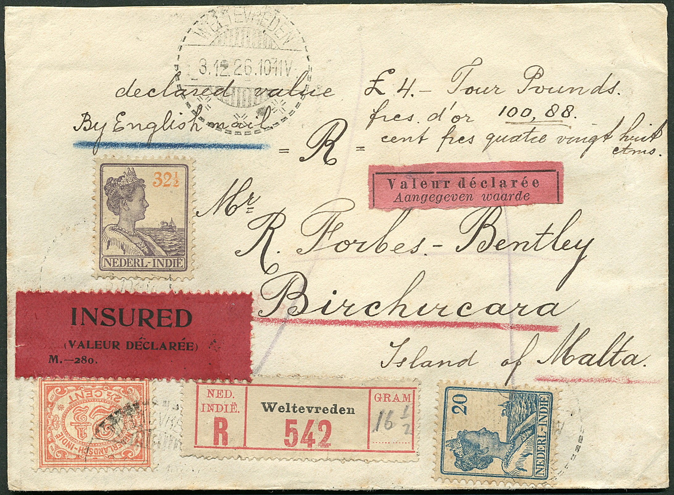 Waardezending. Env. van 16½ gr. met aangegeven waarde van 100,88 goudfrancs = 4 pounds gefr. met 2½, 20 en 32½ cent, van Weltevreden 3-12-1926 ´By English mail´ via diverse buitenlandse kantoren w.o. Alexandrië 27-12 en Brindisi 2-1-1927 naar Birchircara op Malta (= Birkirkara), met Valeurstrookjes van Indië en Malta. Zeldzame bestemming!