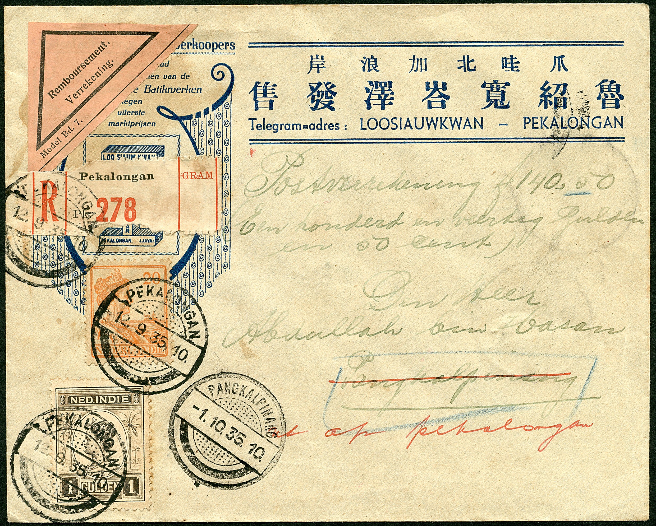Verrekenzending. Firma-env. met een verrekenbedrag van fl. 140,50 gefr. met 20 cent + 1 gld van Pekalongan 12-9-1935 naar Pangkalpinang 16-9, op 1-10 retour naar Pekalongan 5-10. Mooie afstempelingen PV1 naast elkaar, remboursstrookje Lozon 12 (R)