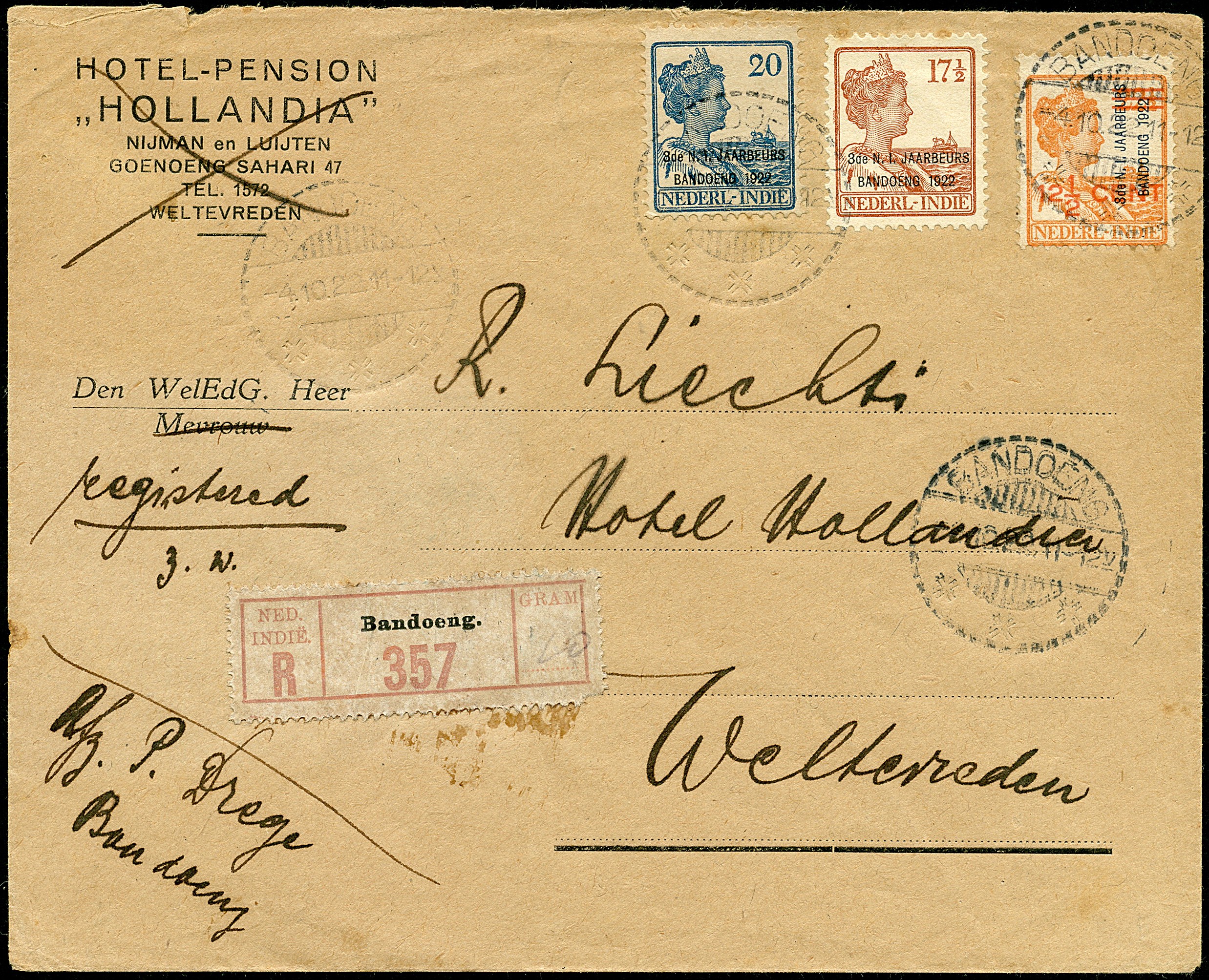 Jaarbeurs Bandoeng. 12½, 17½ en 20 Cent nrs. 157/59 (zegels enkele roesttandjes) op env. van Bandoeng 4-10-1922 aangetekend naar Weltevreden 4-10