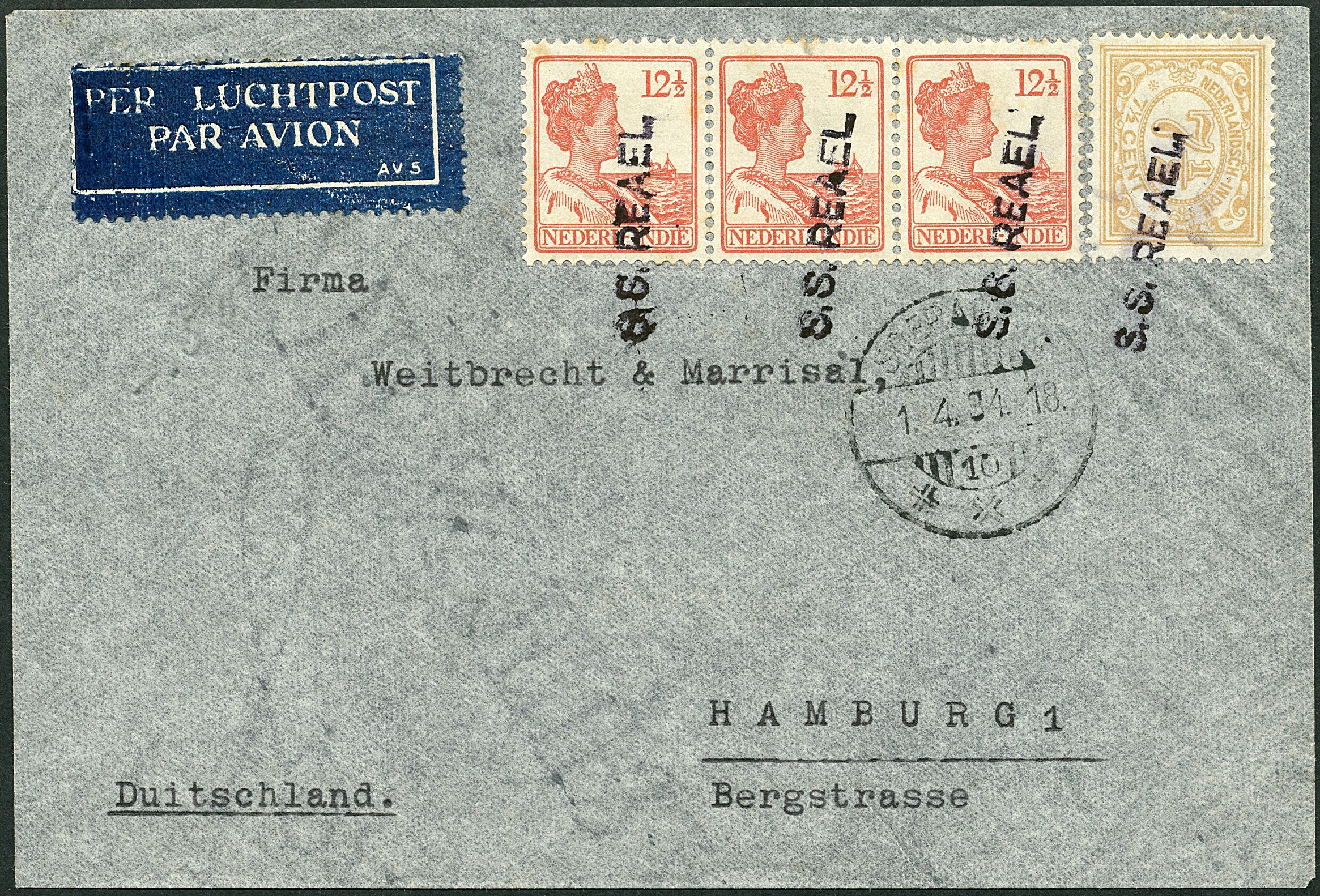 KPM. Luchtpostcouvert uit Samarinda gefr. met 7½c en 12½c in strip 4x in zwart afgest. met KPM-naamstempel S.S. REAEL, via Soerabaja 1-4-1934 naar Hamburg