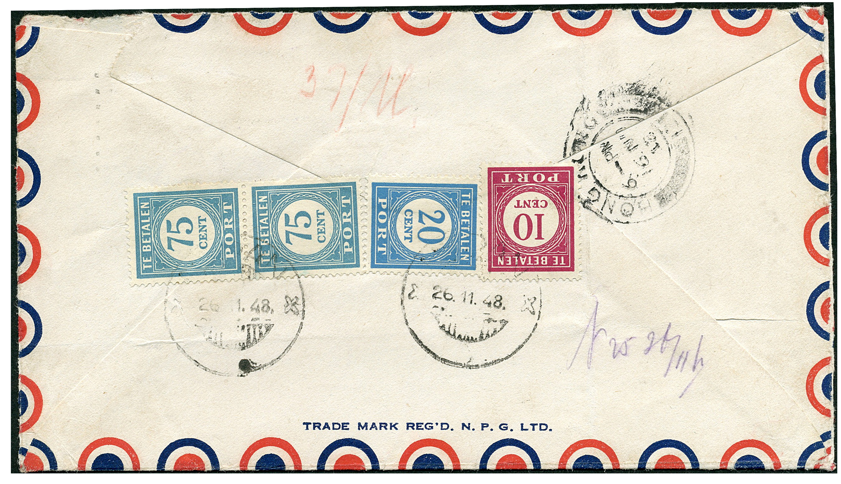 Port. Luchtpostenvelop van Peterborough (Canada) 8-11-1948 ontoereikend gefr. met op vz. portstempel in centimes met erin geschreven '180' en 'BY AIR TO OFFICE OF EXCHANGE ONLY' via Hong Kong 16-11 naar Medan, daar op 26-11 beport met 10, 20 en 75 cent in paar, tezamen 180 cent. Mooi portstuk!