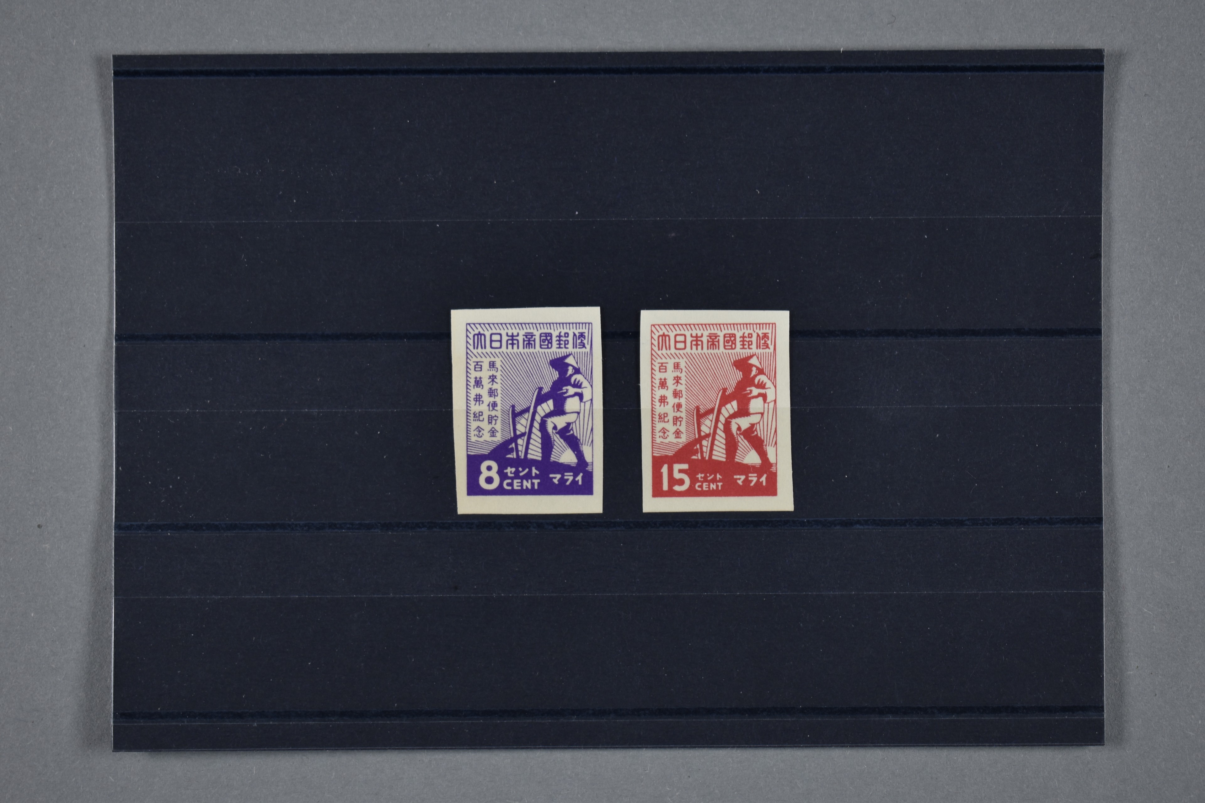 Malaya. Propaganda stamps for the Postal Savings Bank. Imperforated colour proofs in the chosen colours, without gum
