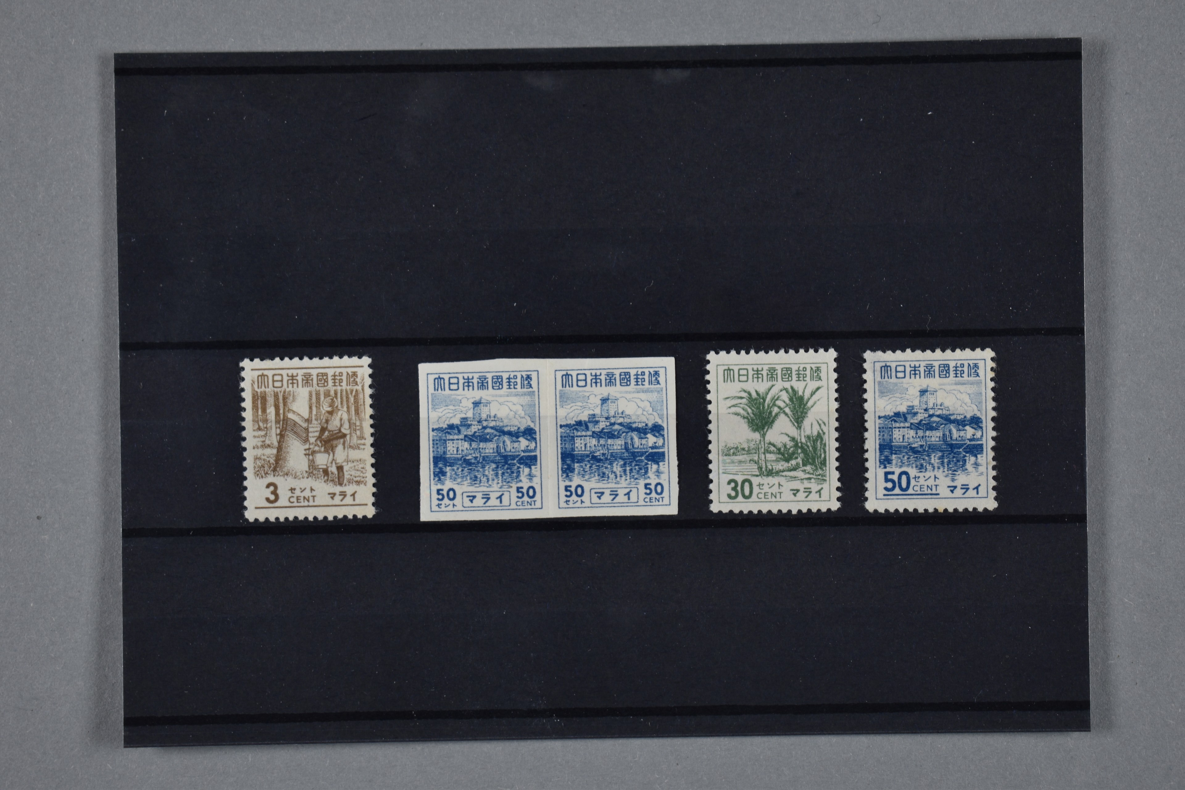 Malaya. Definitive issue, perforated ungummed colour proofs of the 3 cent, 30 cent and 50 cent (large numerals, thin spot), and imperforated ungummed colour proof of the 50 cent (small numerals) in pair