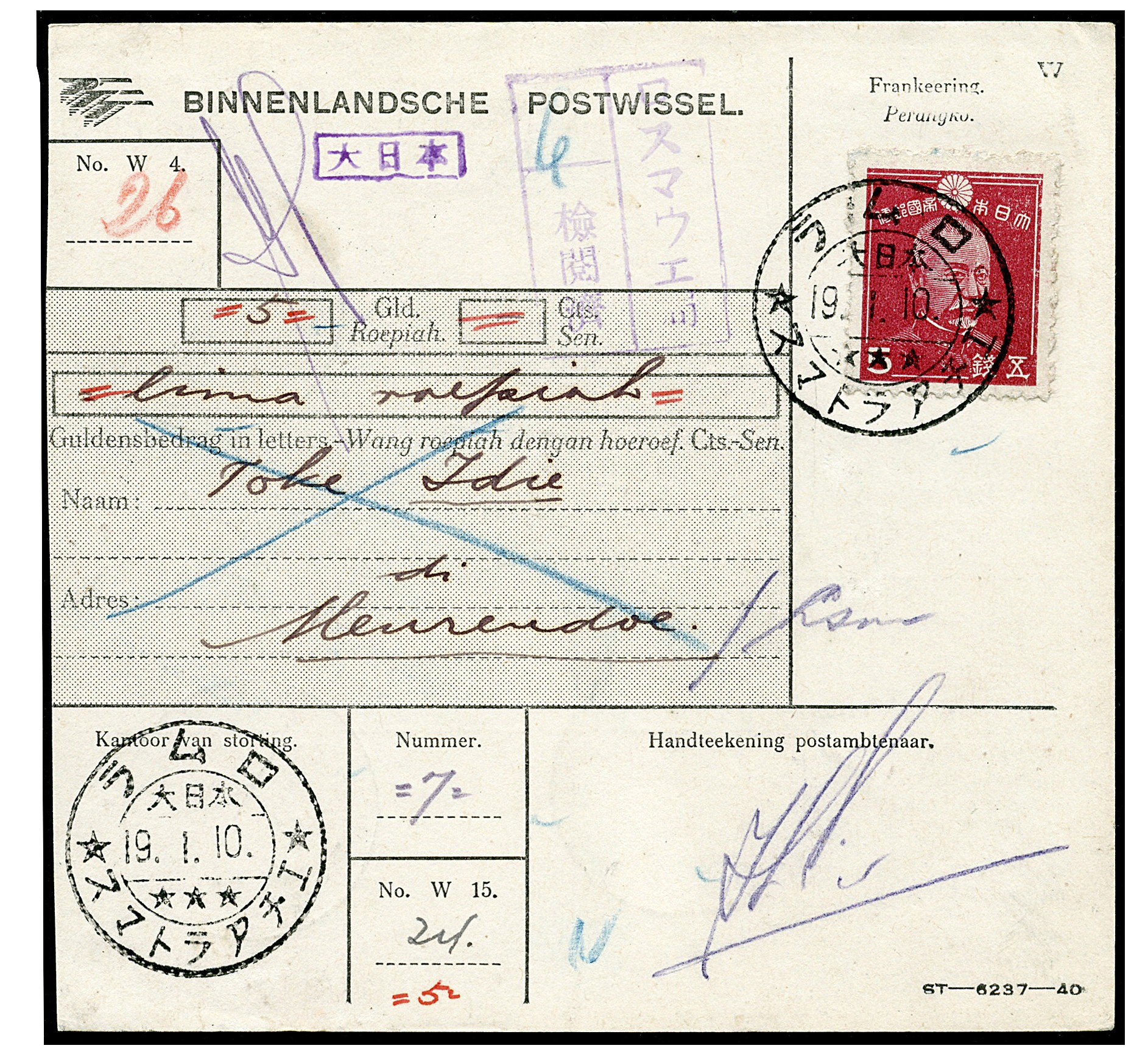 Sumatra. Atjeh. 5 Sen Japanese stamp Admiral Togo as a single franking on censored money order Bu.JF1a with violet framed Dai Ni Hon overprint from Lammeulo 19.1.10 to Meureudoe 19.1.13