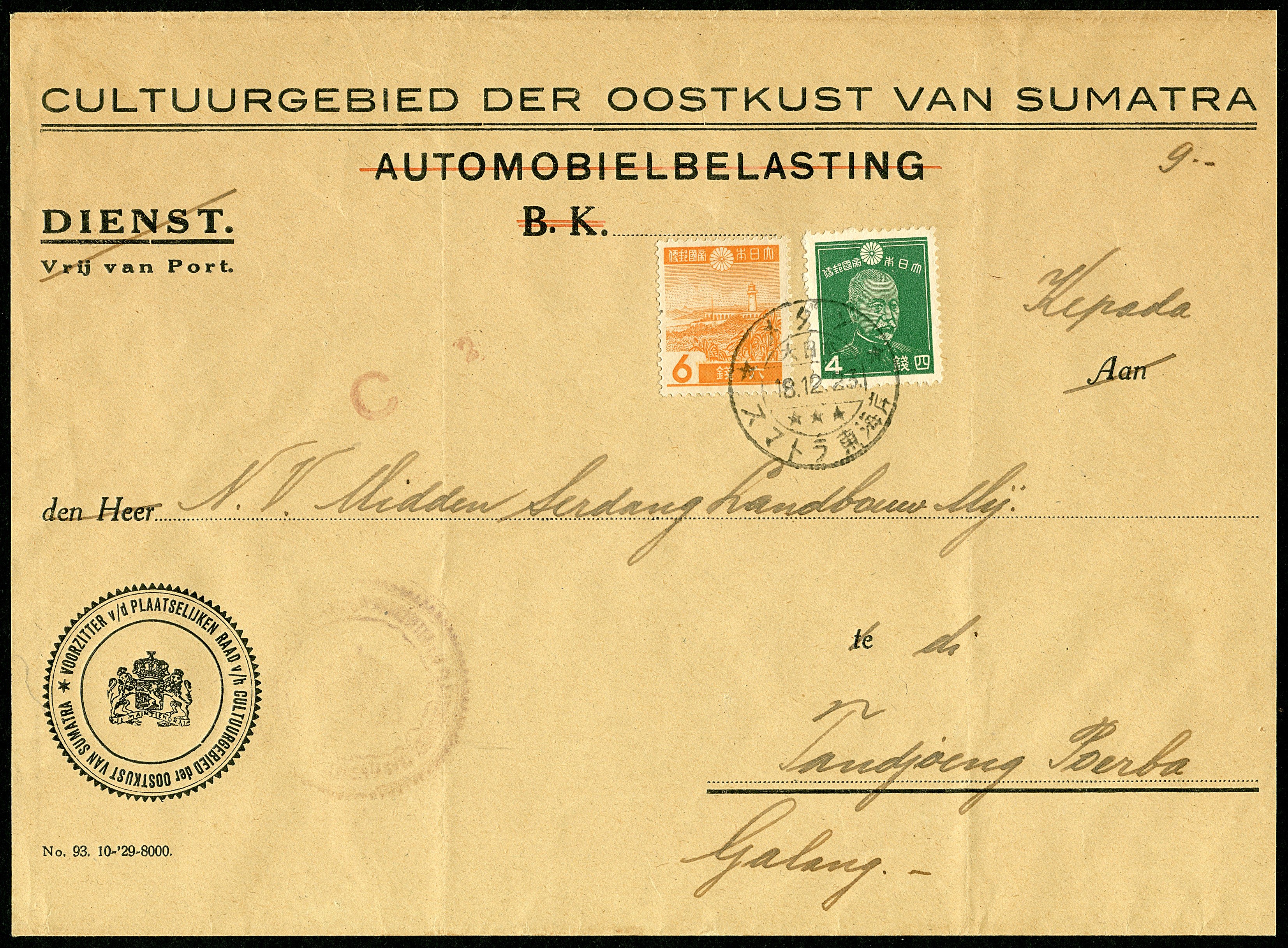 Sumatra. East Coast. 4 Sen Admiral Togo and 6 sen to make up the rate of 10 cent on censored printed envelope (3 sides opened) from Medan 18.12.23 to Galang