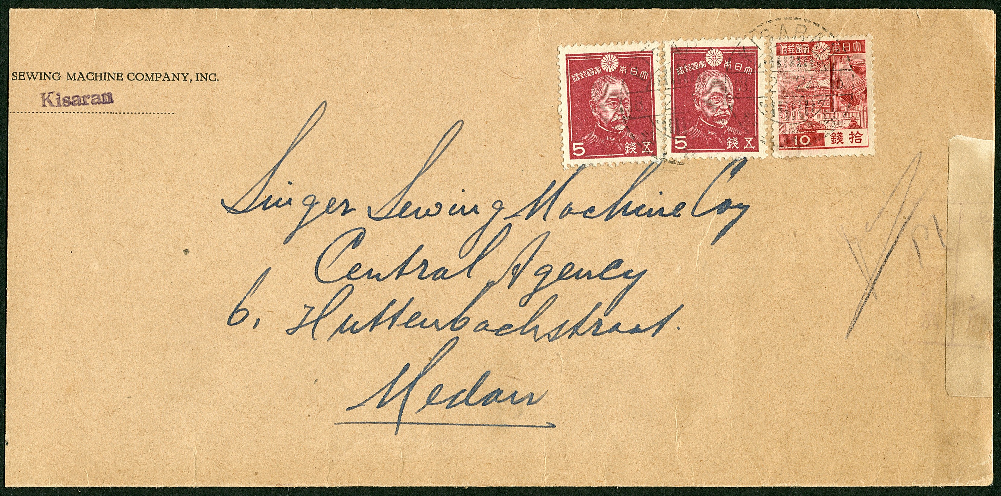 Sumatra. East Coast. 5 Sen Admiral Togo (2x) and 10 sen Japanese stamp on censored Singer envelope from Kisaran 18.2.24 to Medan