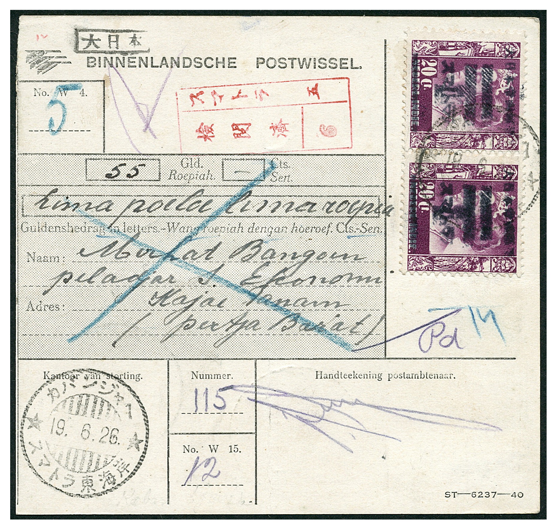 Sumatra. East Coast. 20 Cent type Kreisler with black handstamped T-overprint no. 911z-27b in pair on censored M.O. showing black framed Dai Ni Hon, from Kabandjahe 19.6.26 to Kajoetanam 19.-7.-3