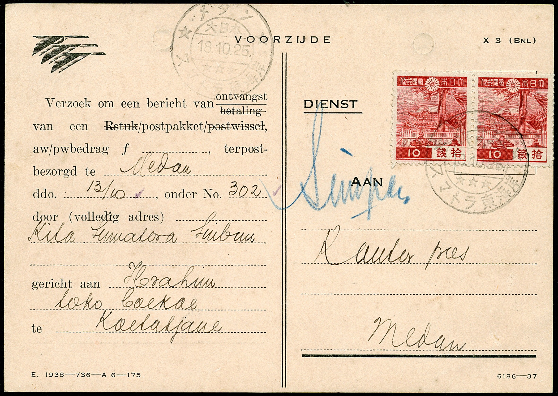 Sumatra. East Coast. Receipt of Acknowledgement Bu.JF16 (2 pinholes repaired) bearing 10 sen Japanese stamp in pair as a receipt for delivering a package from Medan 13 Oct 1943 to Koetatjane, cancelled Medan 18.10.25. In blue pencil ´Simpan´ (= save). Illustrated in Bulterman postal stationery on page 100