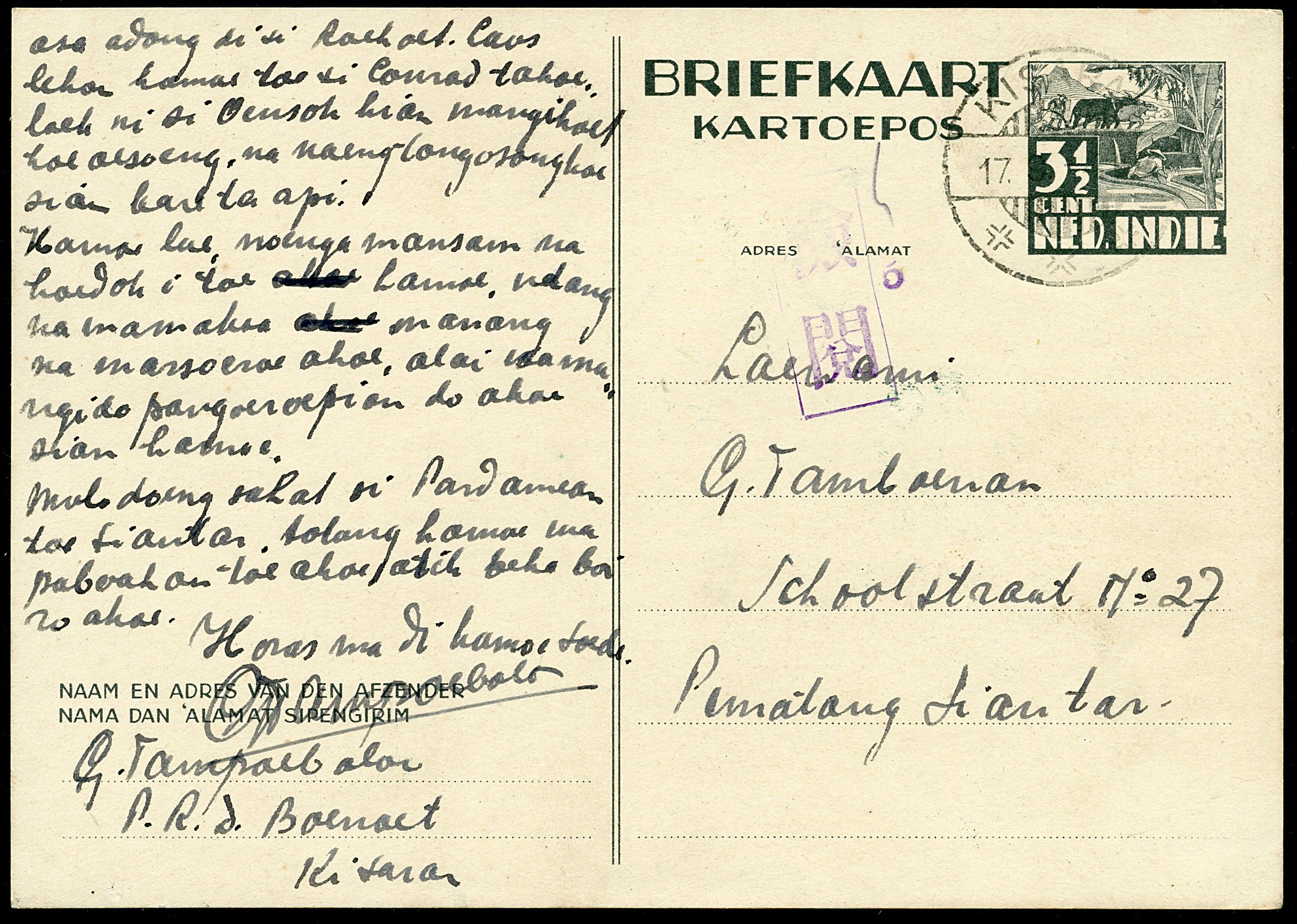 Sumatra. East Coast. 3½ Cent postcard type Kreisler in offset printing without any overprint Bu.S1a, censored from Kisaran 17.9.14 to Pematangsiantar