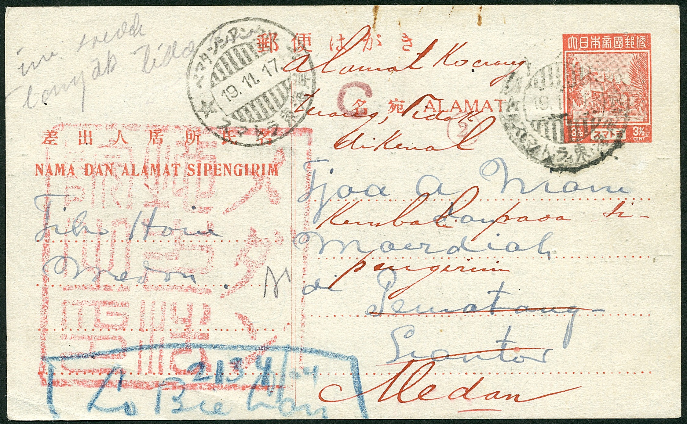 Sumatra. East Coast. 3½ Cent postcard type definitive issue for Sumatra Bu.189b with square military authority cachet in red, censored from Medan 19.11.14 to Pematangsiantar 19.11.17