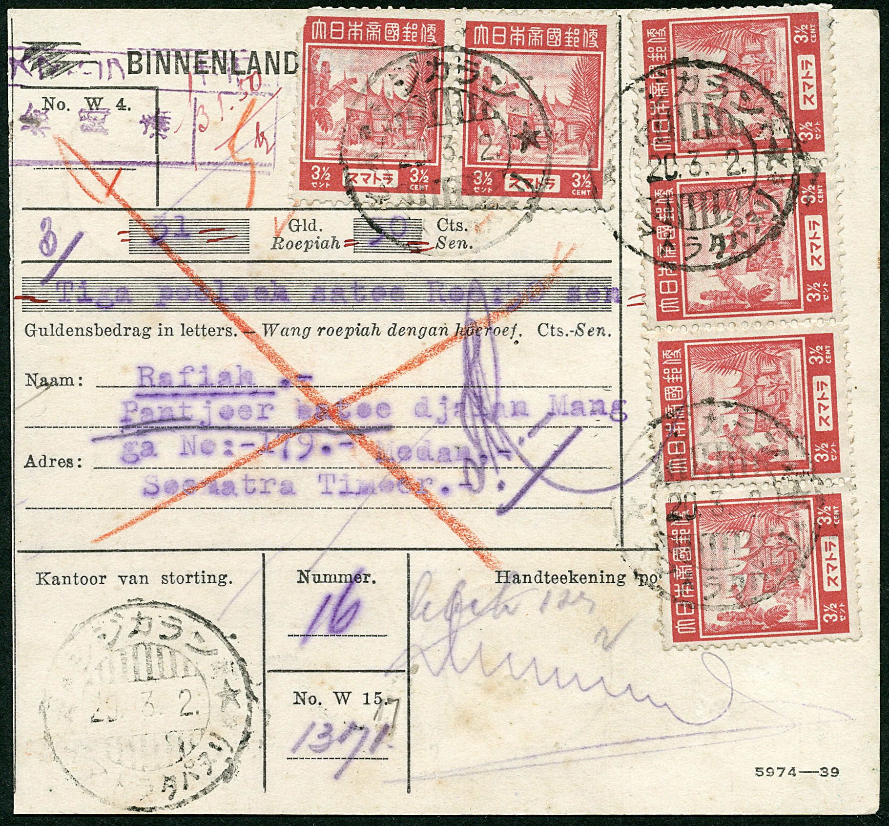 Sumatra. Tapanoeli. 3½ Cent definitive issue in pair (left stamp corner missing) and strip of four on censored M.O. from Sidikalang 20.3.2 to Pantjoerbatoe 20.3.12