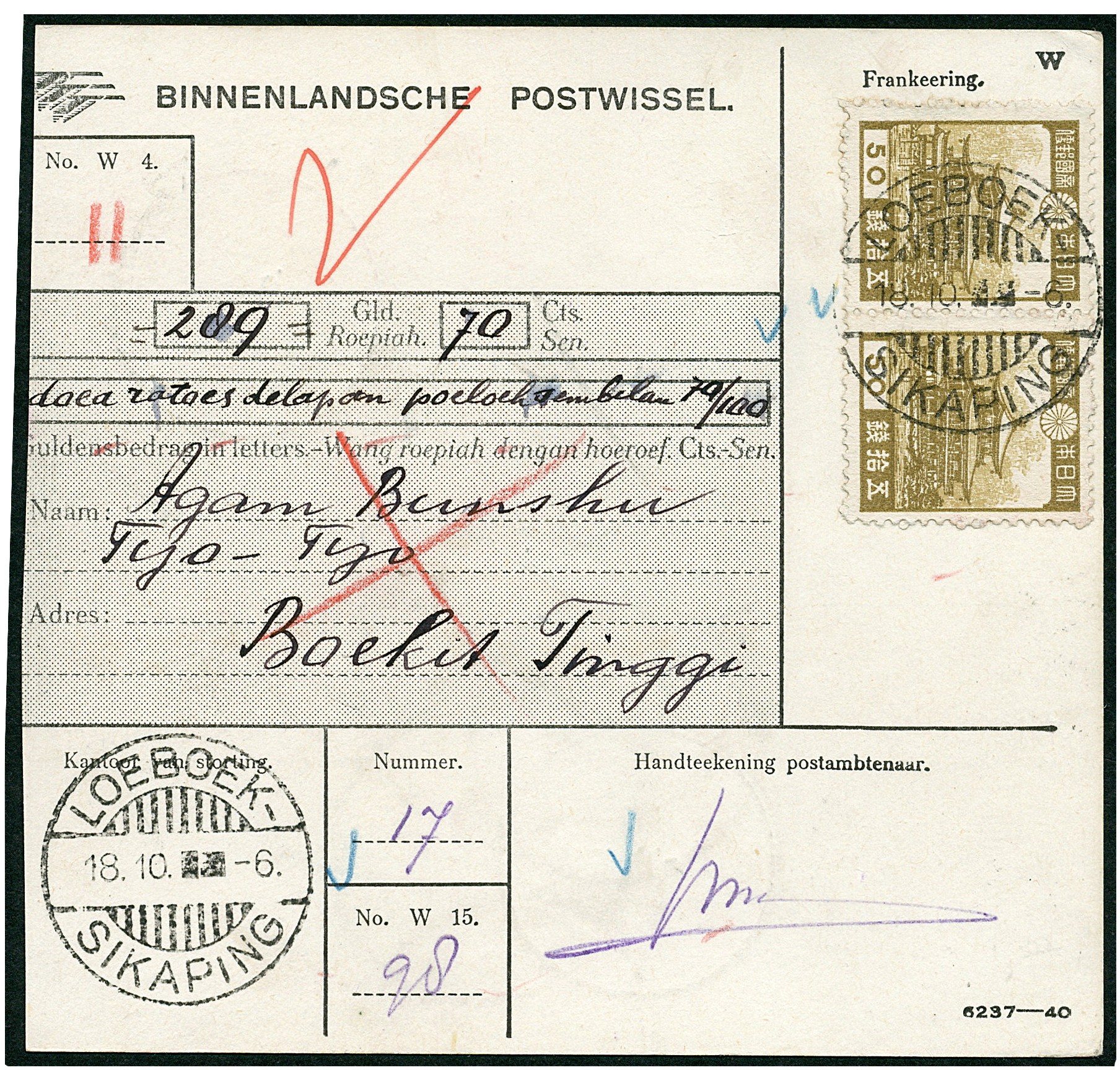 Sumatra. West Coast. 50 Sen Japanese stamp in pair on censored money order Bu.JF1a from Loeboek-/Sikaping 18.10.-6 to Boekittinggi 18.10.-6