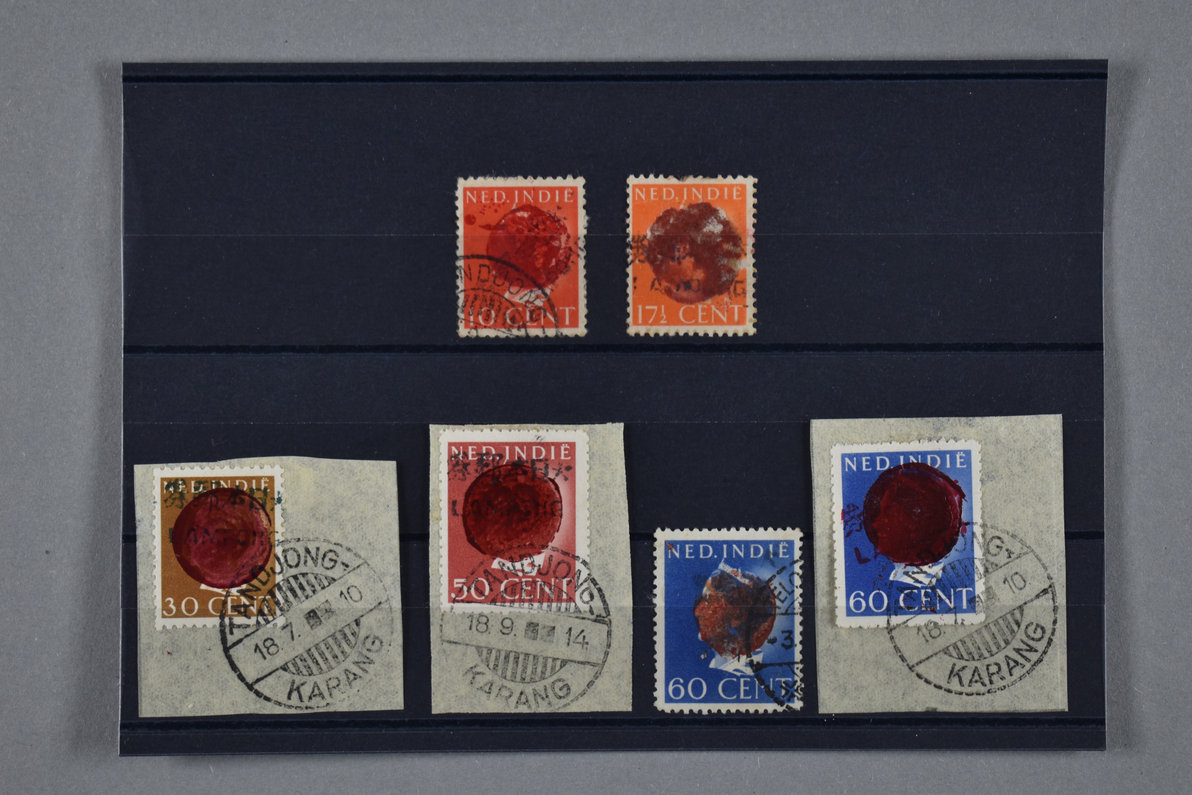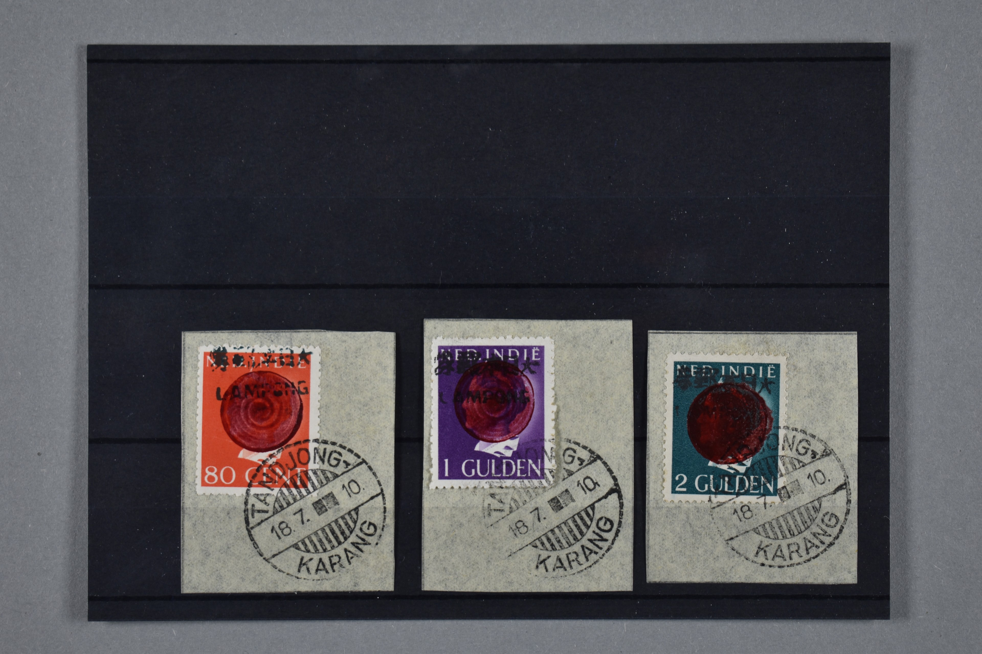 Sumatra. Lampong. Dai Ni Hon Yuken Lampong two-line overprint in combination with a red (or orange, on the 60 cent) wax disk to cover the image of the Queen on Van Konijnenburg 10, 17½ (unused, faults) and 60 cent genuinely used, the 30, 50, 60 and 80 cent and the 1 and 2 gulden c.t.o.