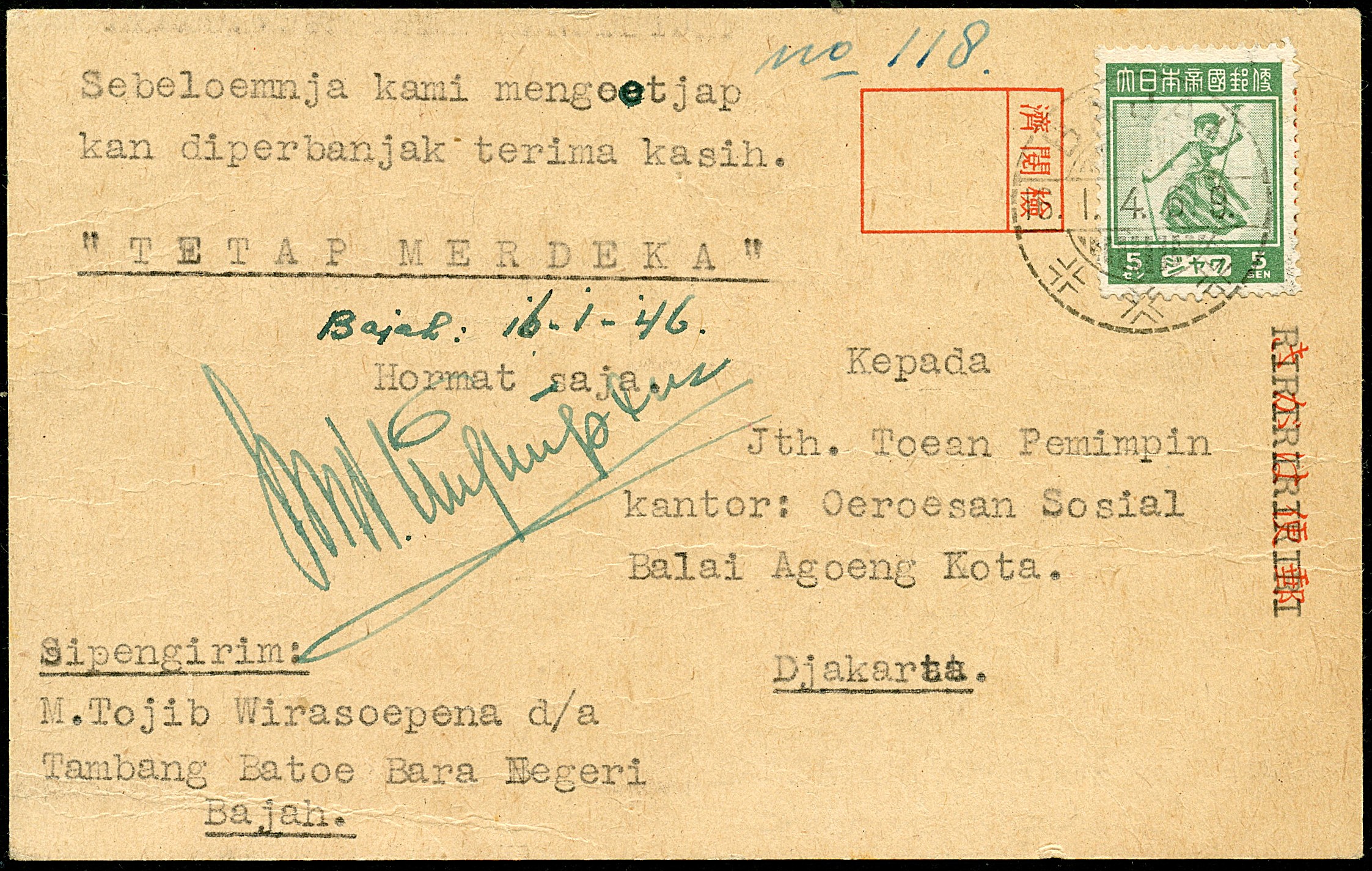 Japanese military fieldpost card bearing 5 cent definitive issue without overprint from Bajah 15.1.46 (scarce on cover/card!) to Djakarta