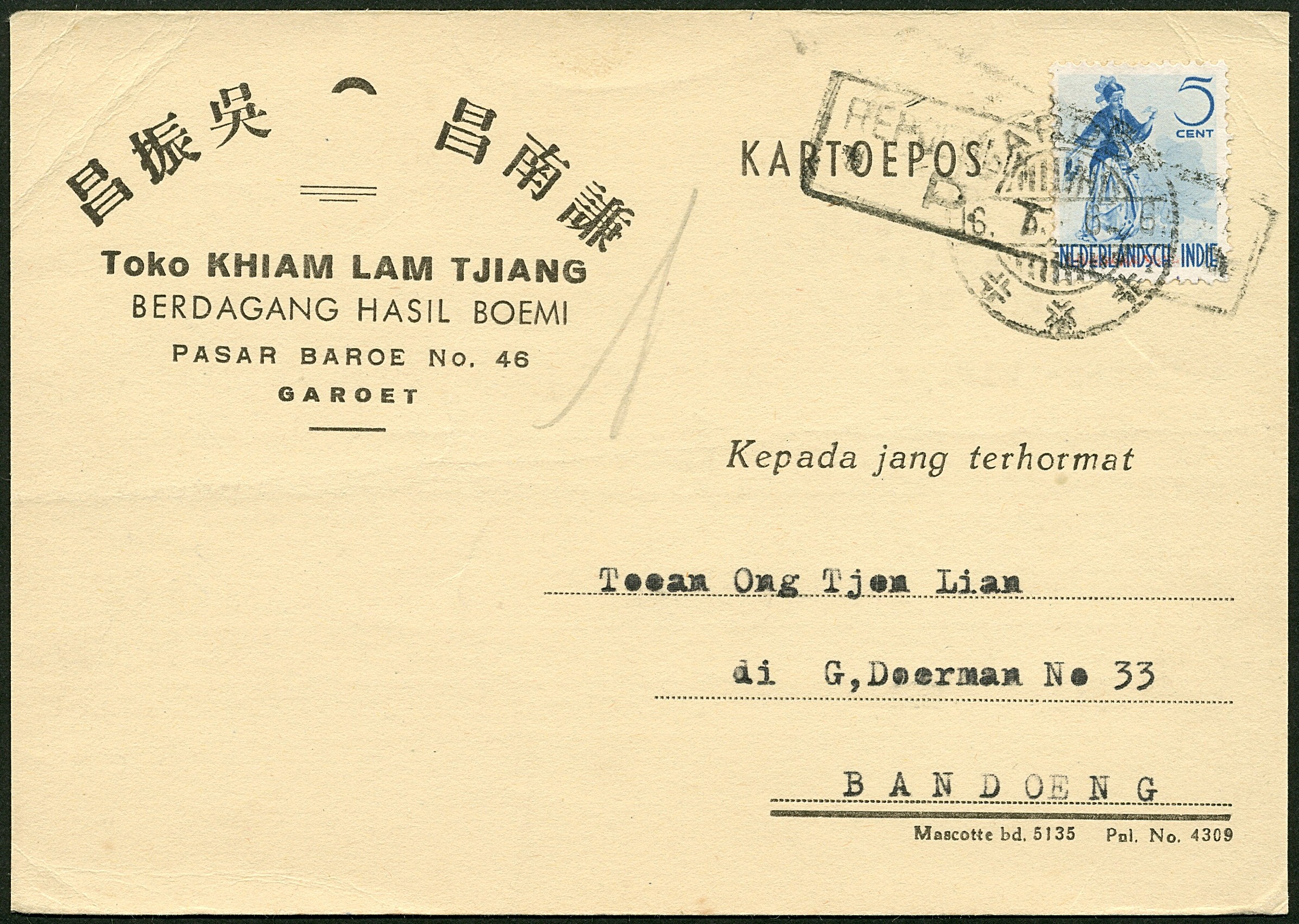 5 Cent Dancer with former country namer partly deleted by red pen line on company postcard tied in black by framed REPOEBLIK - INDONESIA / P.T.T. from Garoet 16.3.6 to Bandoeng