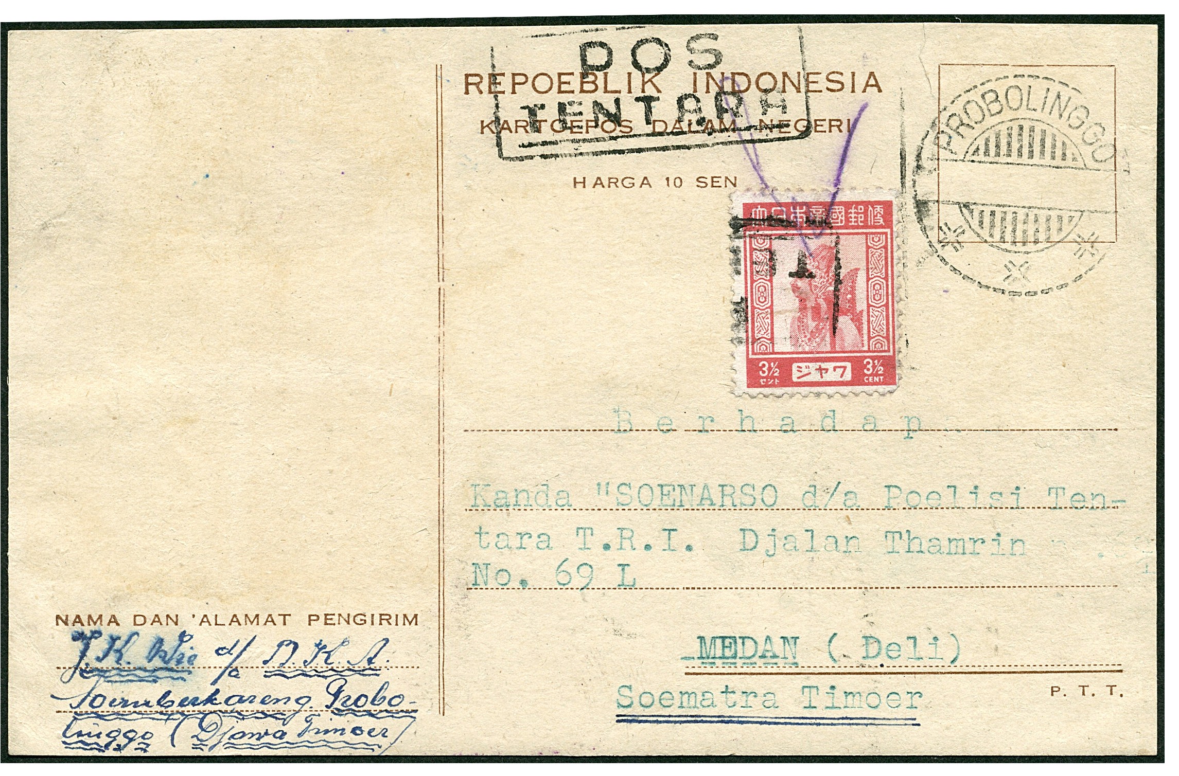 Pos Tentara. Postcard Bu.RJ13 with open bar cancellation Probolinggo with additional 3½ cent definitive issue, written at Soemberkareng 8.6.1946, used as a Pos Tentara (field post) card, to Medan