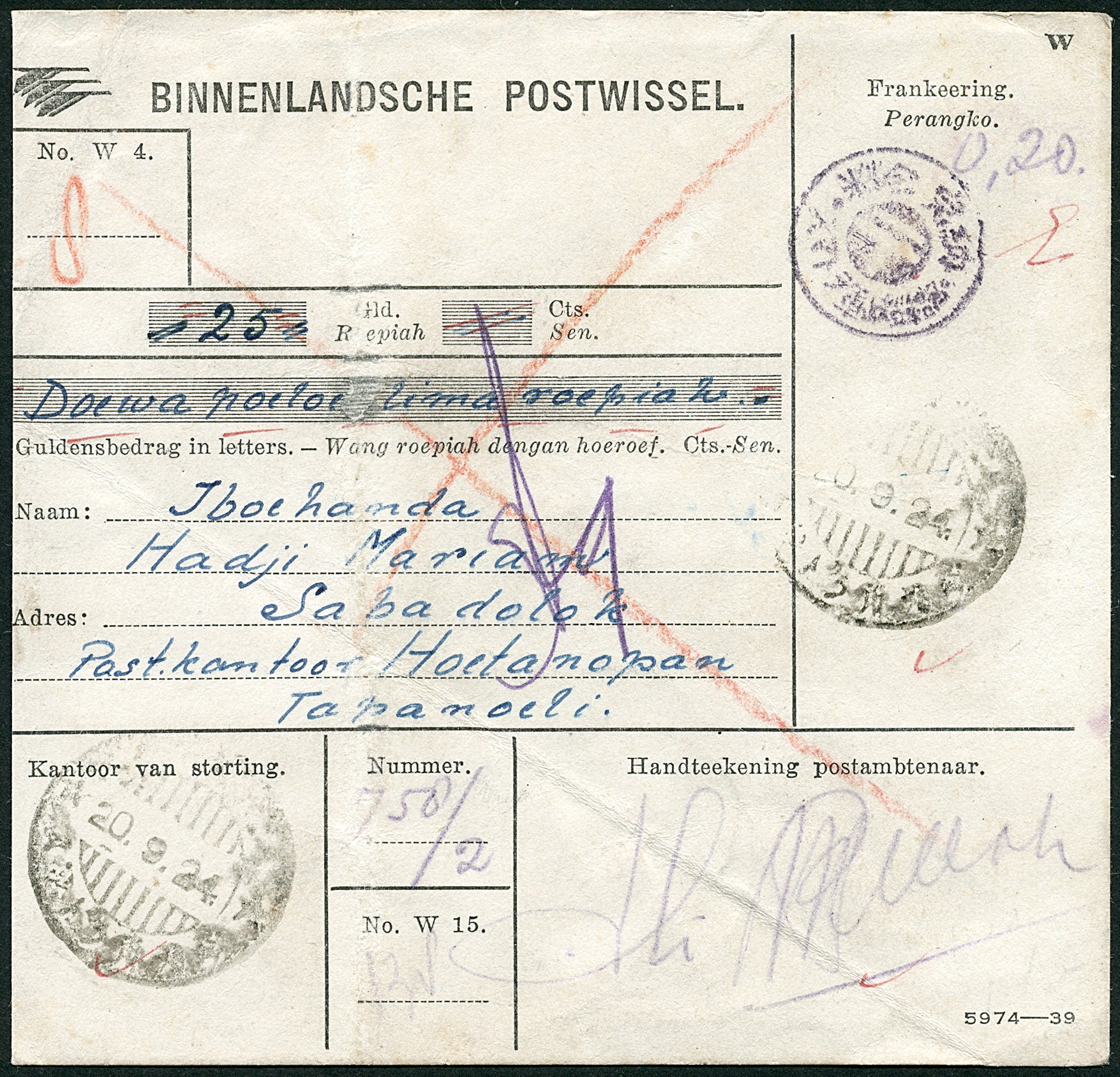 Written postage ´0,20´ on money order Bu.RF31a (creases) with violet T-mark for validity from a post office in North Sumatra (unreadable pmk) on 20.9.24 to Kotanopan 20.9.27. All cds in front and back from the Japanese occupation and using the Japanese showa date
