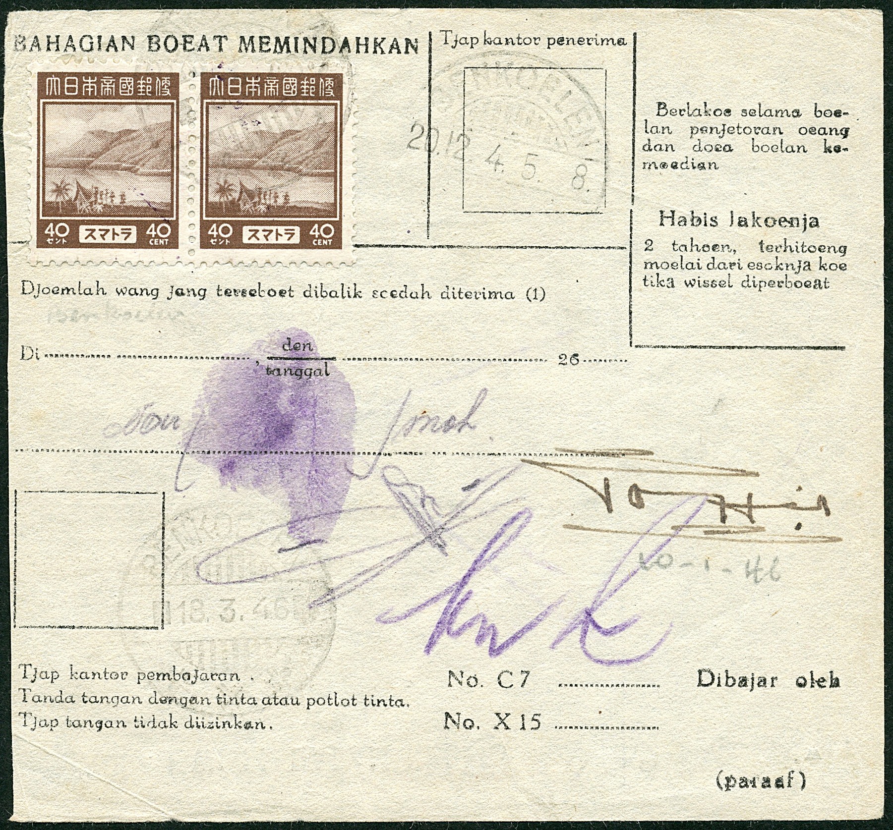 40 Cent definitive issue in pair on the back of money order Bu.RF33 locally used in Benkoelen 15.12.45, paid on 18.3.46. Delayed payment after two months, fee for keeping the M.O. 80 sen. Illustrated in Bu. postal stationery on page 179