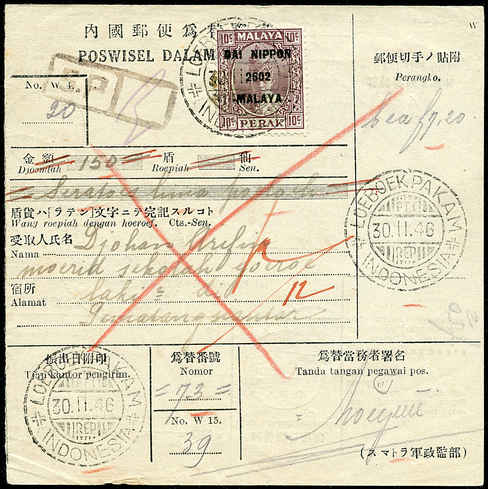 Written ´bea f 7,20´ and 10 cent Malaya with overprint (= additional form price) on money order Bu.RF33 showing censor S.P. in frame (soedah periksa) from Loeboekpakam 30.11.46 to Pematangsiantar 3.12.46. Very rare item in wonderful quality!
