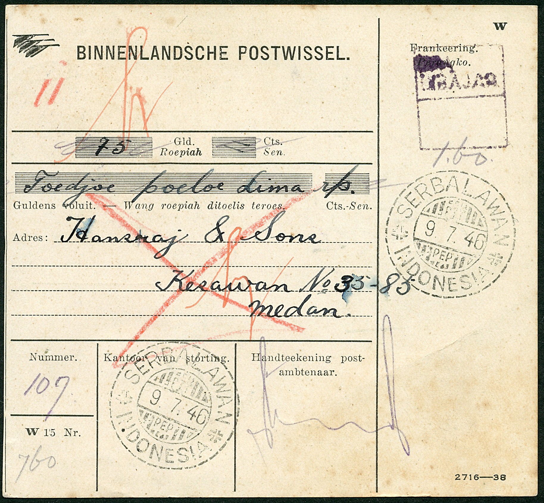 Written ´1.60´ and black Bea Dibajar cachet Bu.RB12 on money order Bu.RF31 from Serbalawan 9.7.46 to Medan 13.7.46