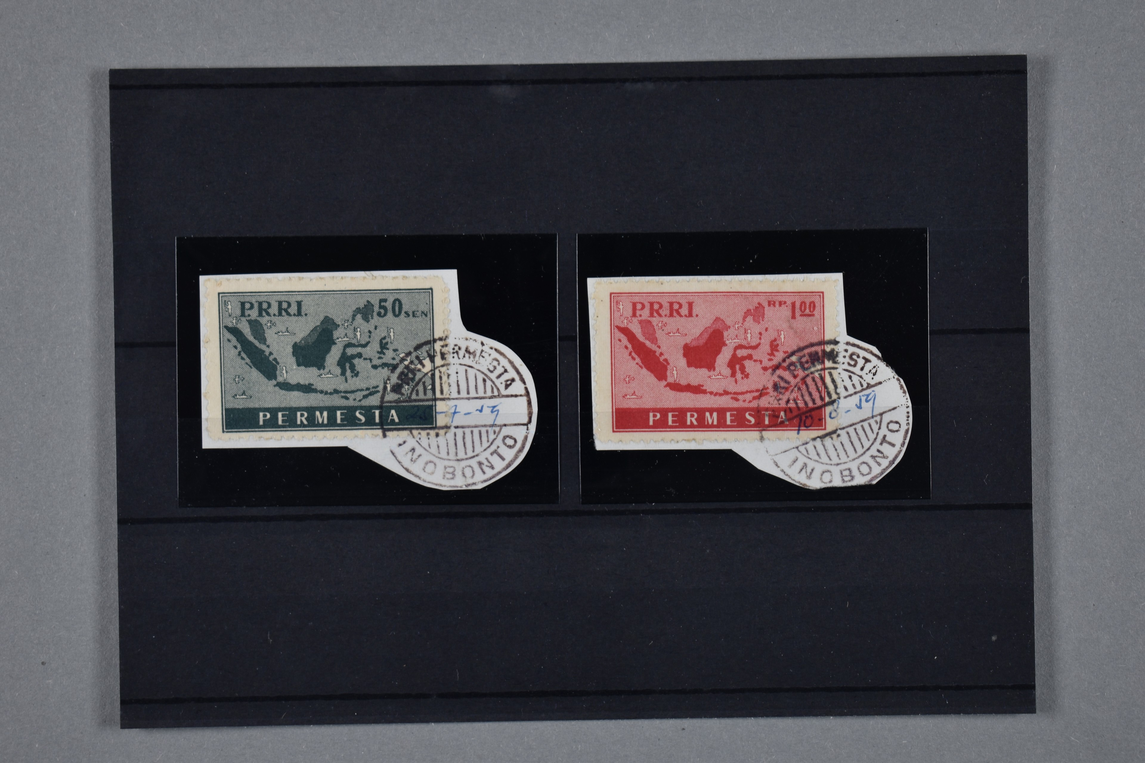 Indonesia. PERMESTA. Regular stamps of 50 sen green and 1 rupiah red on piece, cancelled PRRI PERMESTA / INOBONTO with written dates 25-7-59 respectively 10-8-59