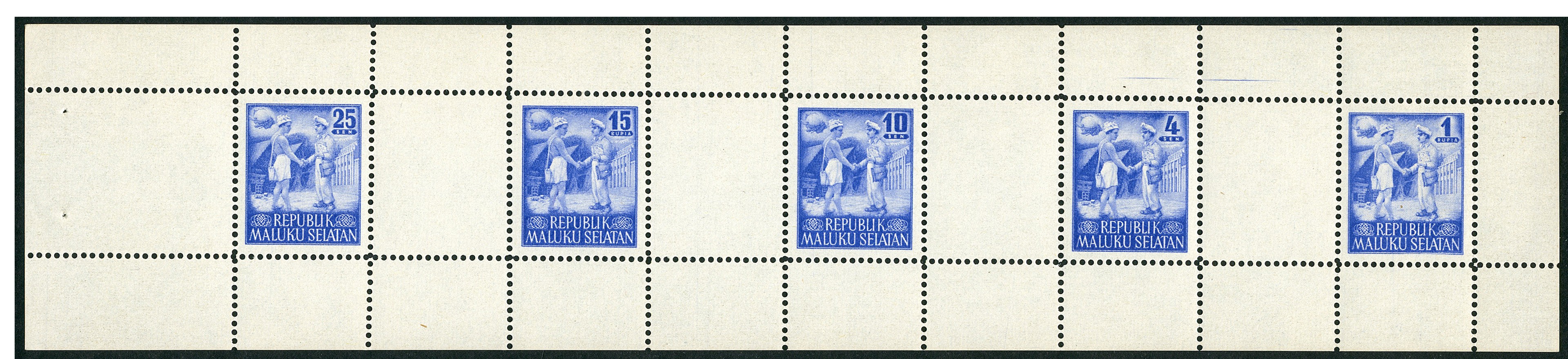 Vienna Printings. RMS. One year postal service 1951, blue. Two strips of five with gutters of the Series (50 sen, 25 sen, 10 sen, 4 sen and 1 rupiah and in the same colour a proof (25 sen, 15 rupia, 10 sen, 4 sen and 1 rupia, taken out of a booklet, on the left side staples holes