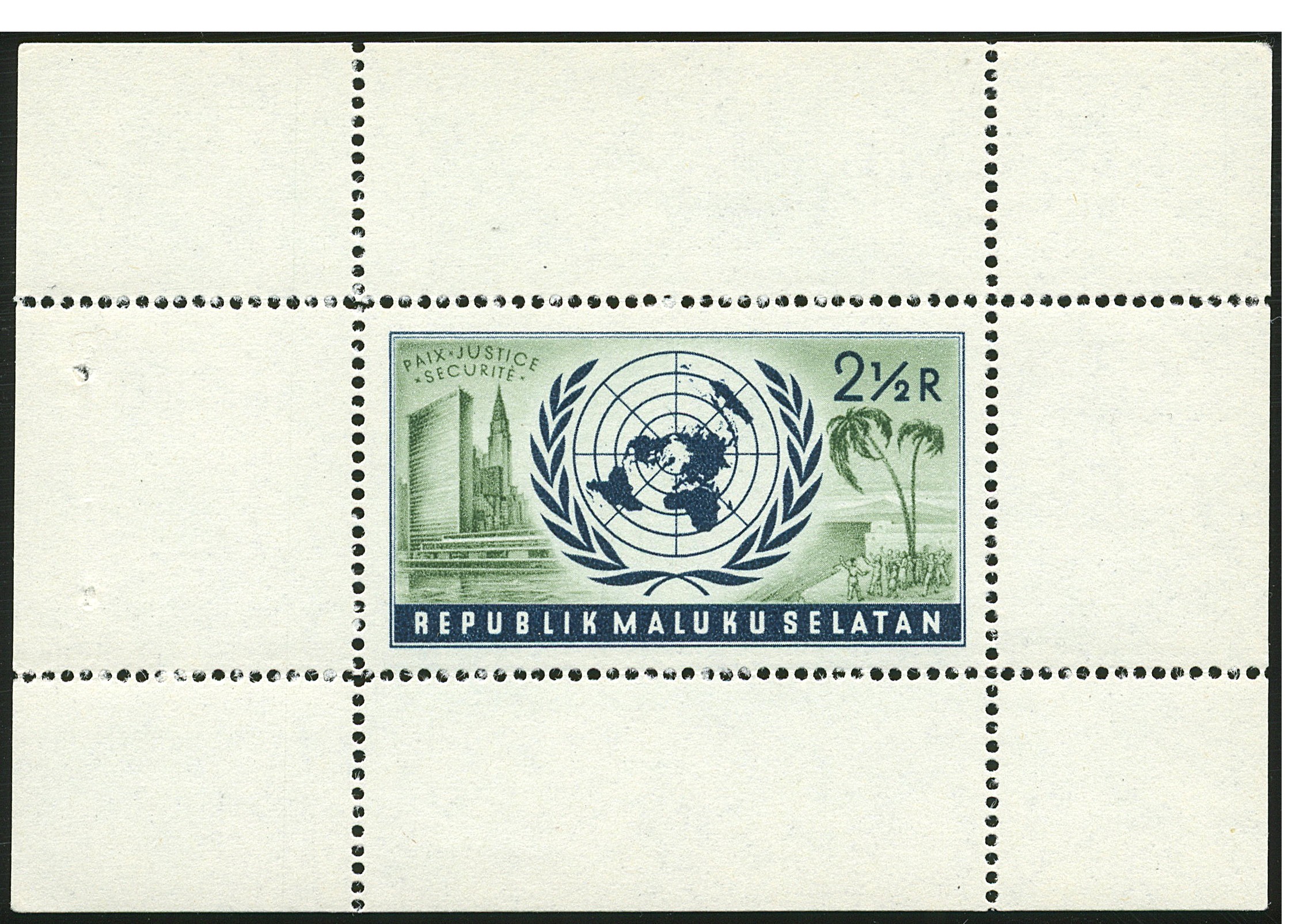 Vienna Printings. RMS. United Nations 1951. Final proof in green and blue for the 2½ rupiah in miniature sheet, taken out of a booklet with on the left side staples holes