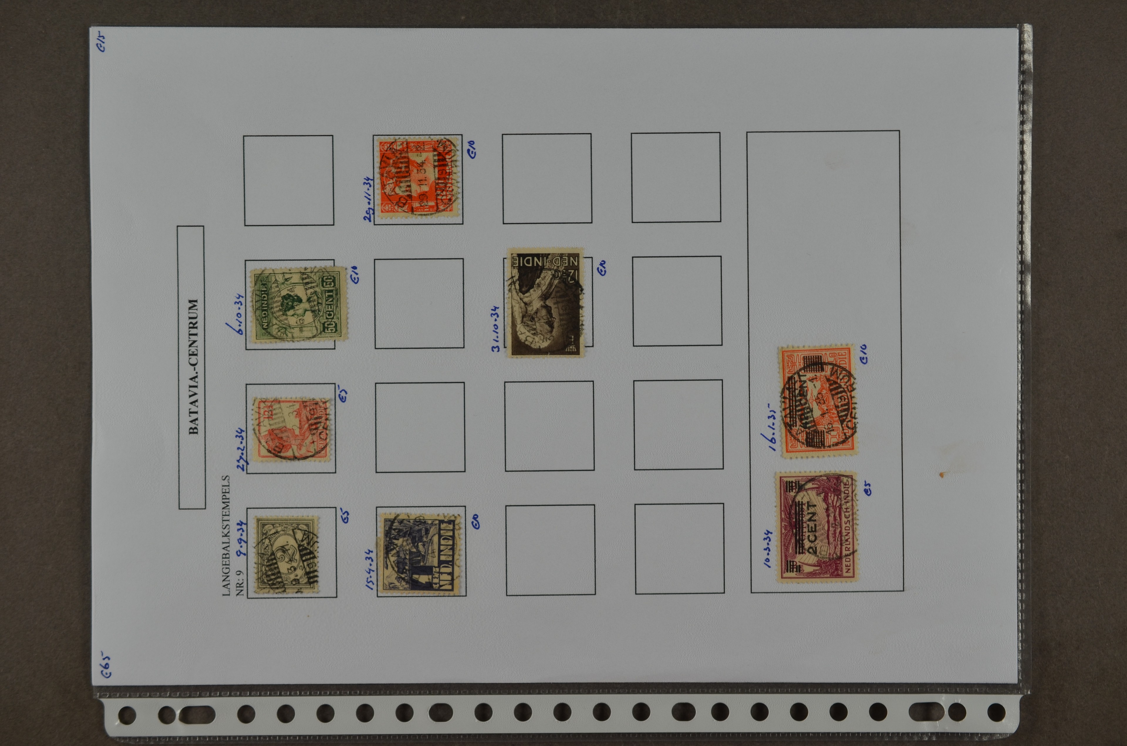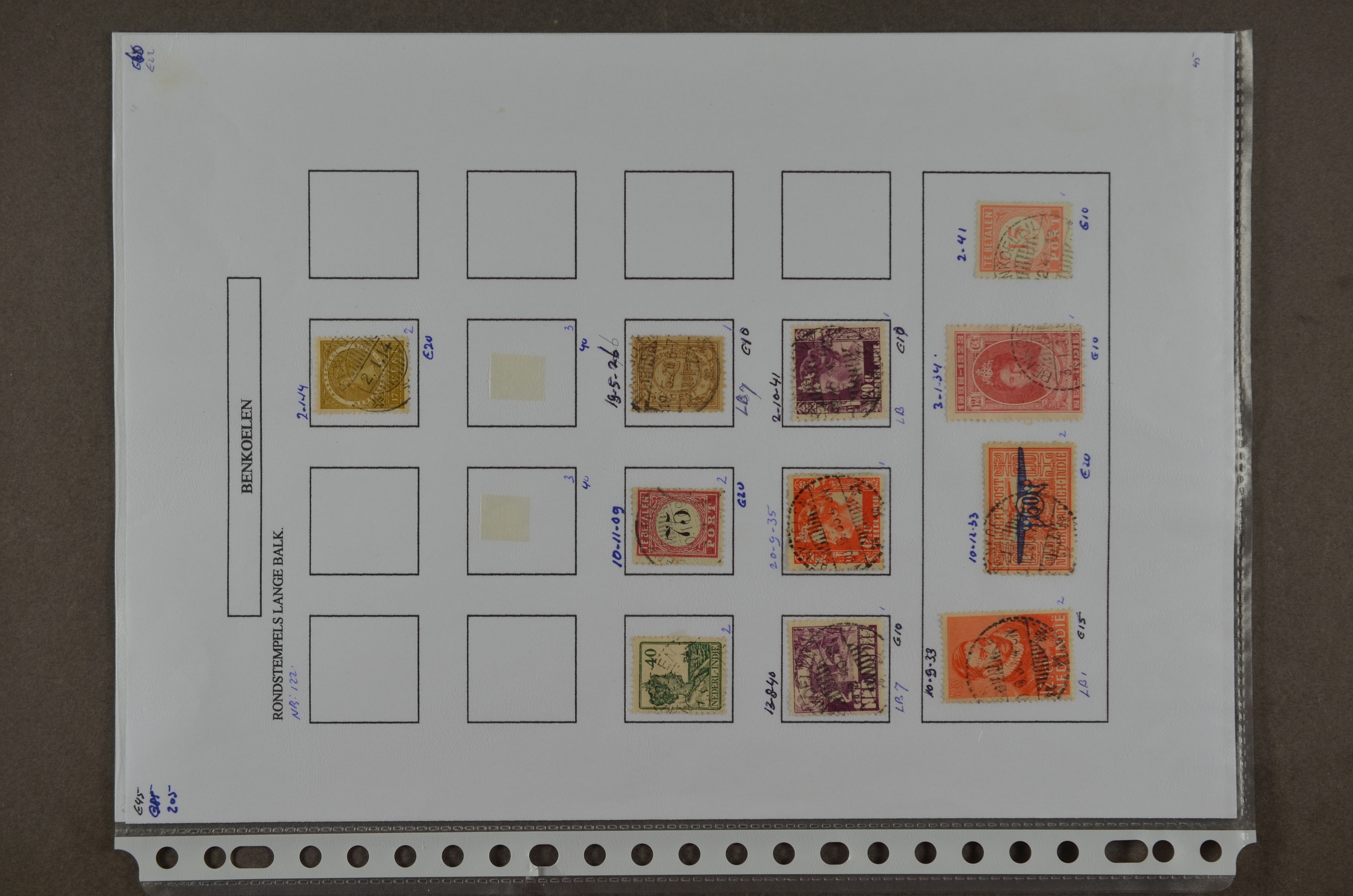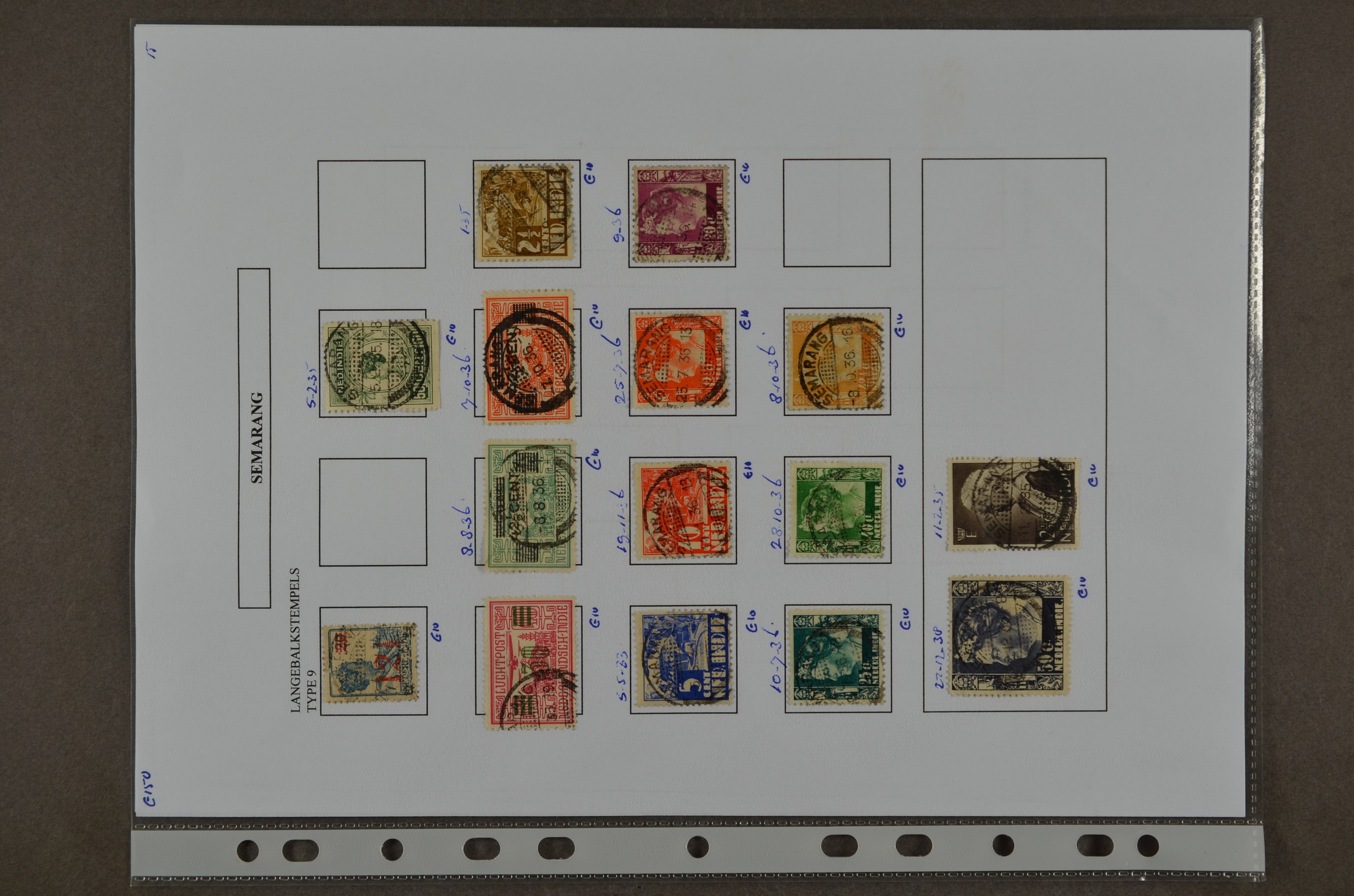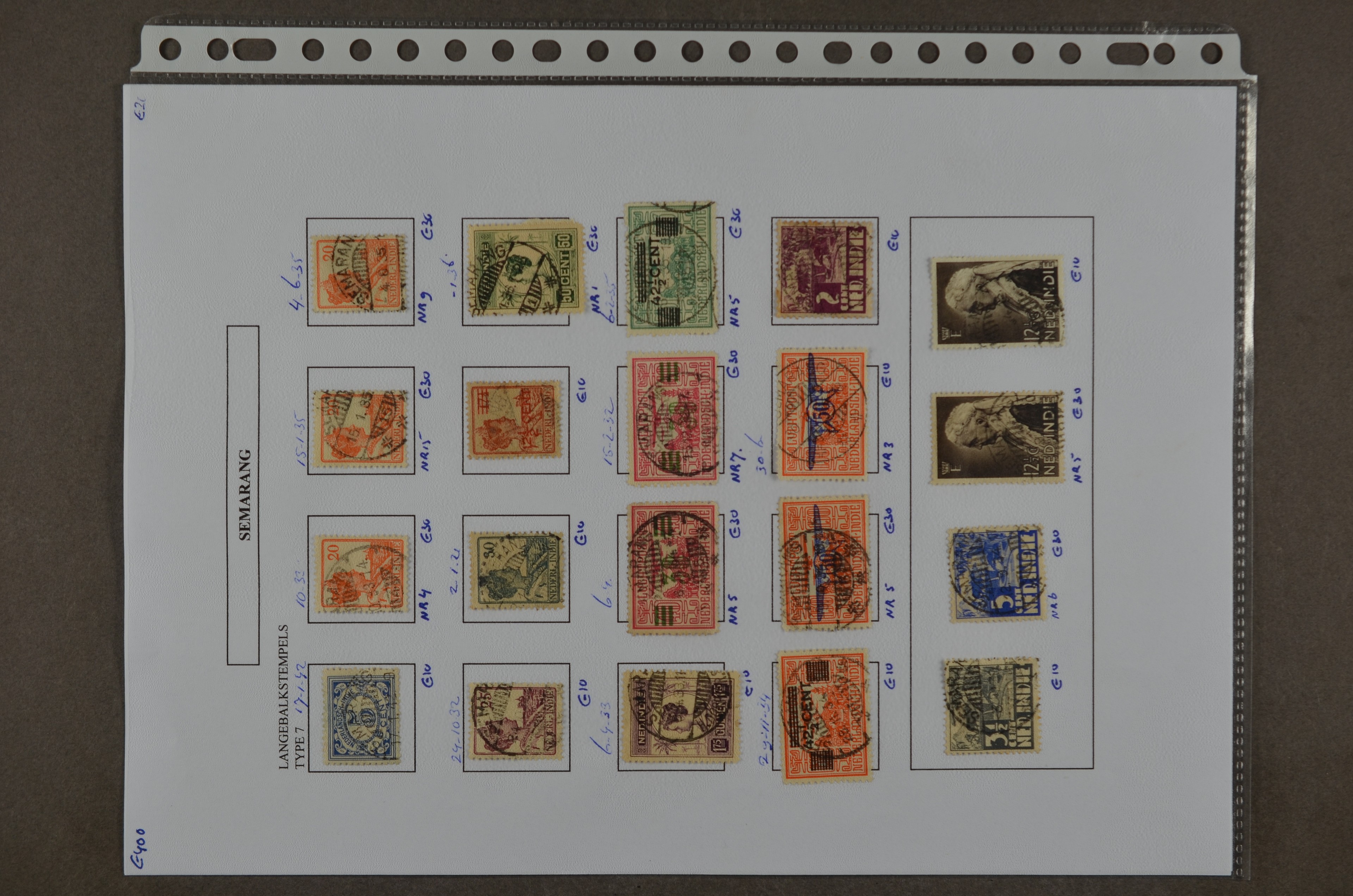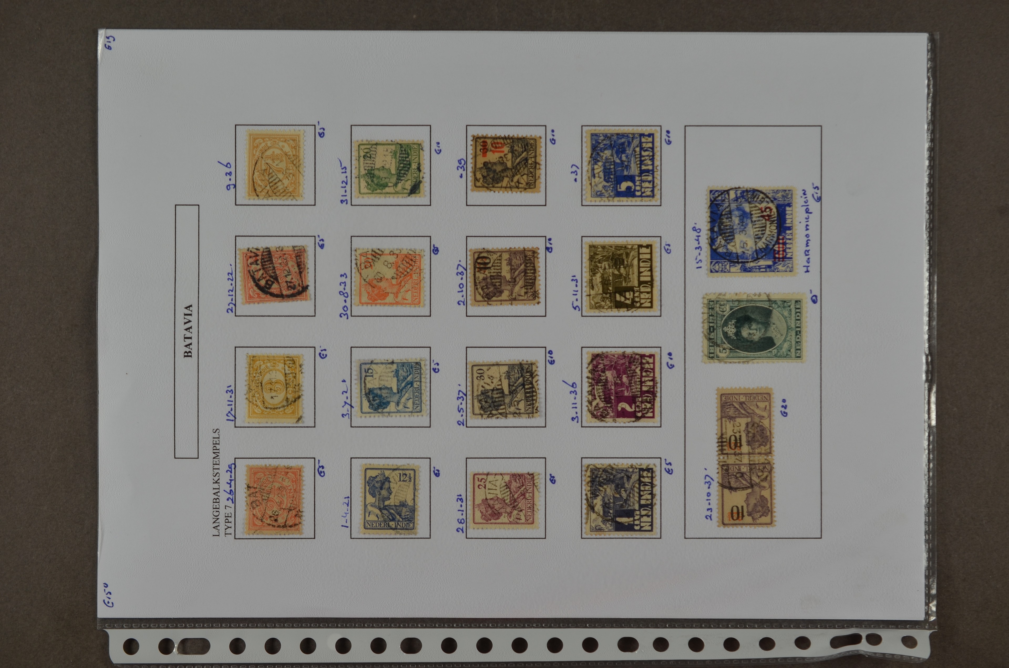 NED.- INDIË Langebalkstempels vanaf 1917, uitgebreide collectie met meerdere schaarse kantoren, verschillende typen per kantoor, veel mooie afstempelingen, ook andere typen als KB, PV1, PV2, LBnr, opgezet op bladen (w.o. door verzamelaar diverse foutief genoemde kantoornamen) in 8 ringbanden