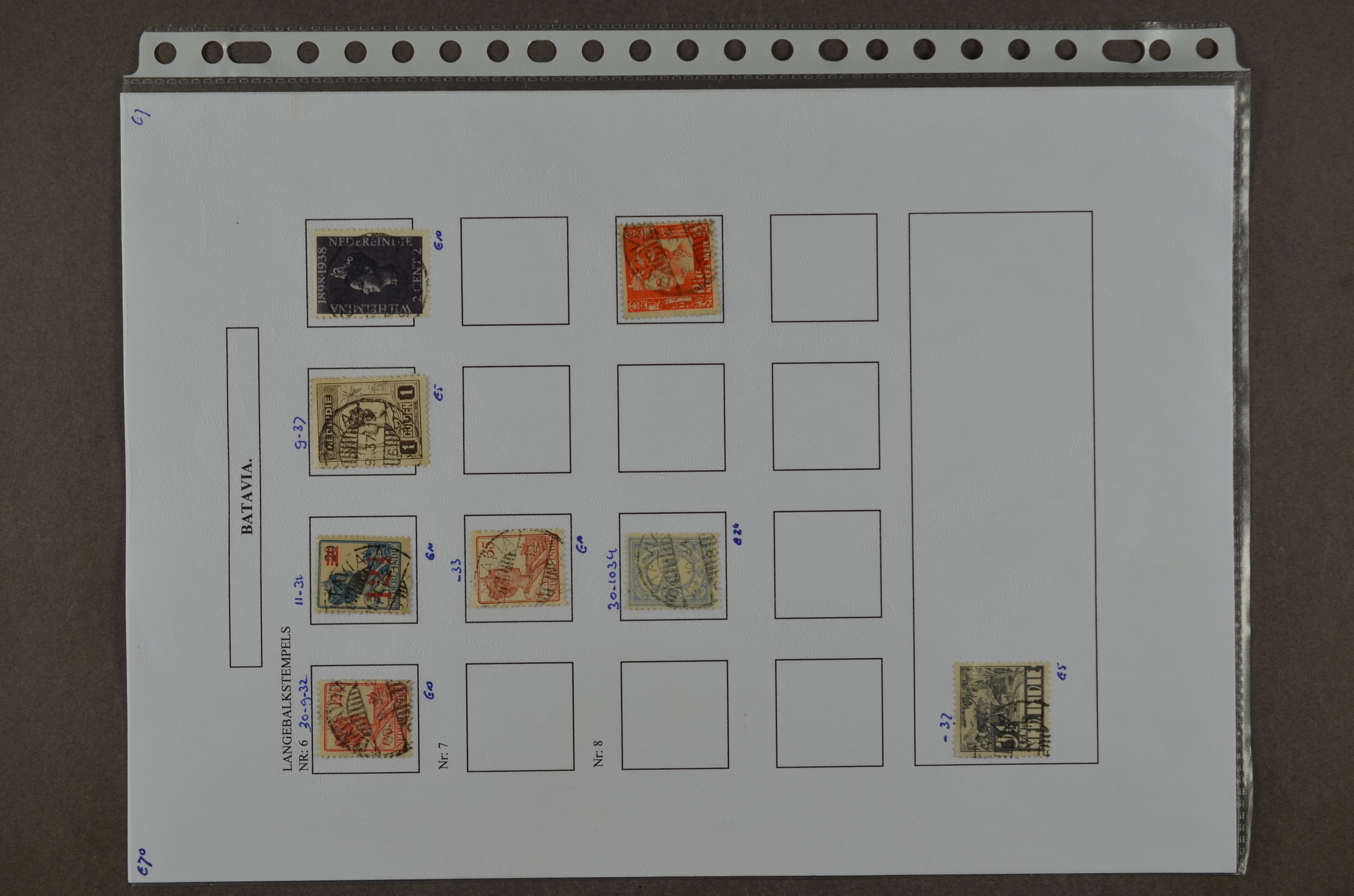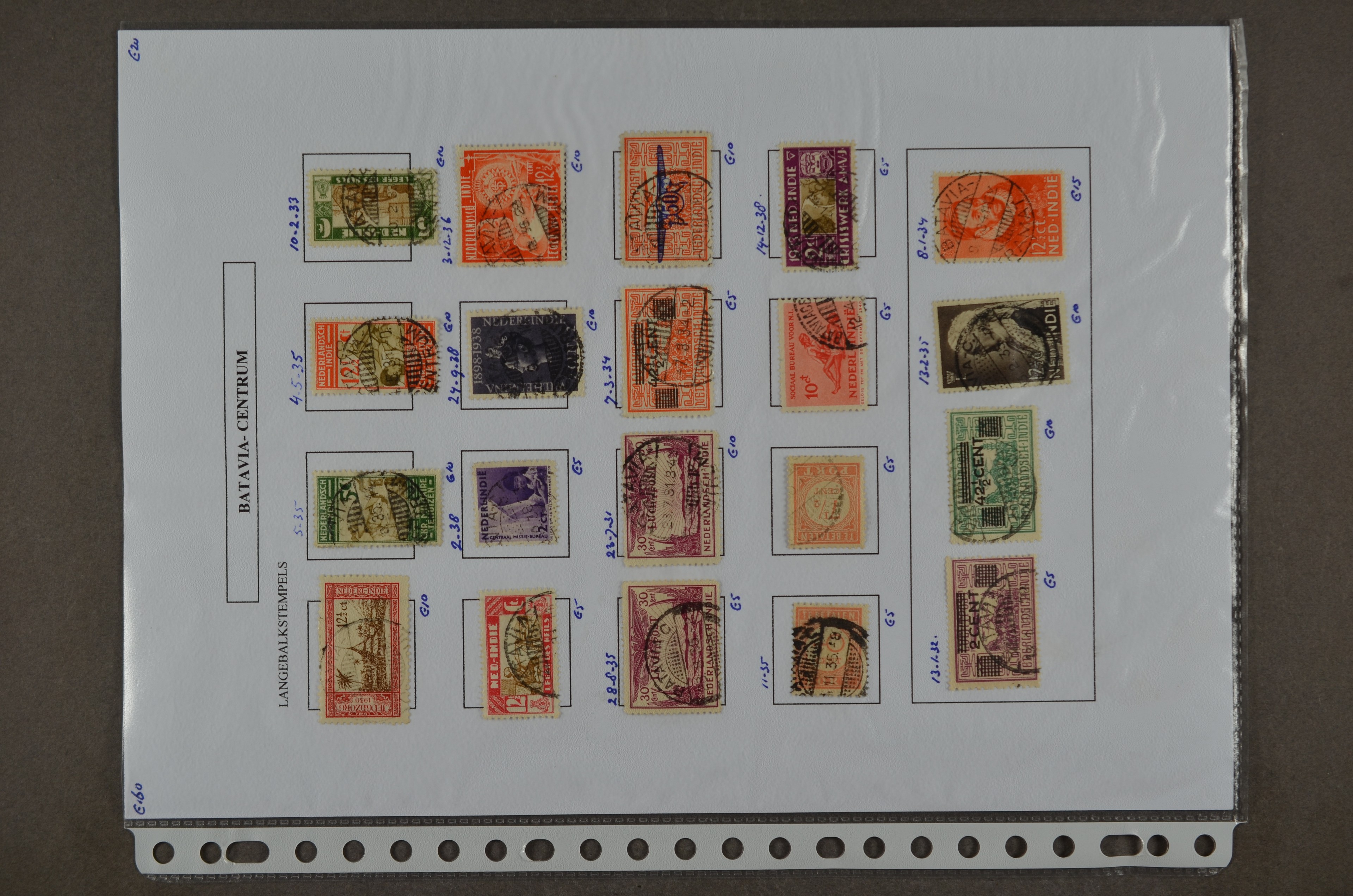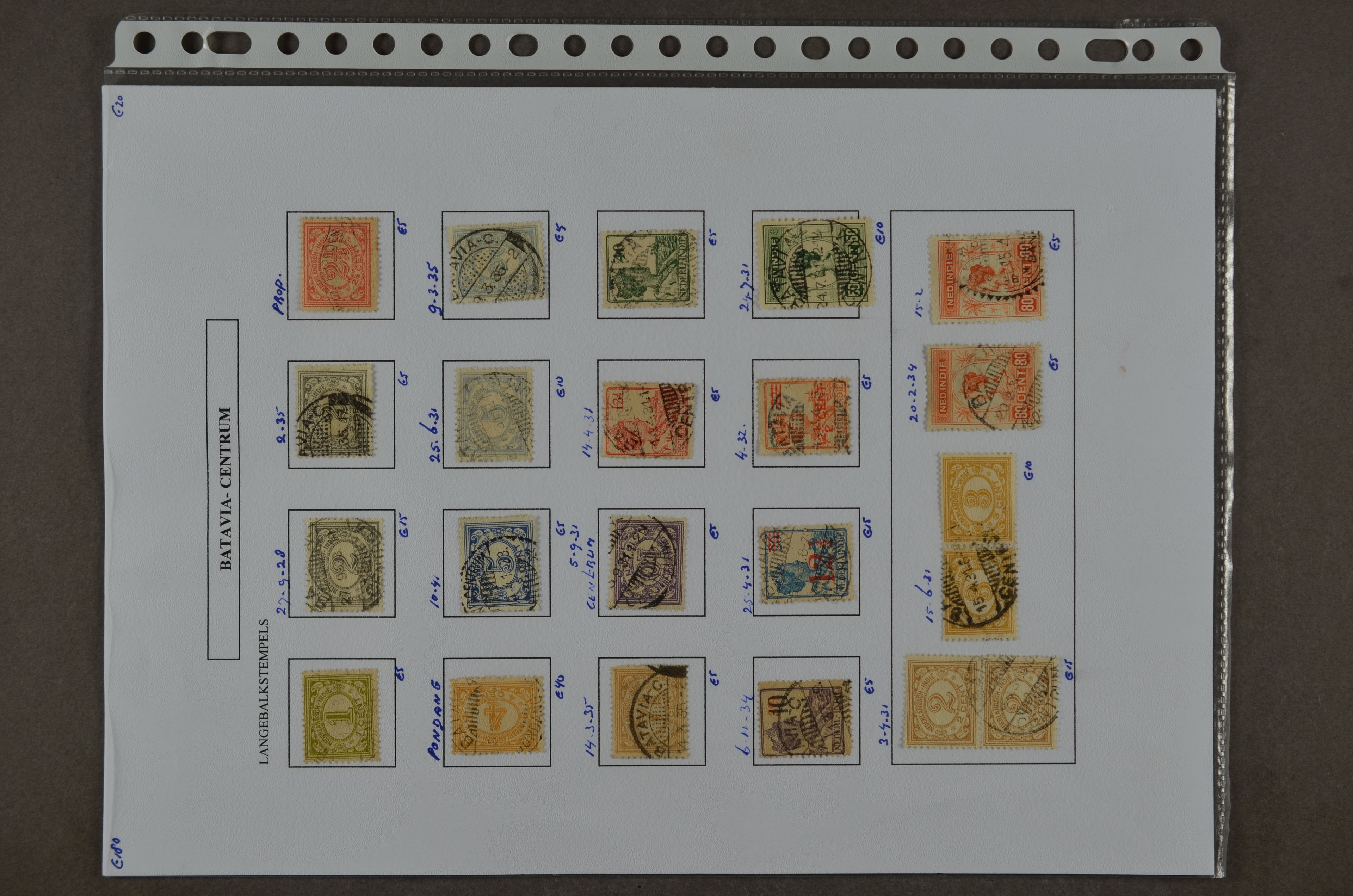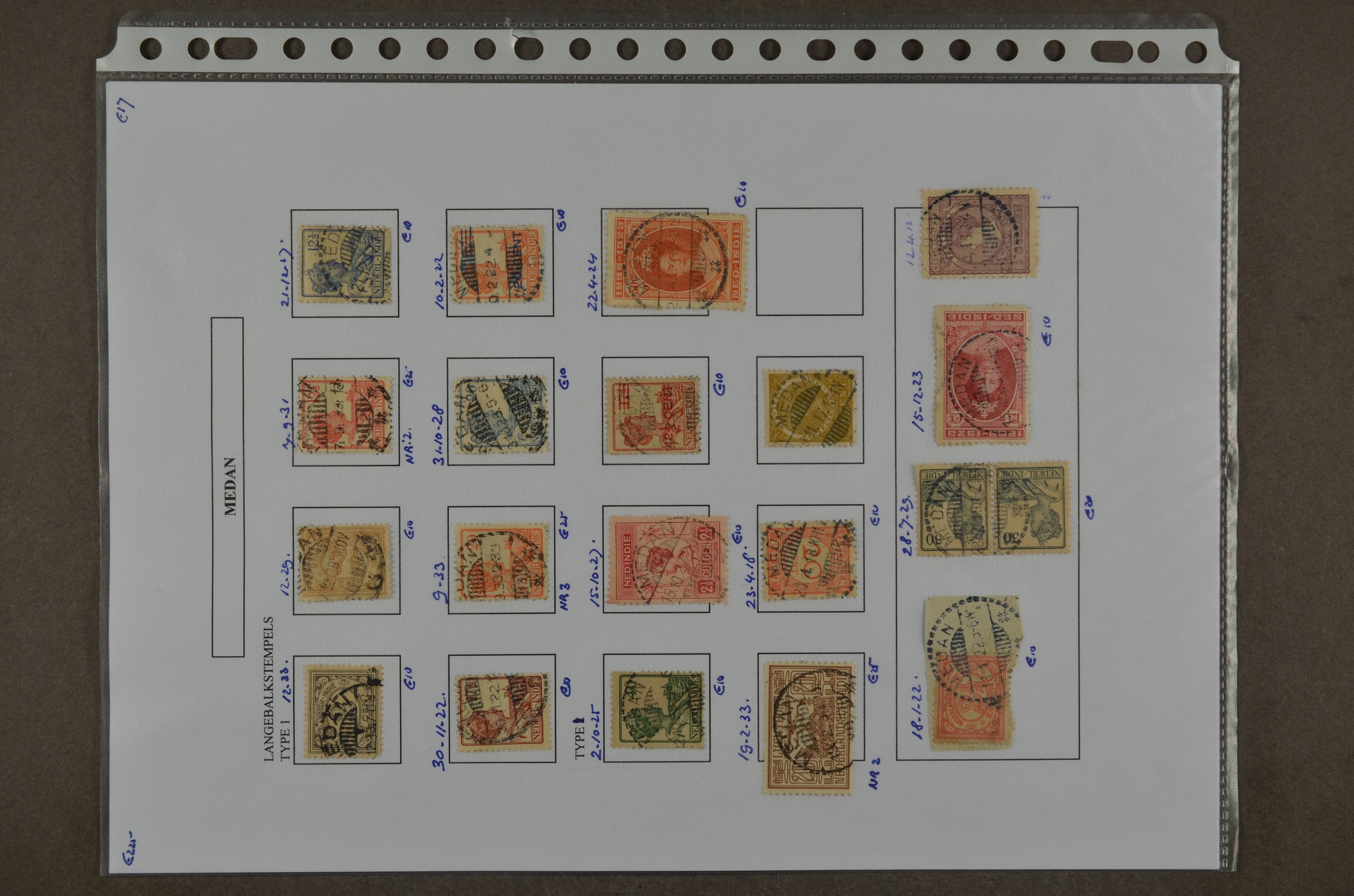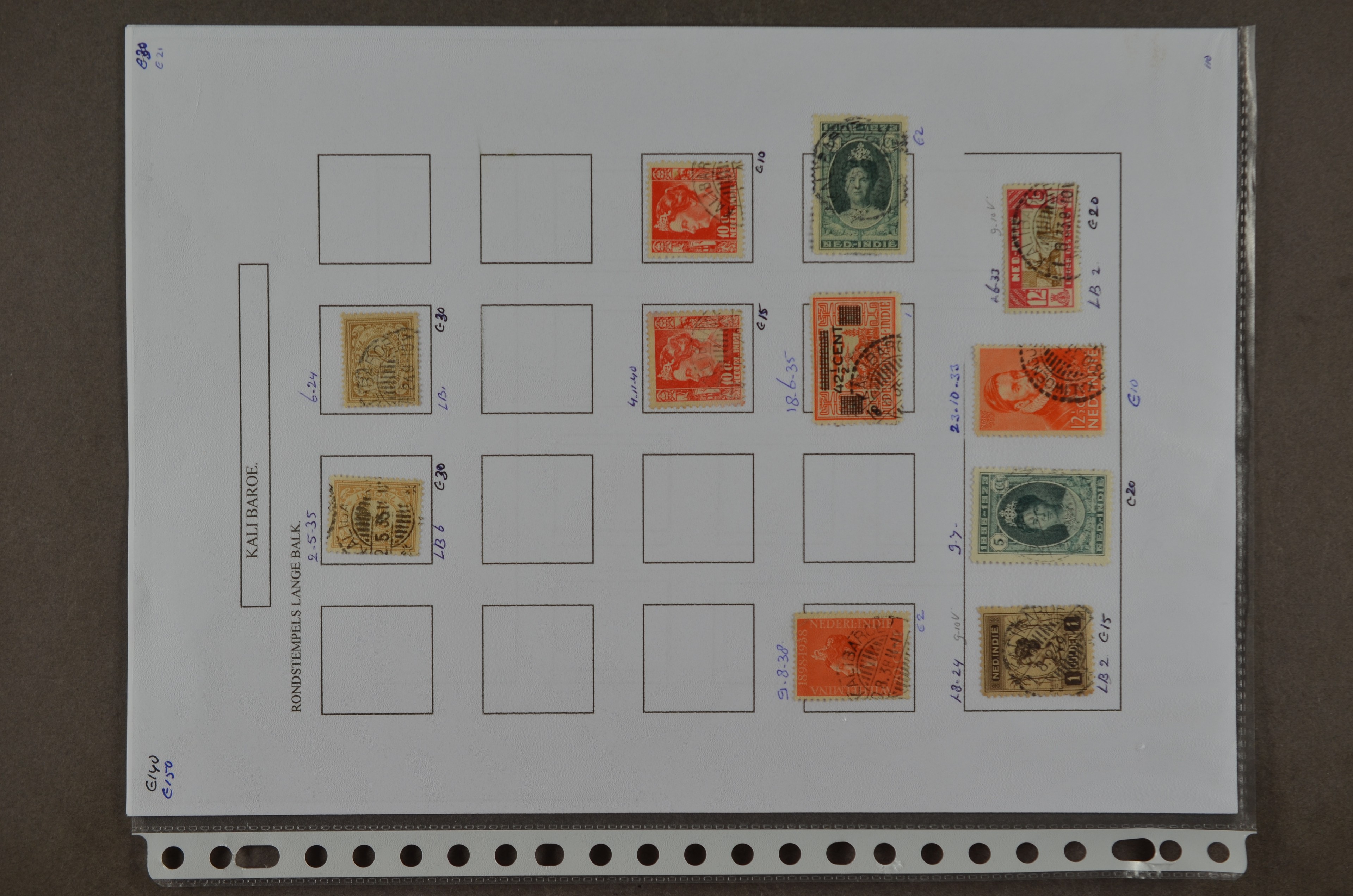 NED.- INDIË Langebalkstempels vanaf 1917, uitgebreide collectie met meerdere schaarse kantoren, verschillende typen per kantoor, veel mooie afstempelingen, ook andere typen als KB, PV1, PV2, LBnr, opgezet op bladen (w.o. door verzamelaar diverse foutief genoemde kantoornamen) in 8 ringbanden