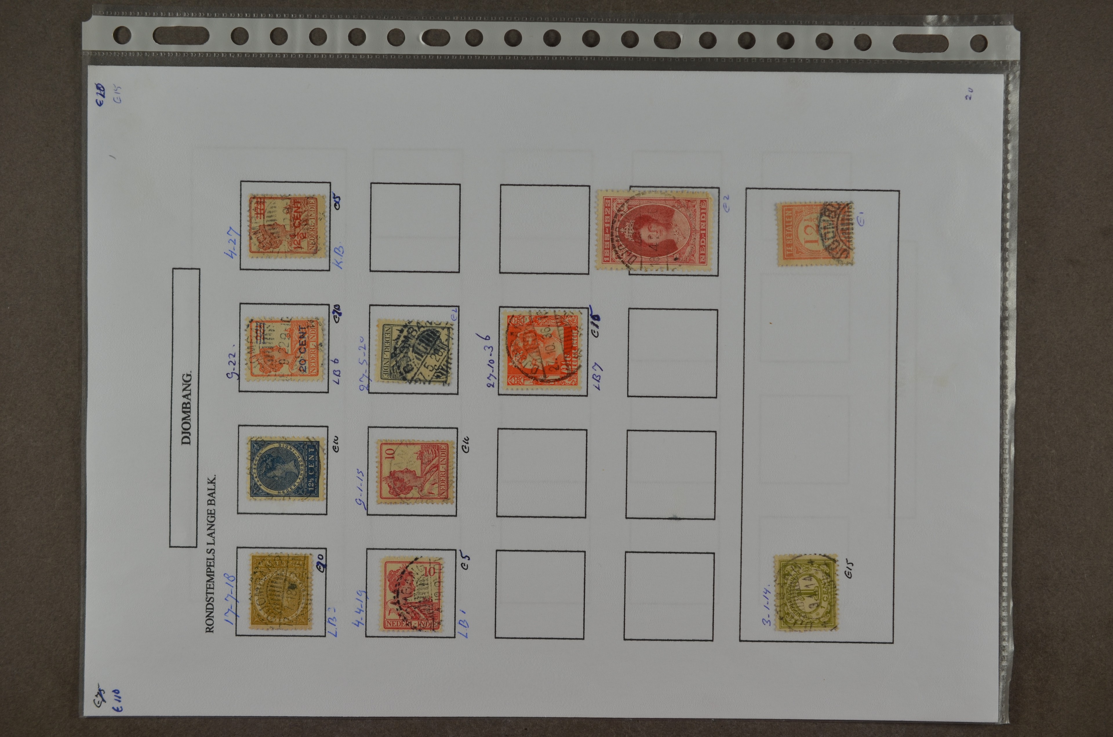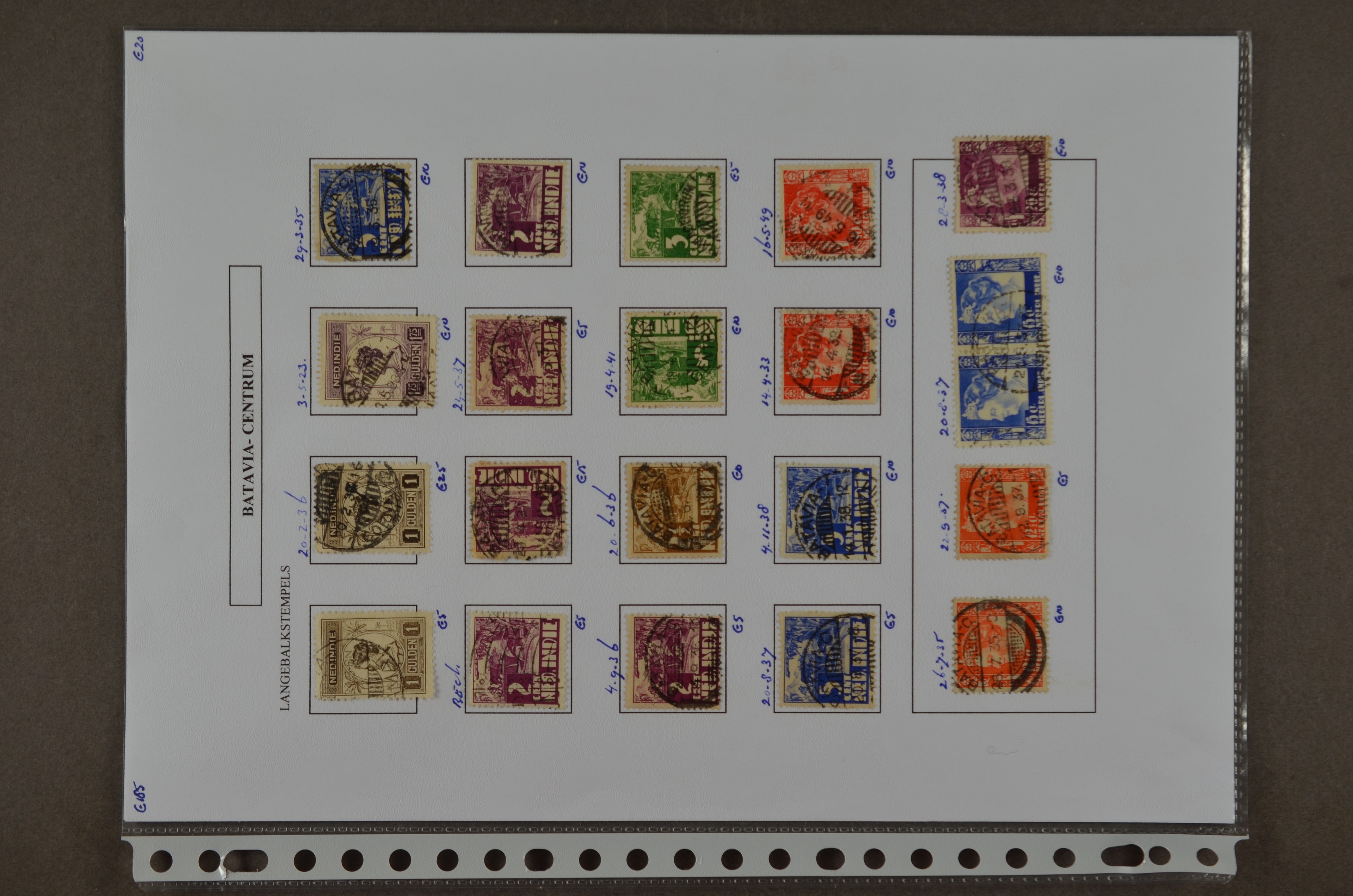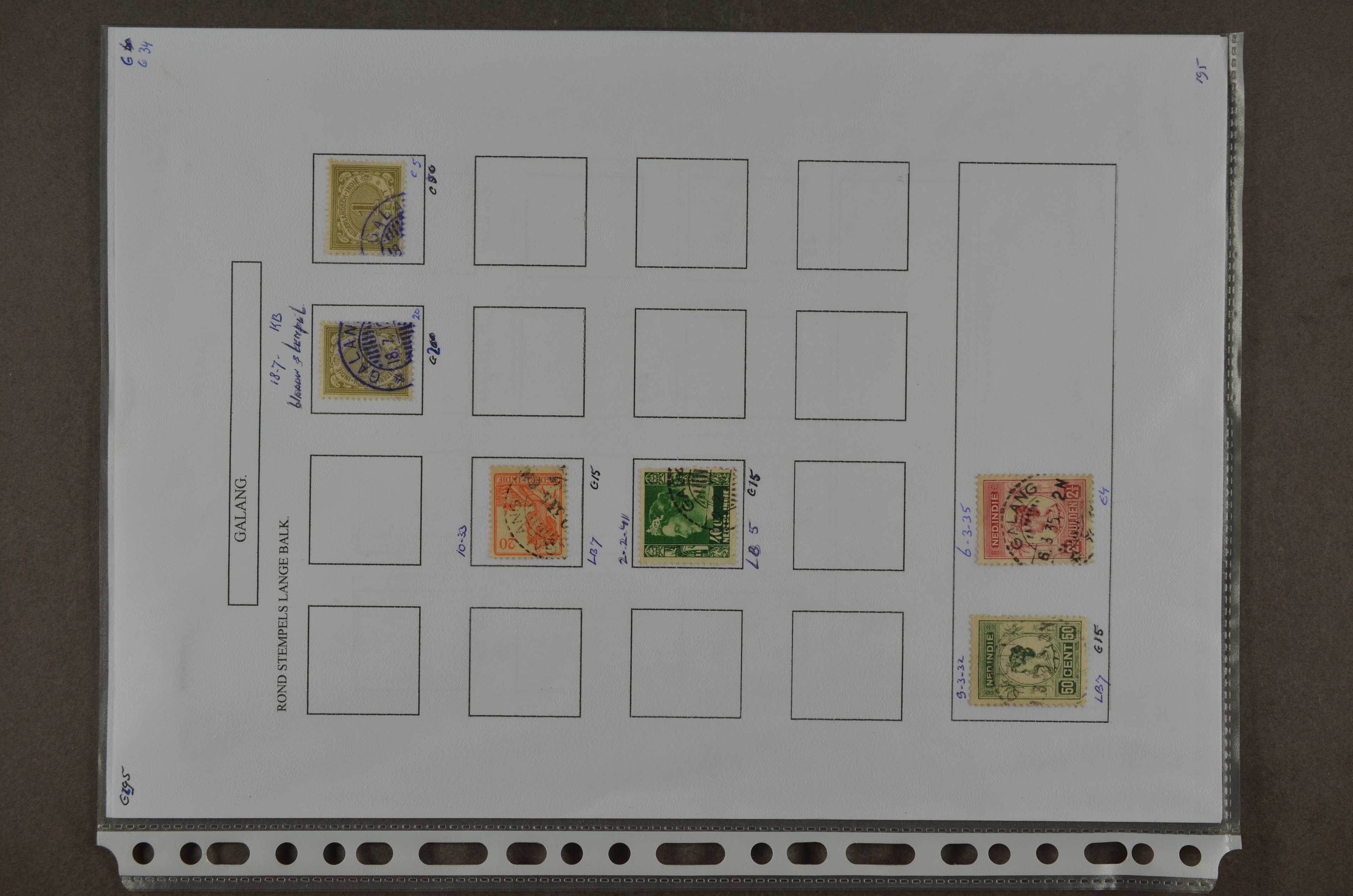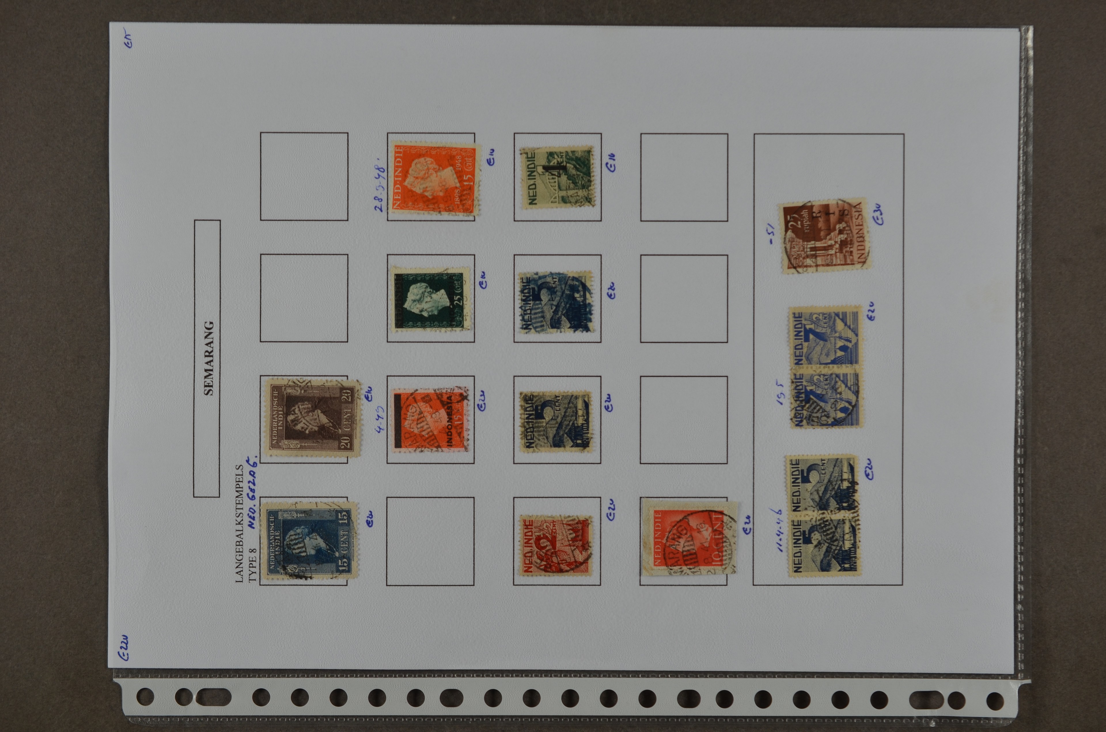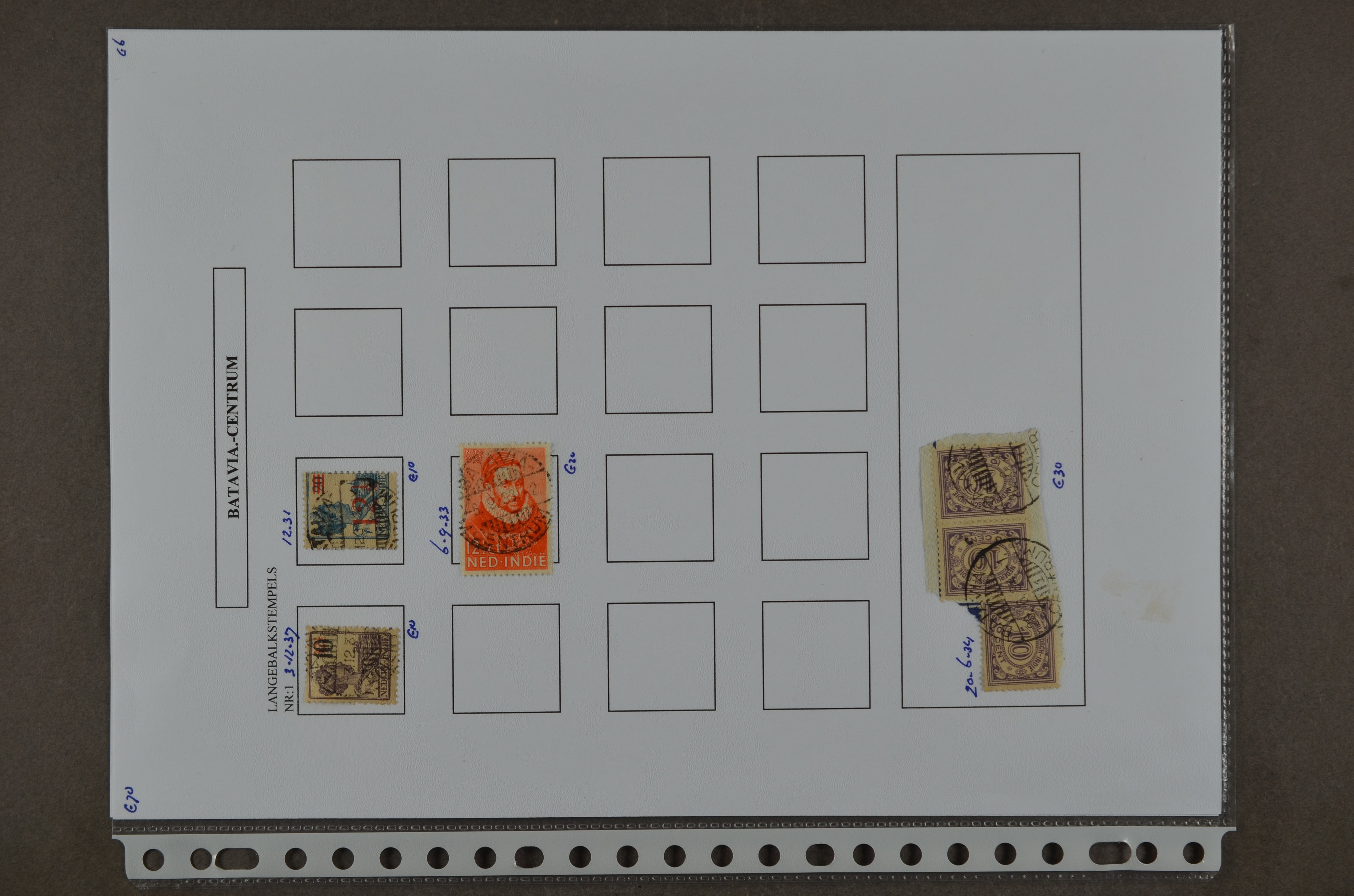 NED.- INDIË Langebalkstempels vanaf 1917, uitgebreide collectie met meerdere schaarse kantoren, verschillende typen per kantoor, veel mooie afstempelingen, ook andere typen als KB, PV1, PV2, LBnr, opgezet op bladen (w.o. door verzamelaar diverse foutief genoemde kantoornamen) in 8 ringbanden
