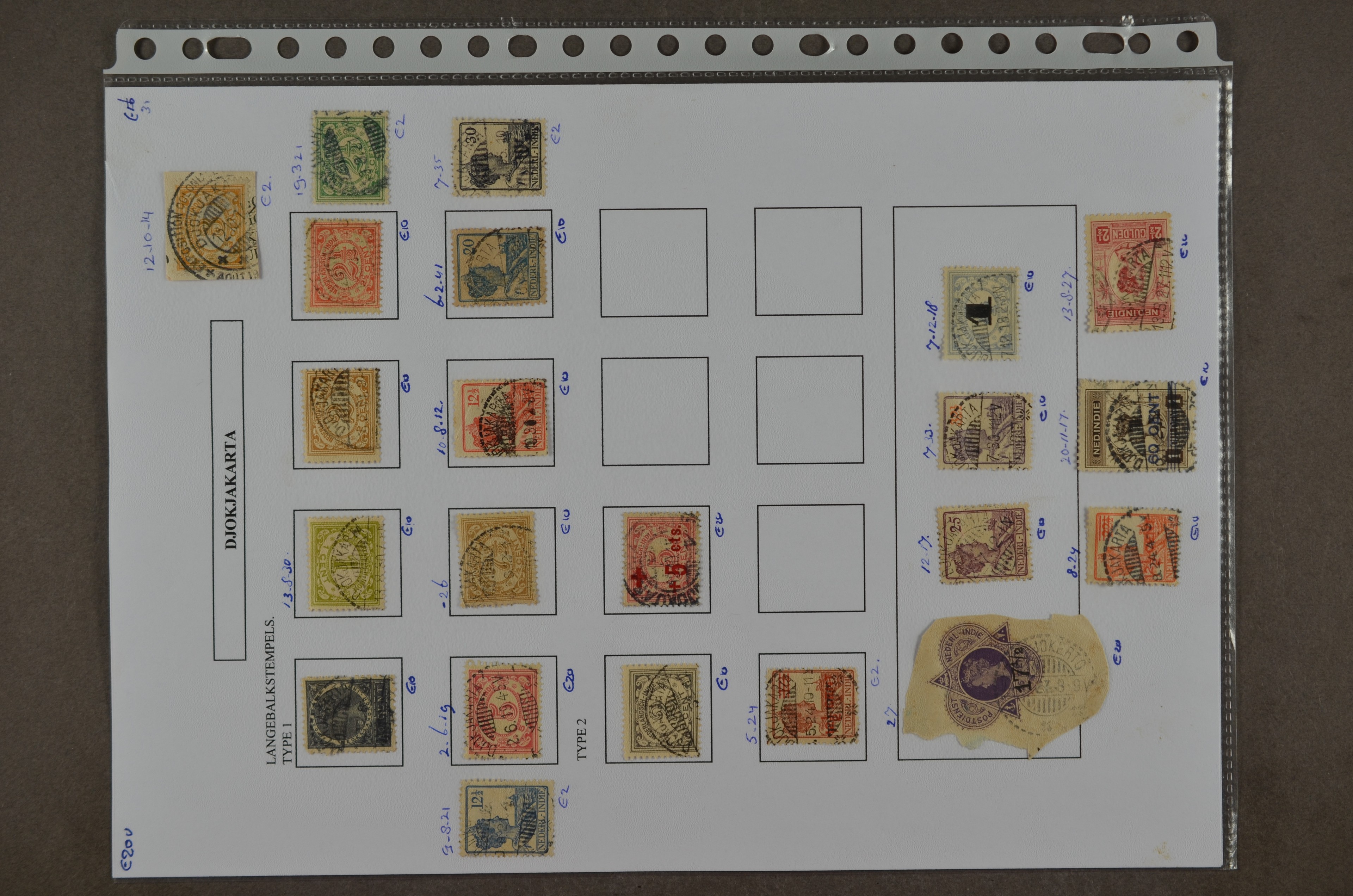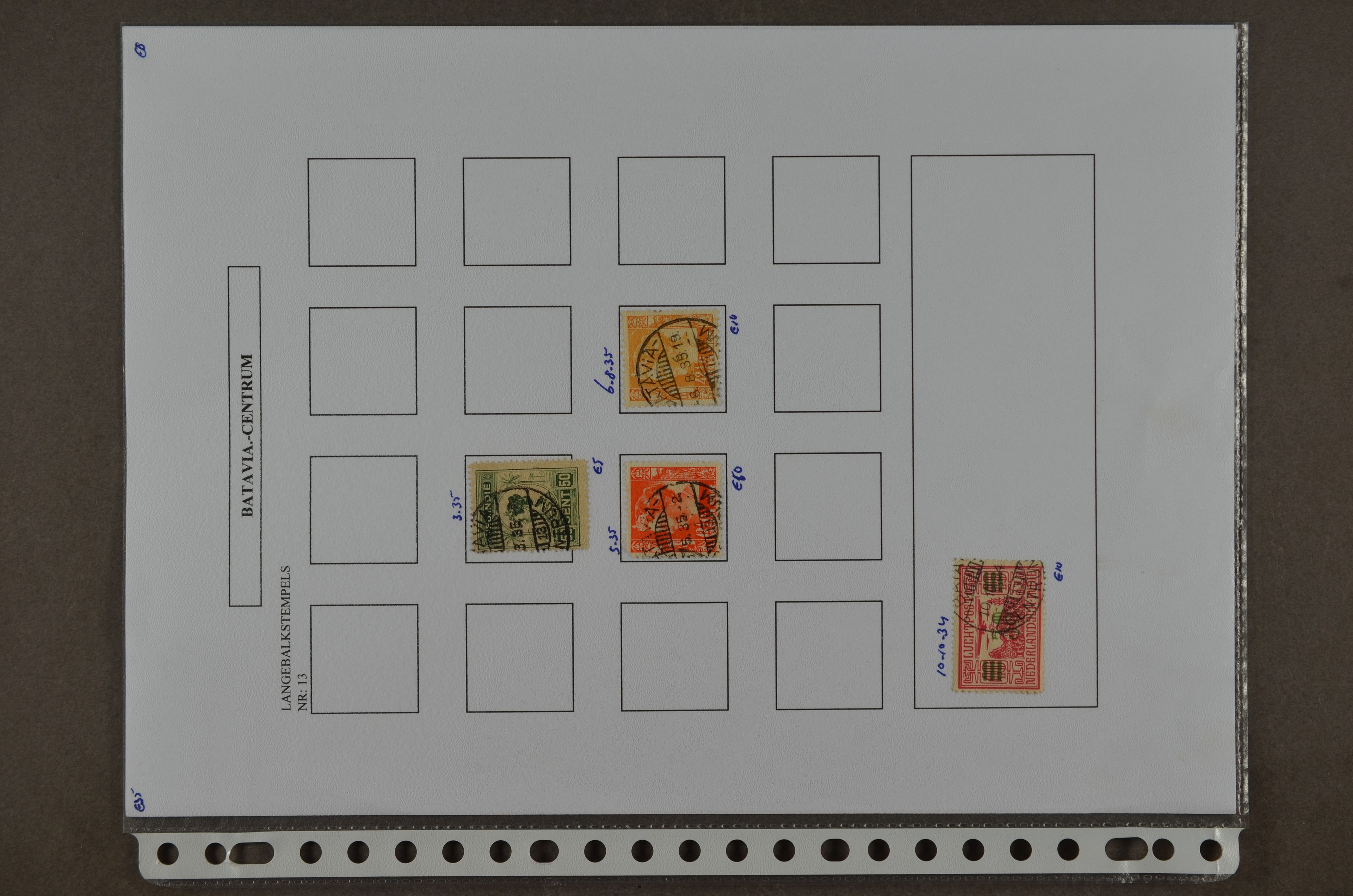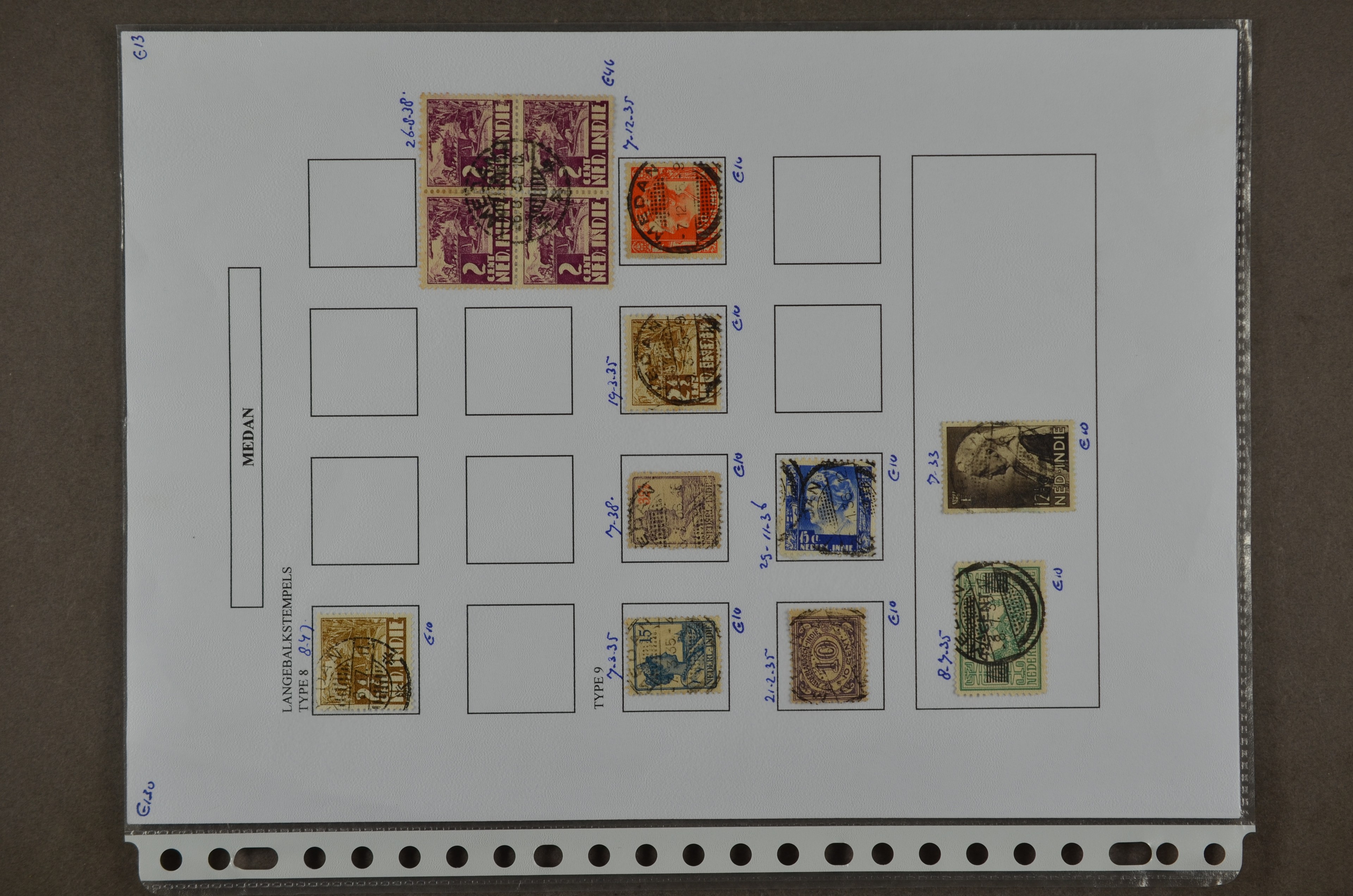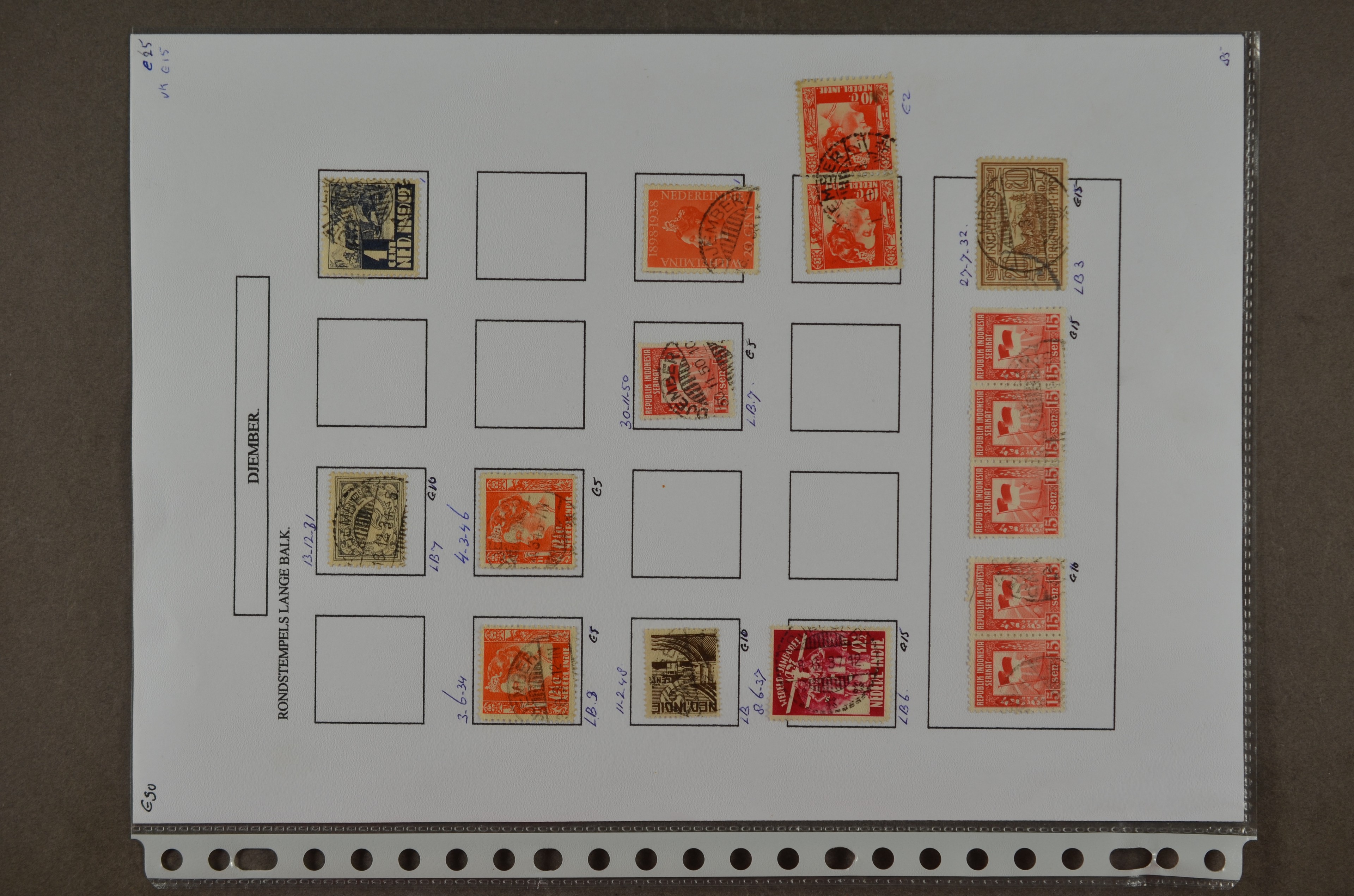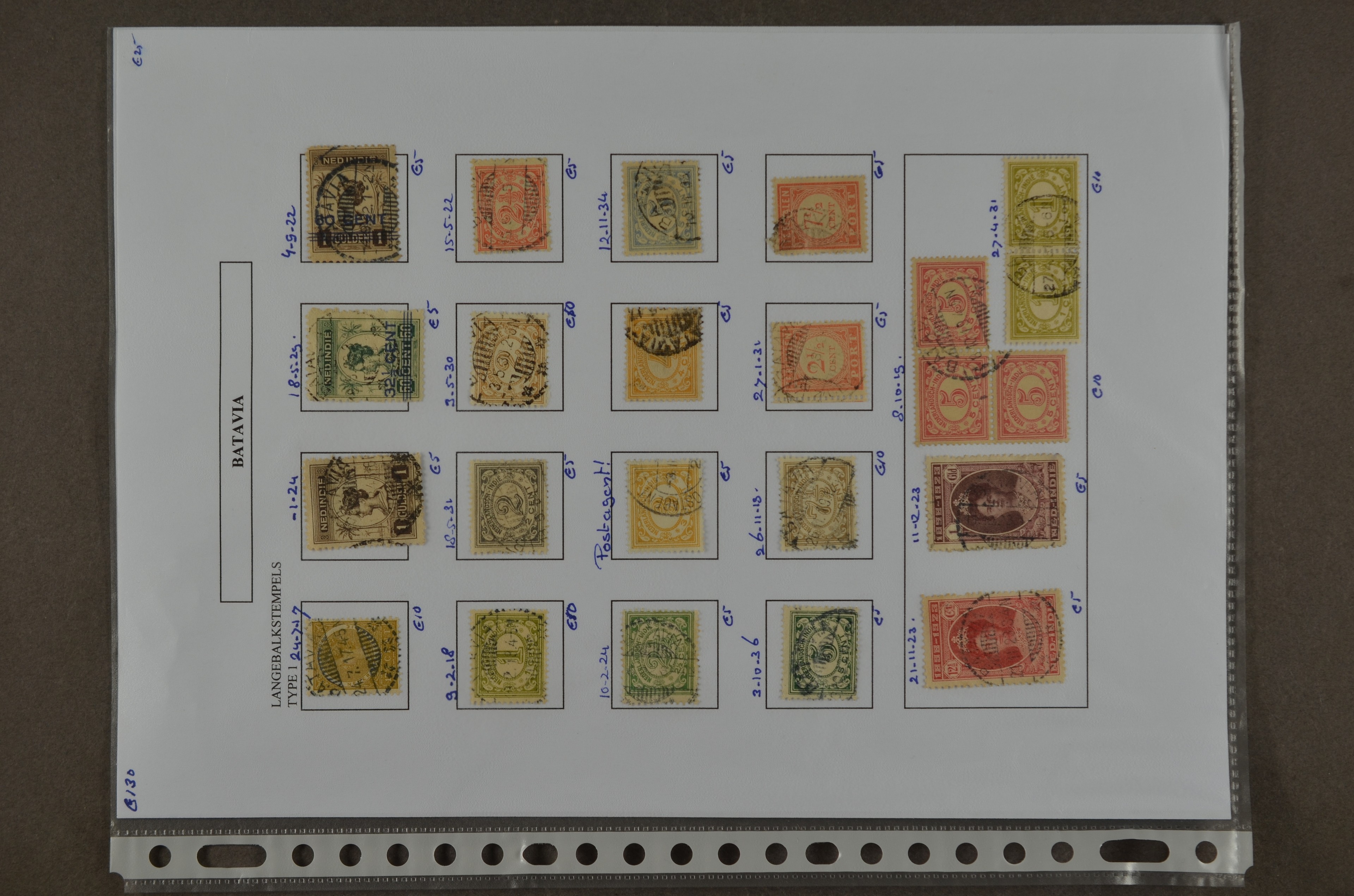 NED.- INDIË Langebalkstempels vanaf 1917, uitgebreide collectie met meerdere schaarse kantoren, verschillende typen per kantoor, veel mooie afstempelingen, ook andere typen als KB, PV1, PV2, LBnr, opgezet op bladen (w.o. door verzamelaar diverse foutief genoemde kantoornamen) in 8 ringbanden
