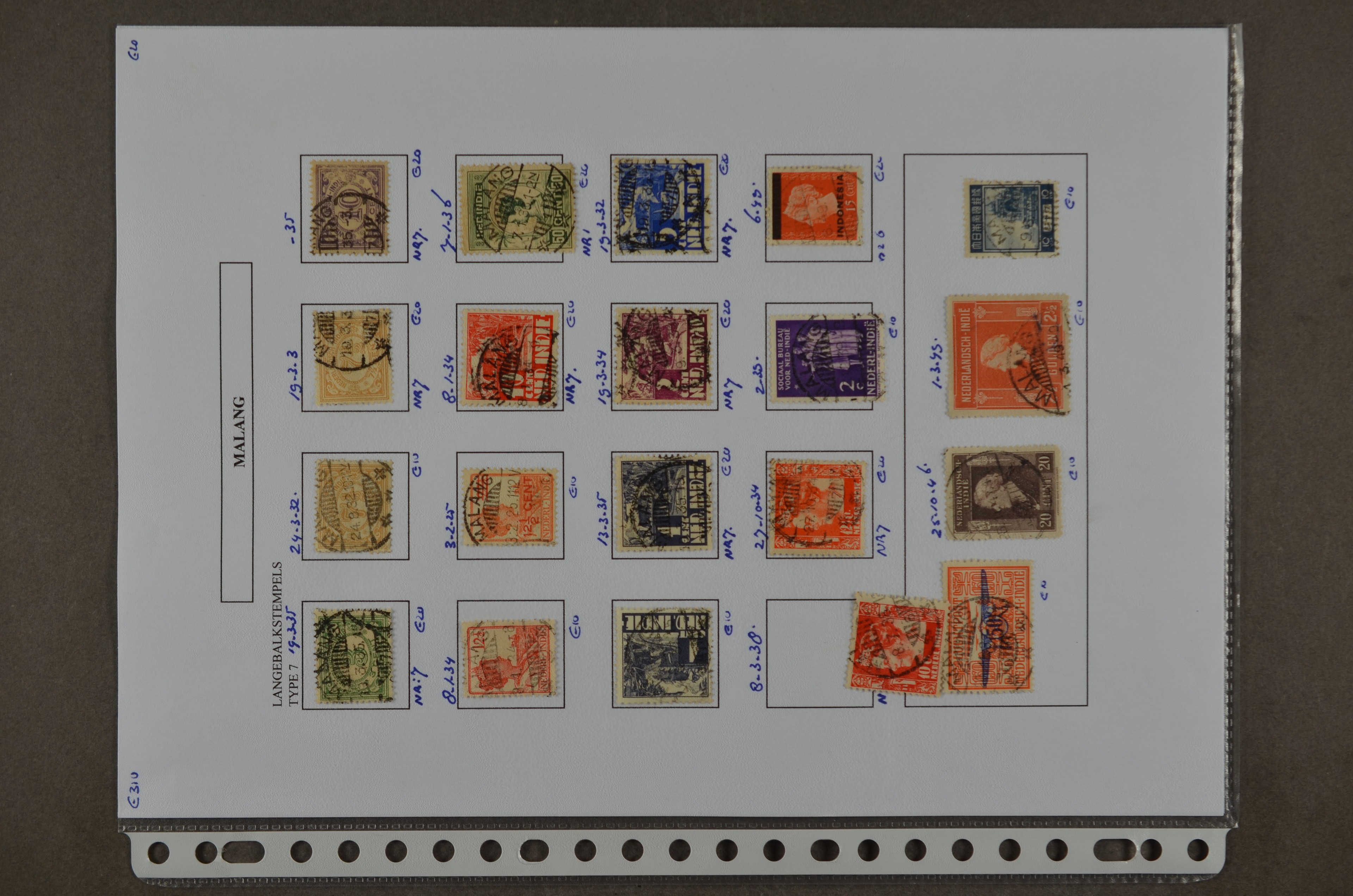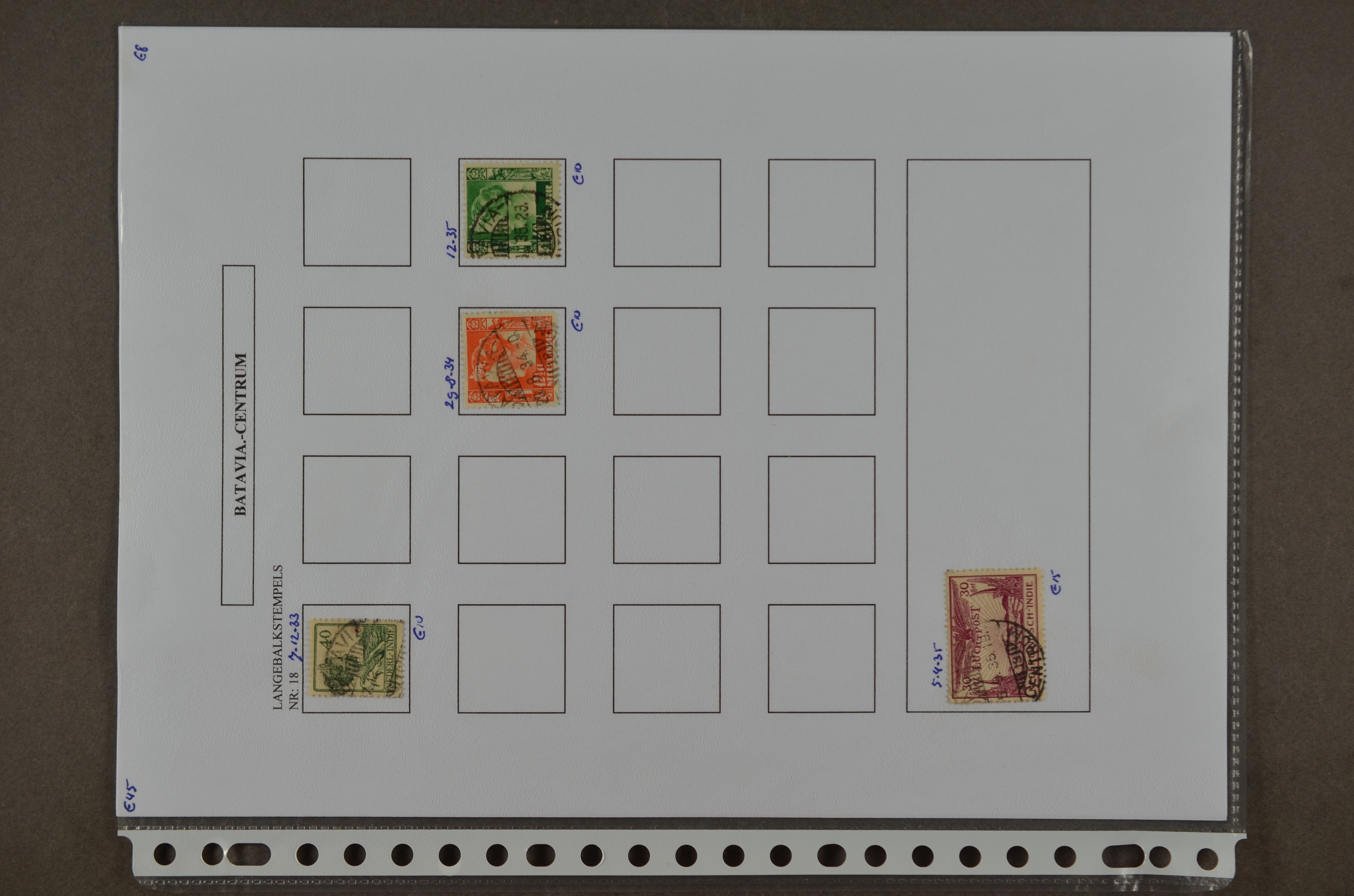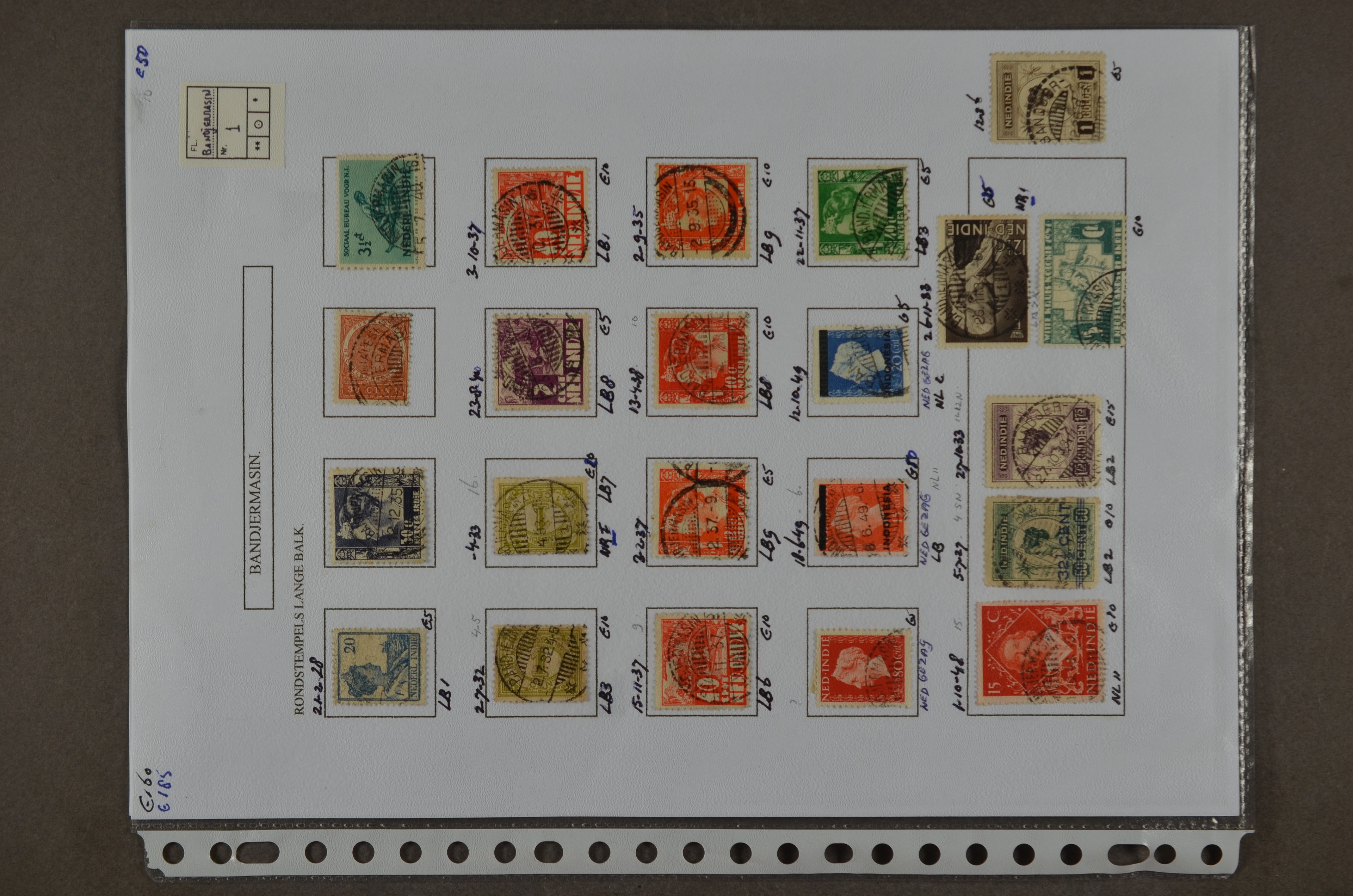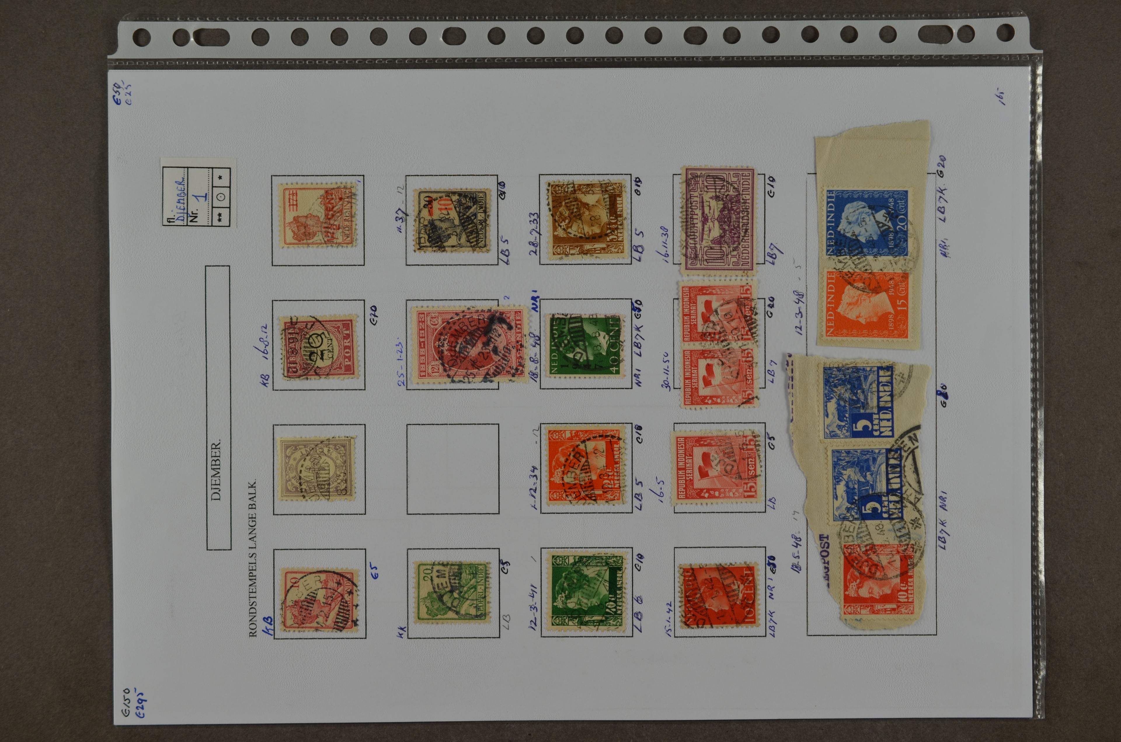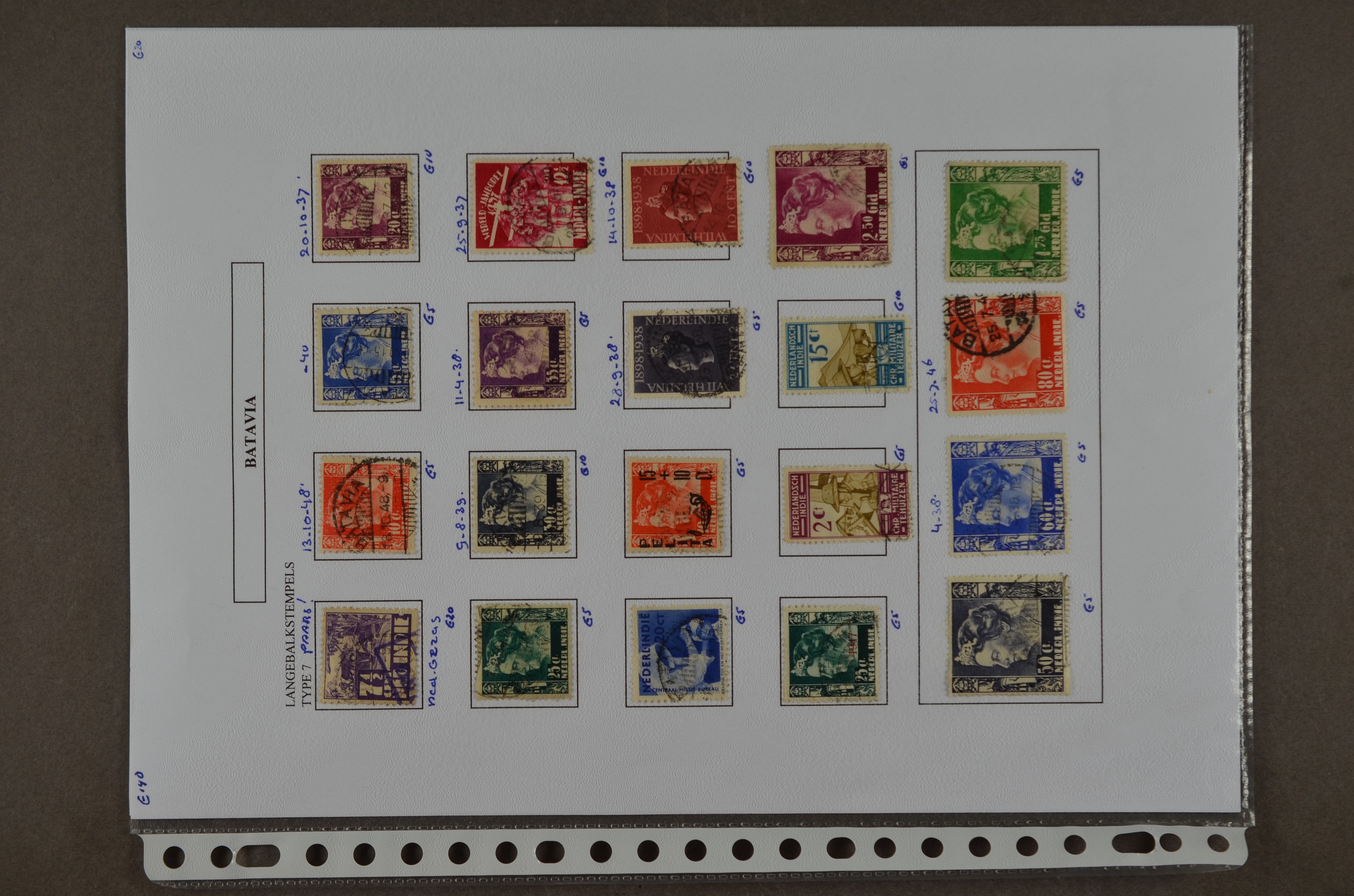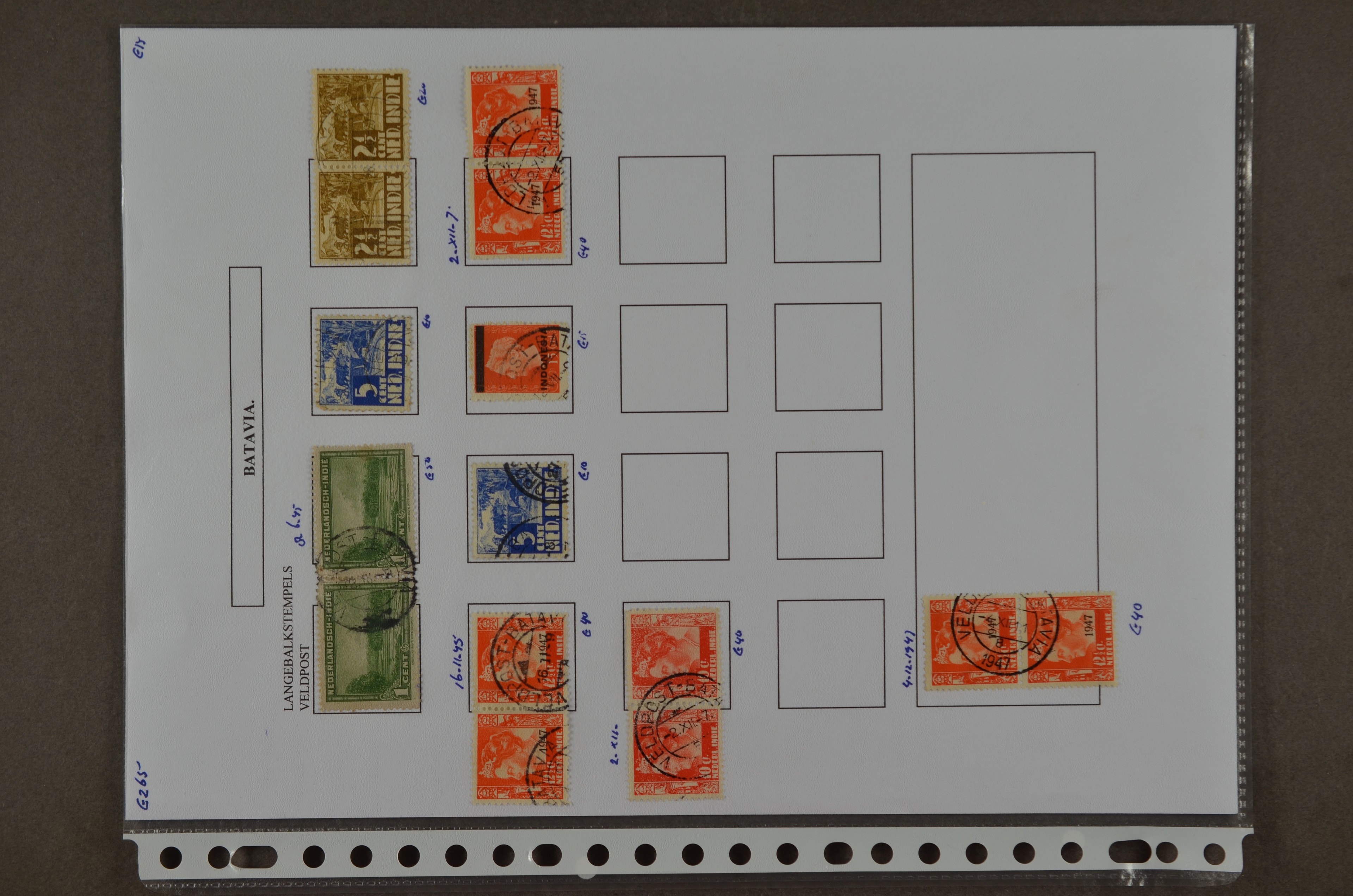 NED.- INDIË Langebalkstempels vanaf 1917, uitgebreide collectie met meerdere schaarse kantoren, verschillende typen per kantoor, veel mooie afstempelingen, ook andere typen als KB, PV1, PV2, LBnr, opgezet op bladen (w.o. door verzamelaar diverse foutief genoemde kantoornamen) in 8 ringbanden