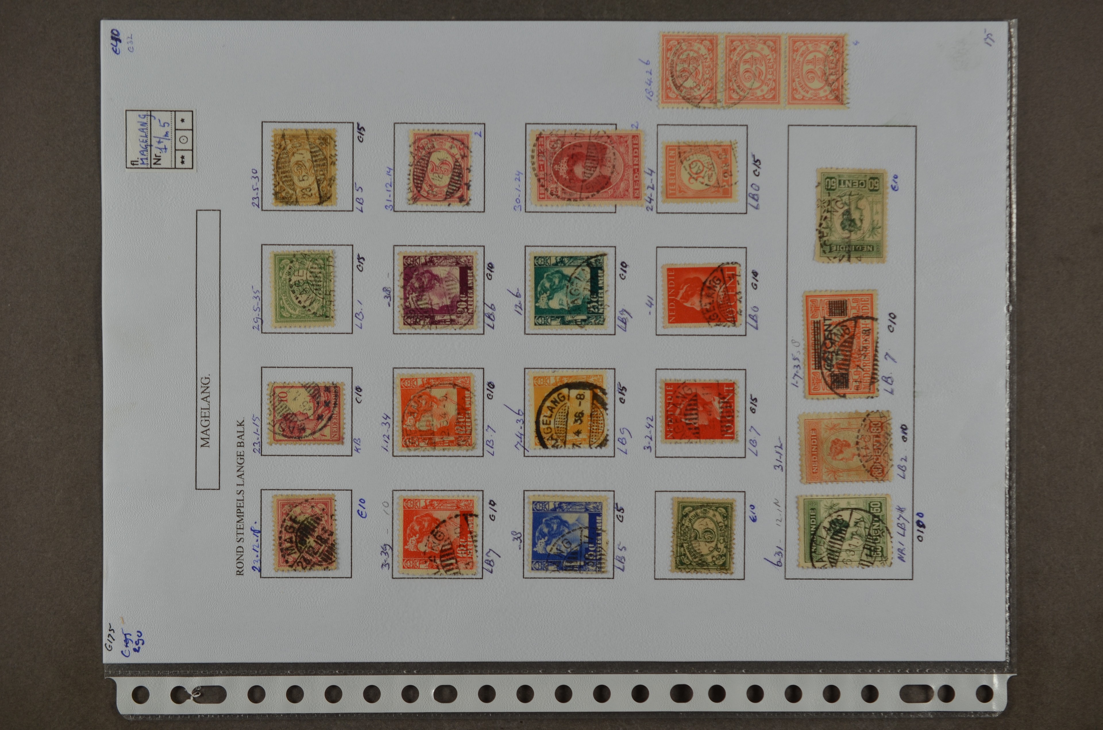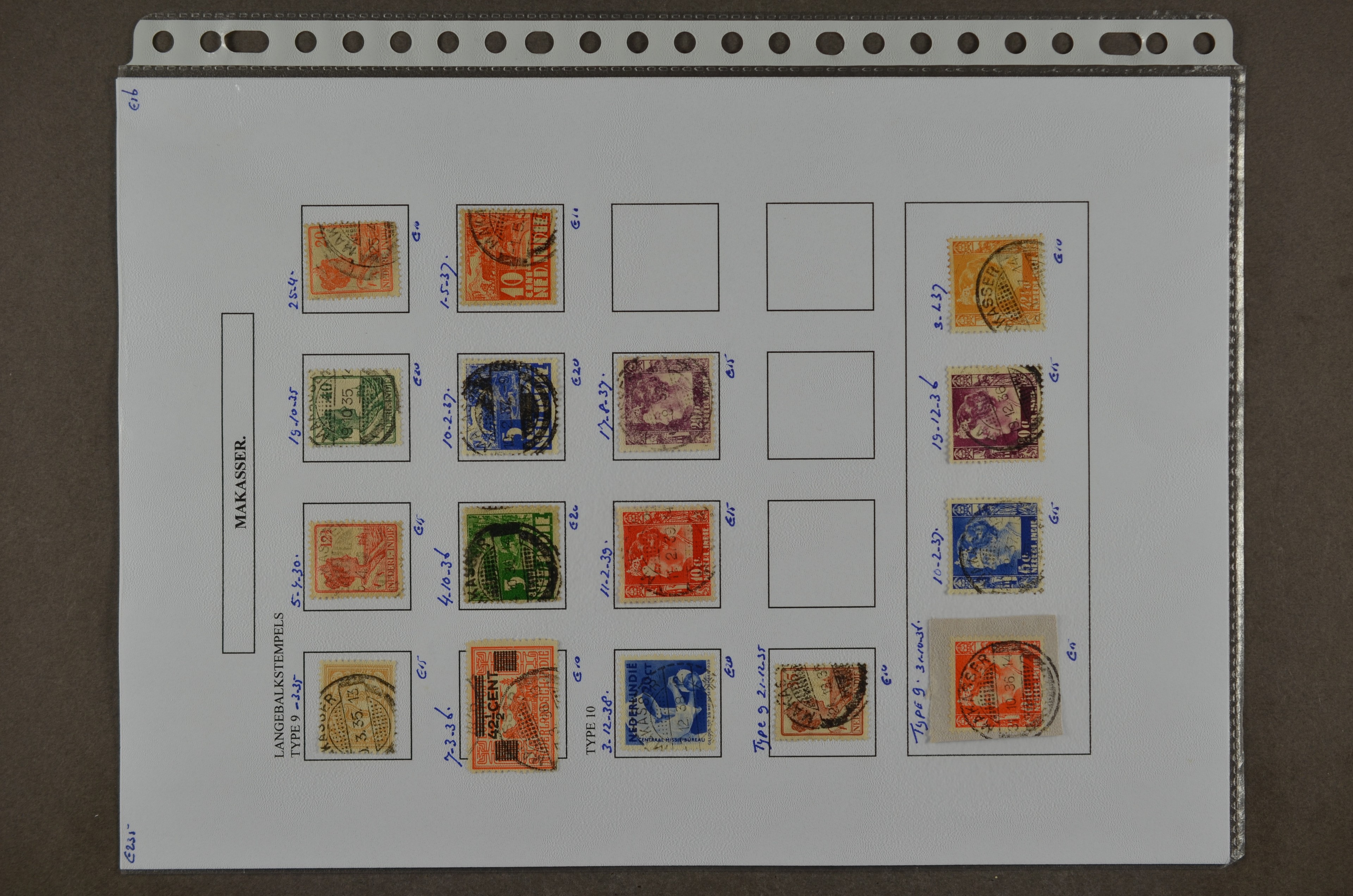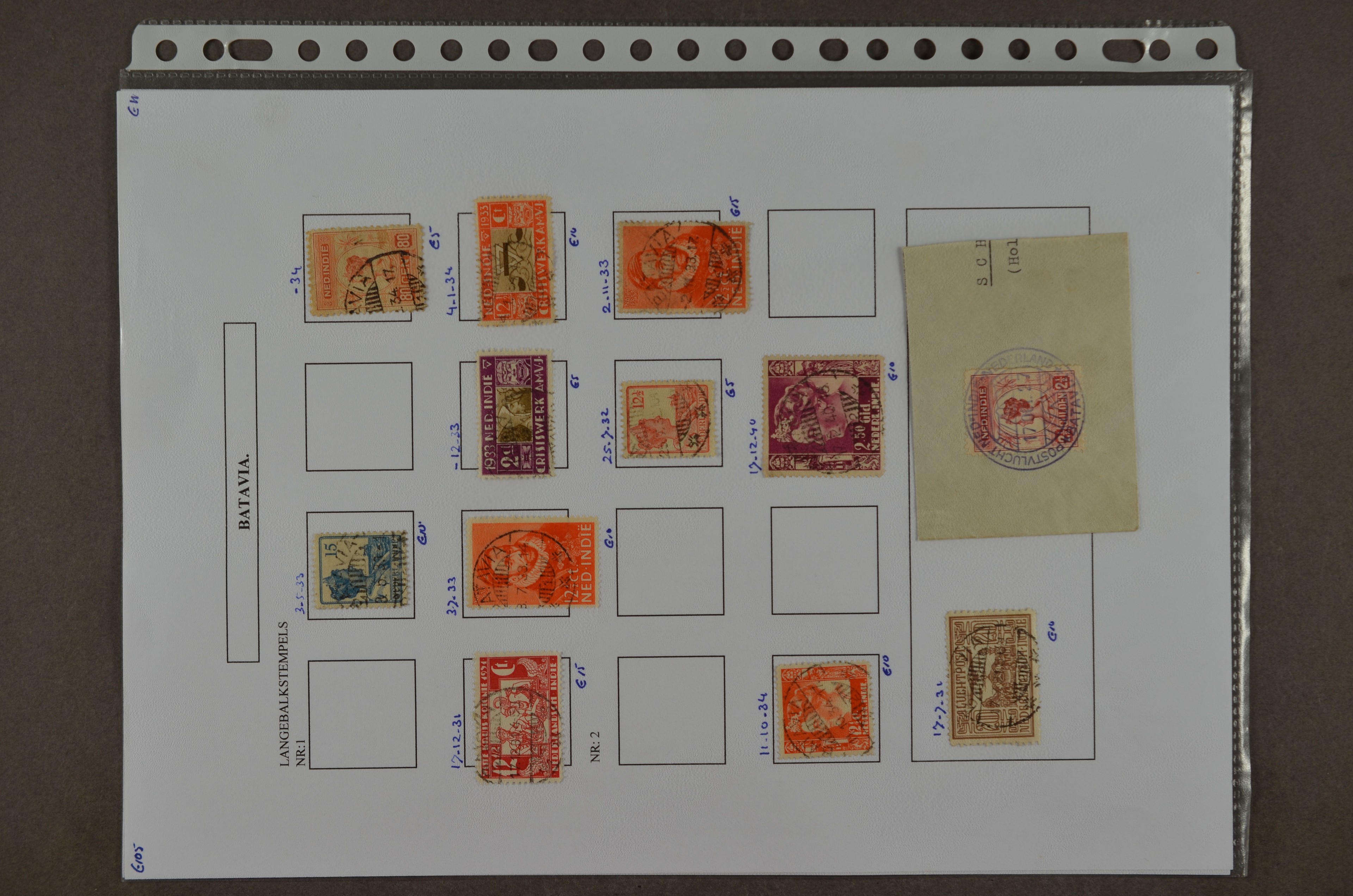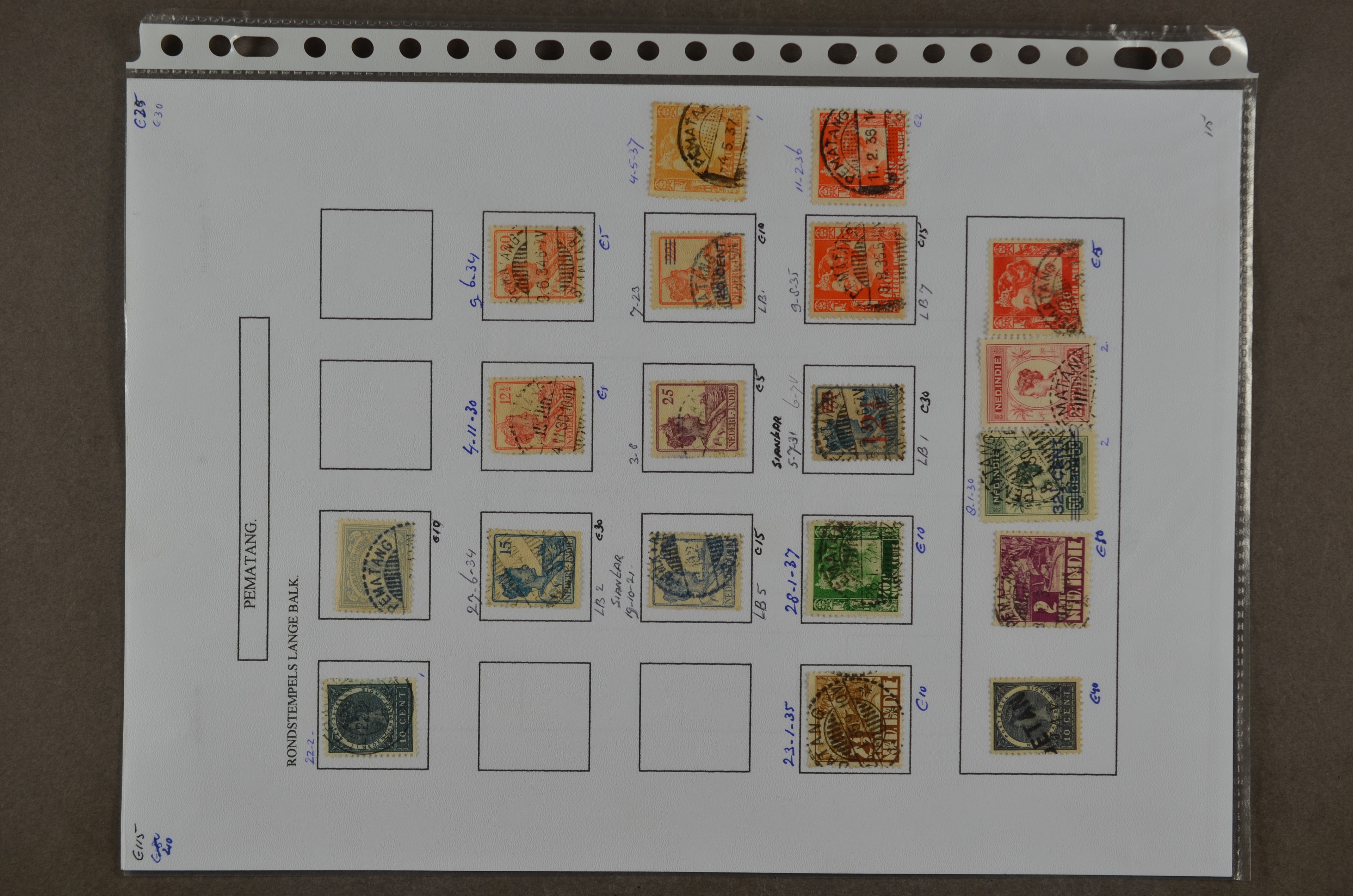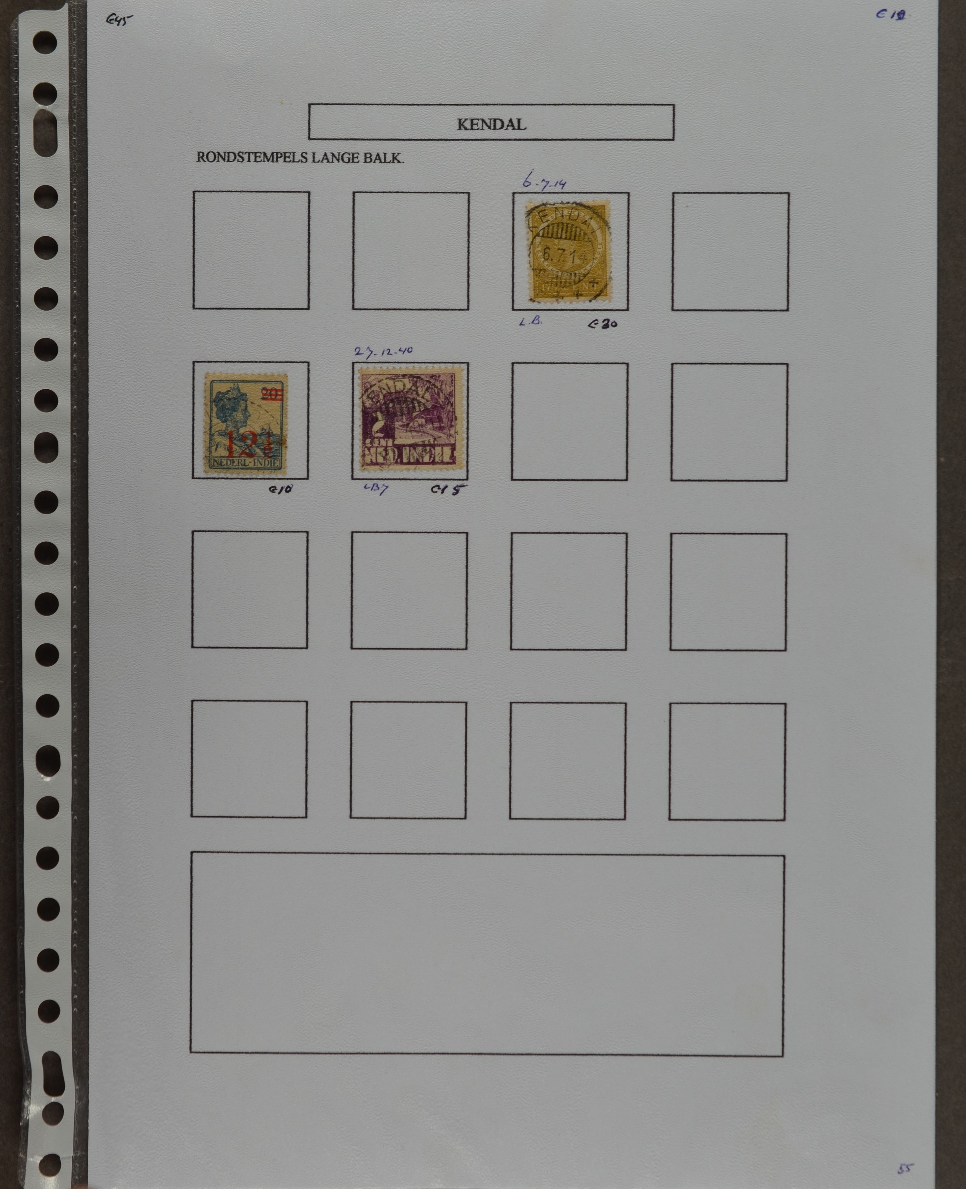 NED.- INDIË Langebalkstempels vanaf 1917, uitgebreide collectie met meerdere schaarse kantoren, verschillende typen per kantoor, veel mooie afstempelingen, ook andere typen als KB, PV1, PV2, LBnr, opgezet op bladen (w.o. door verzamelaar diverse foutief genoemde kantoornamen) in 8 ringbanden