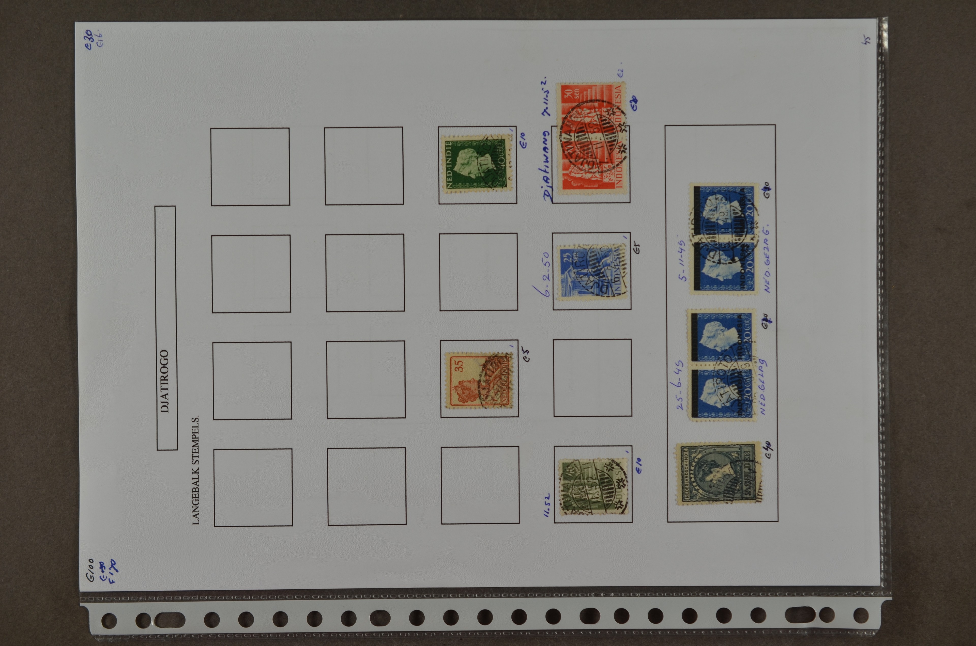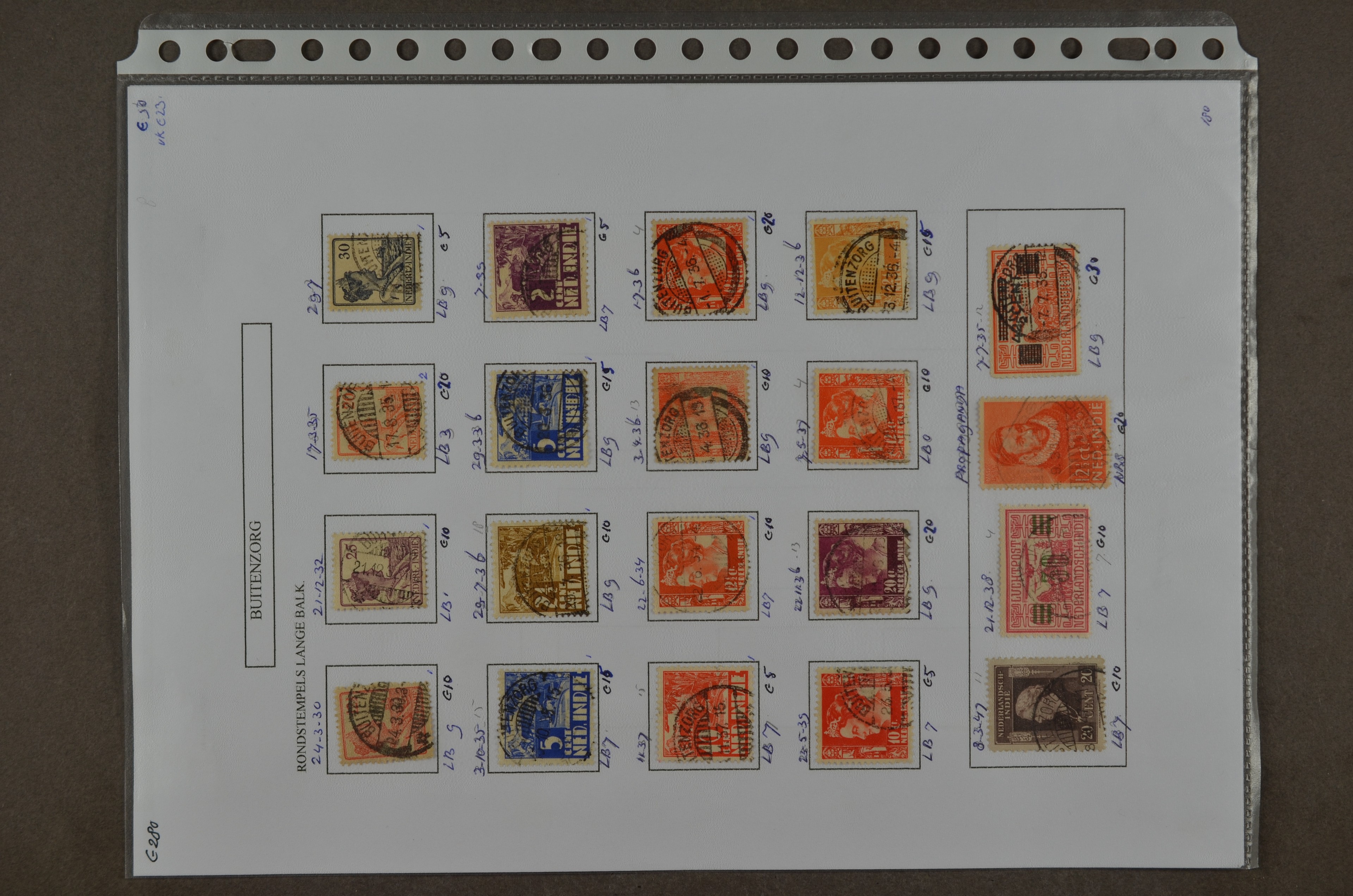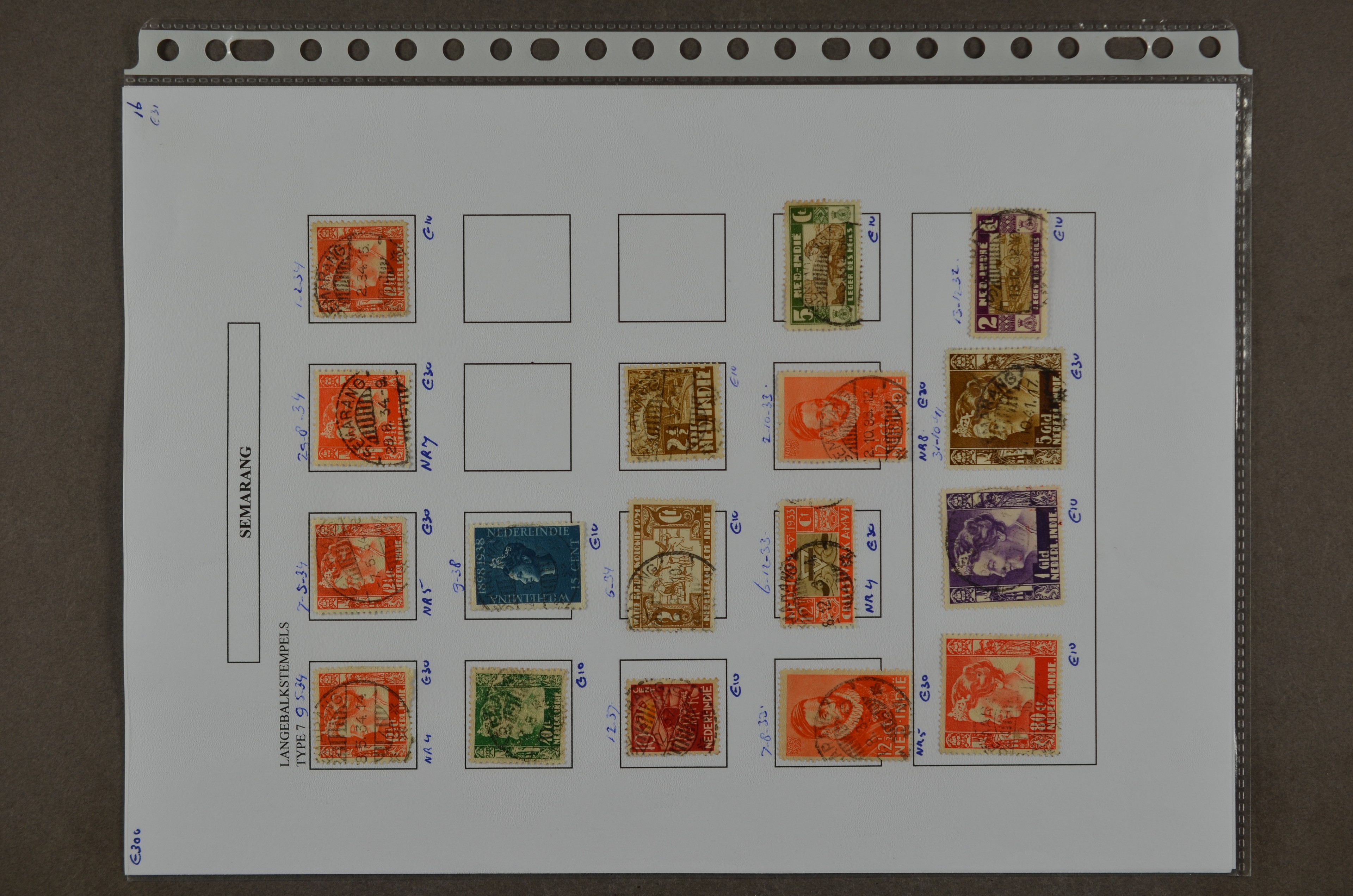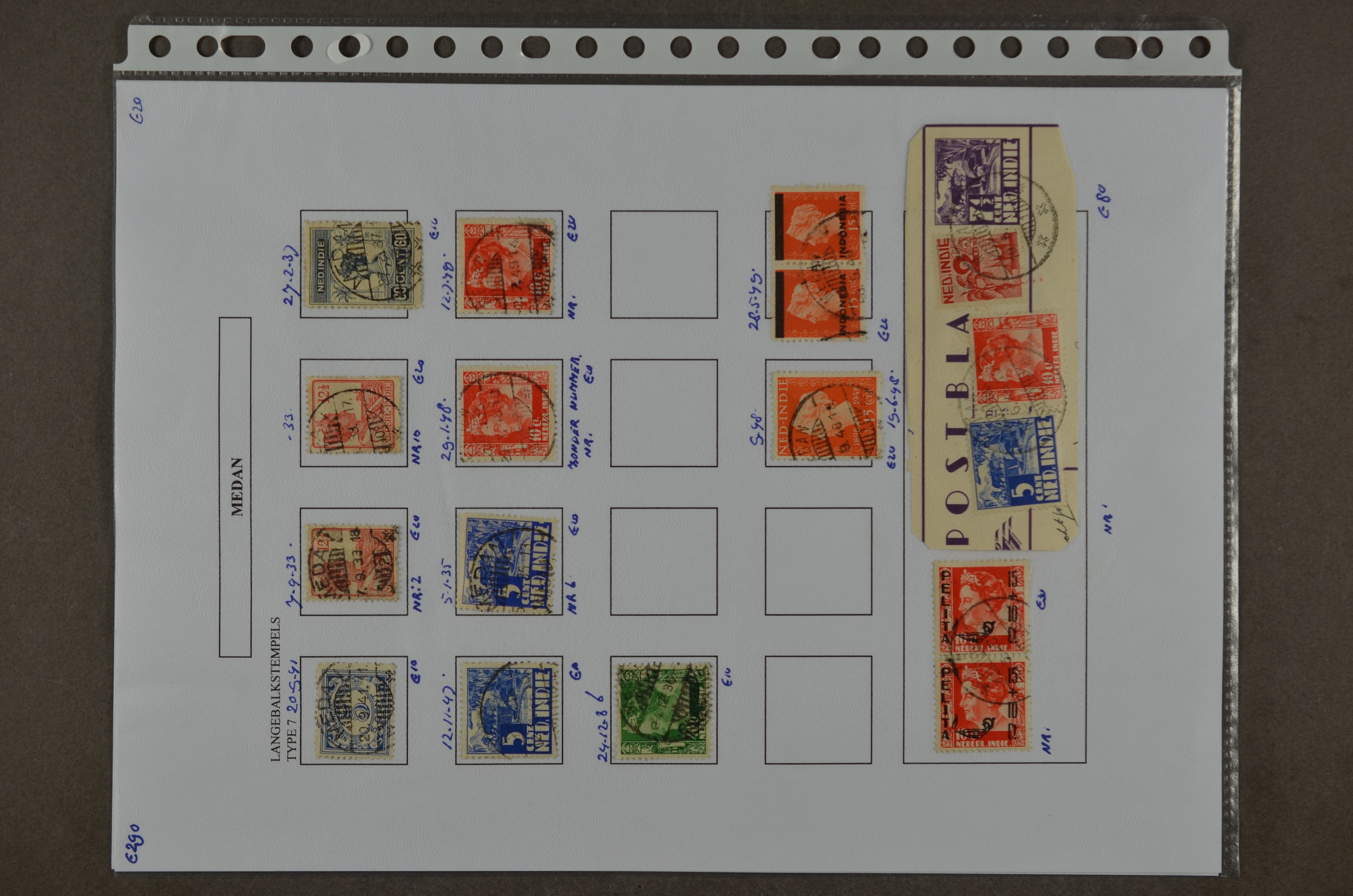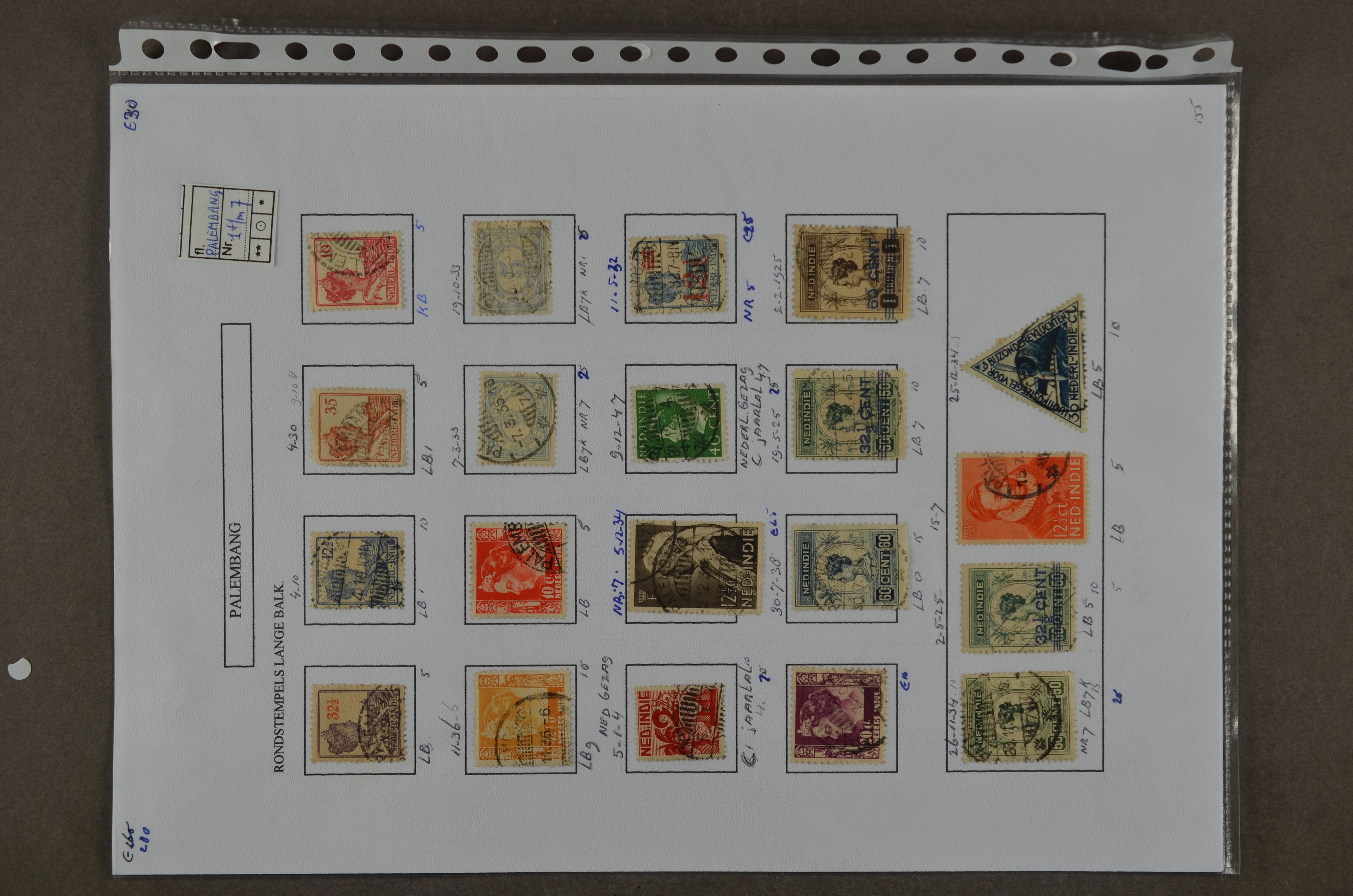 NED.- INDIË Langebalkstempels vanaf 1917, uitgebreide collectie met meerdere schaarse kantoren, verschillende typen per kantoor, veel mooie afstempelingen, ook andere typen als KB, PV1, PV2, LBnr, opgezet op bladen (w.o. door verzamelaar diverse foutief genoemde kantoornamen) in 8 ringbanden