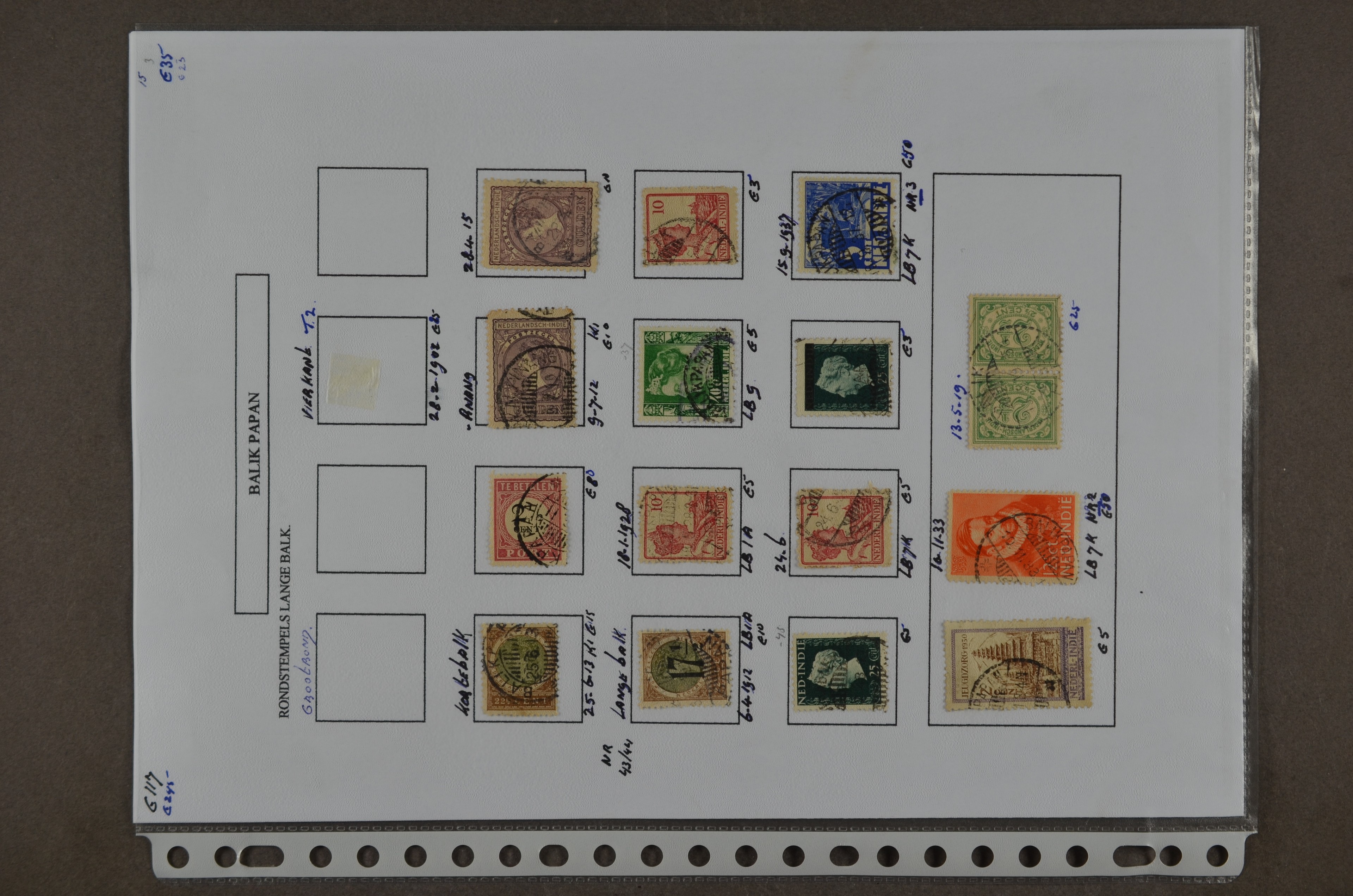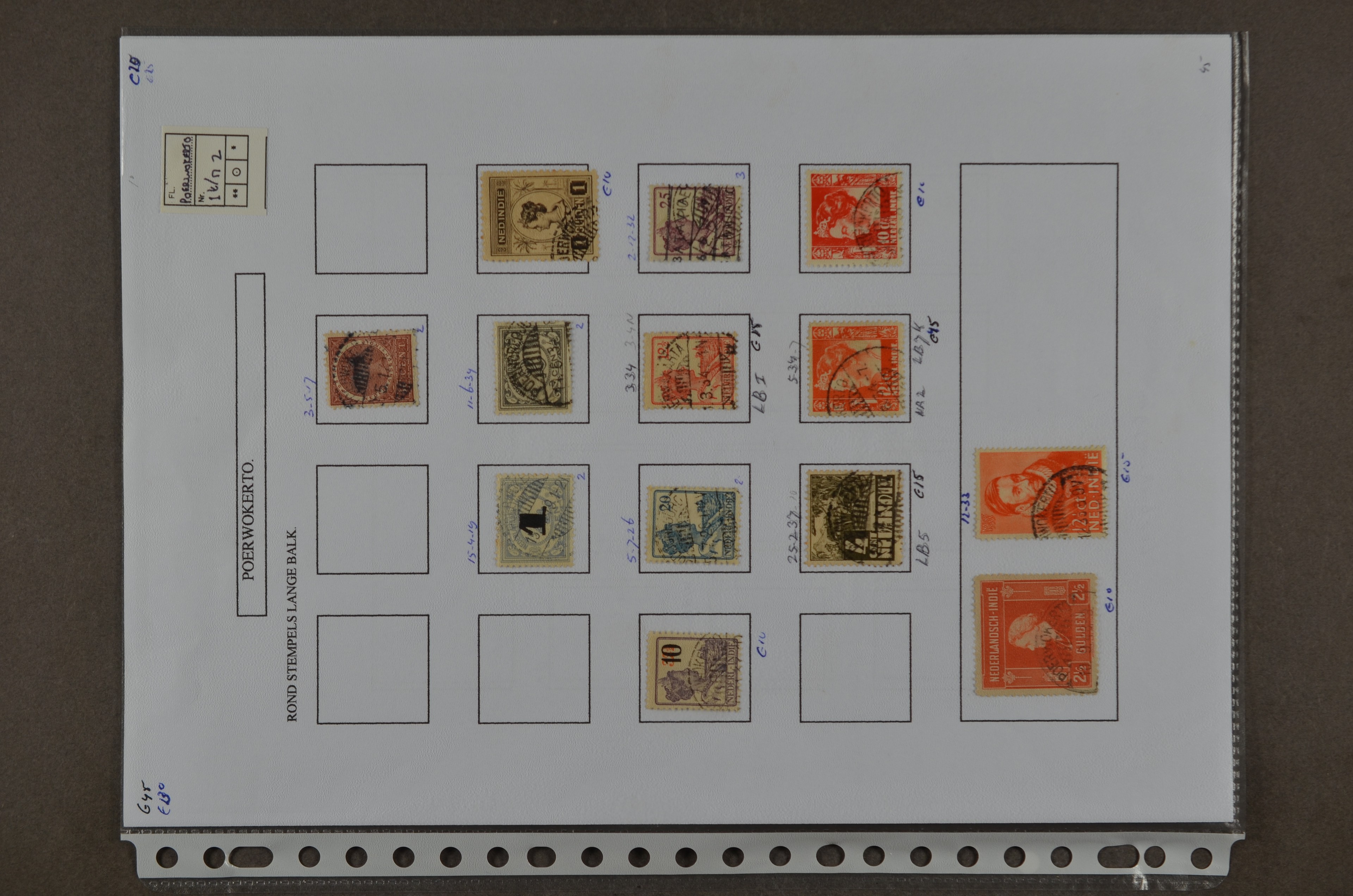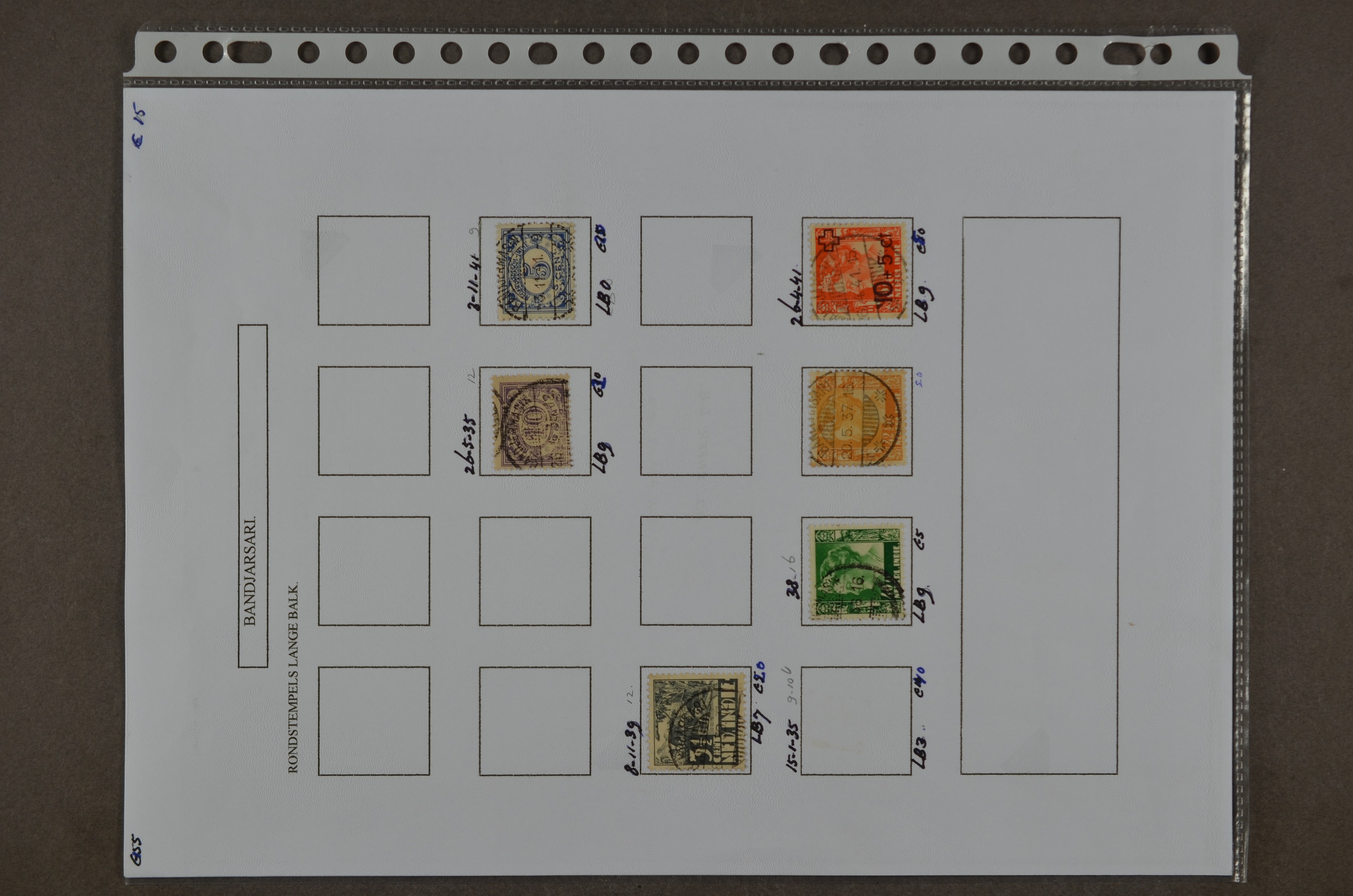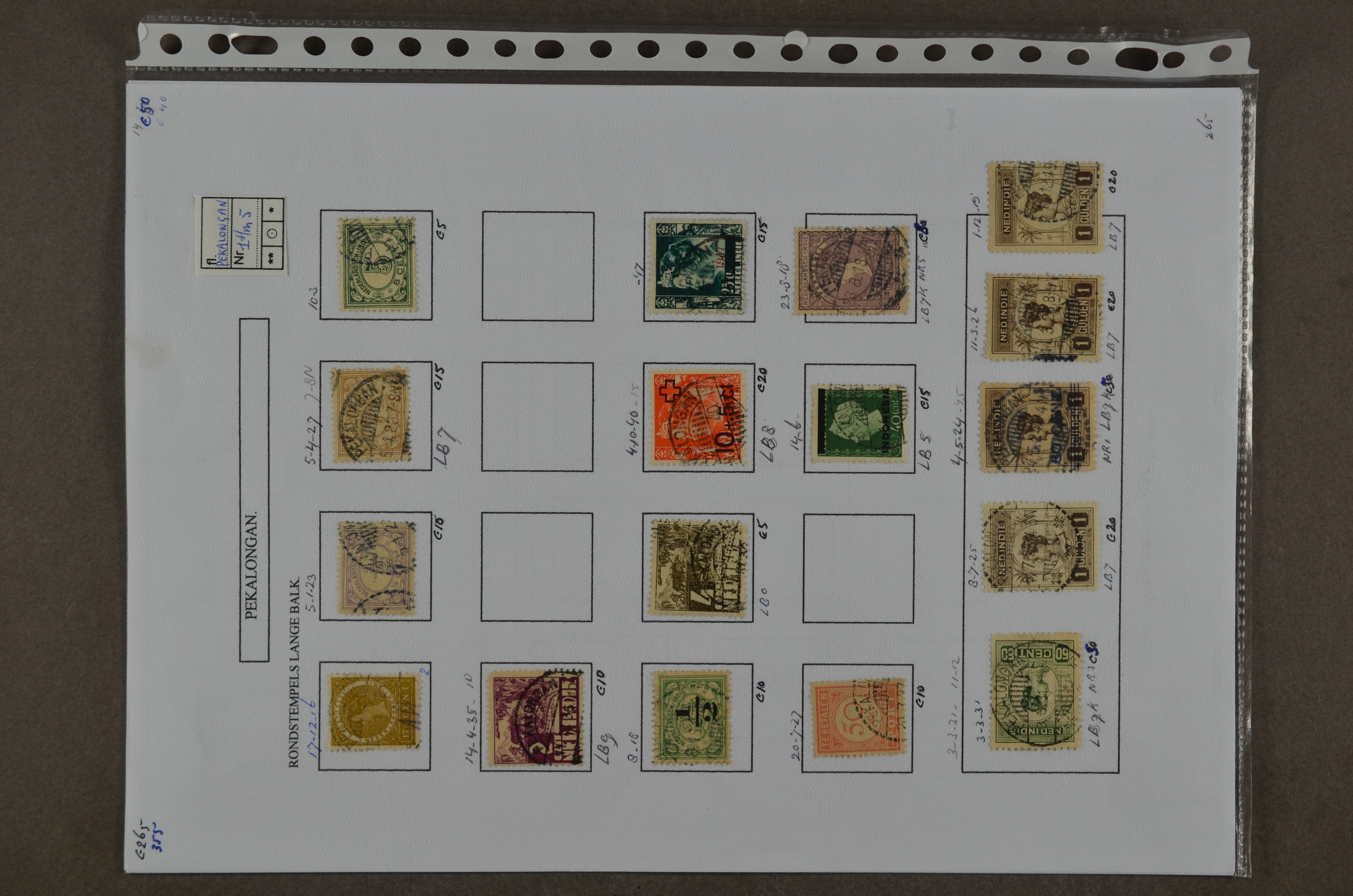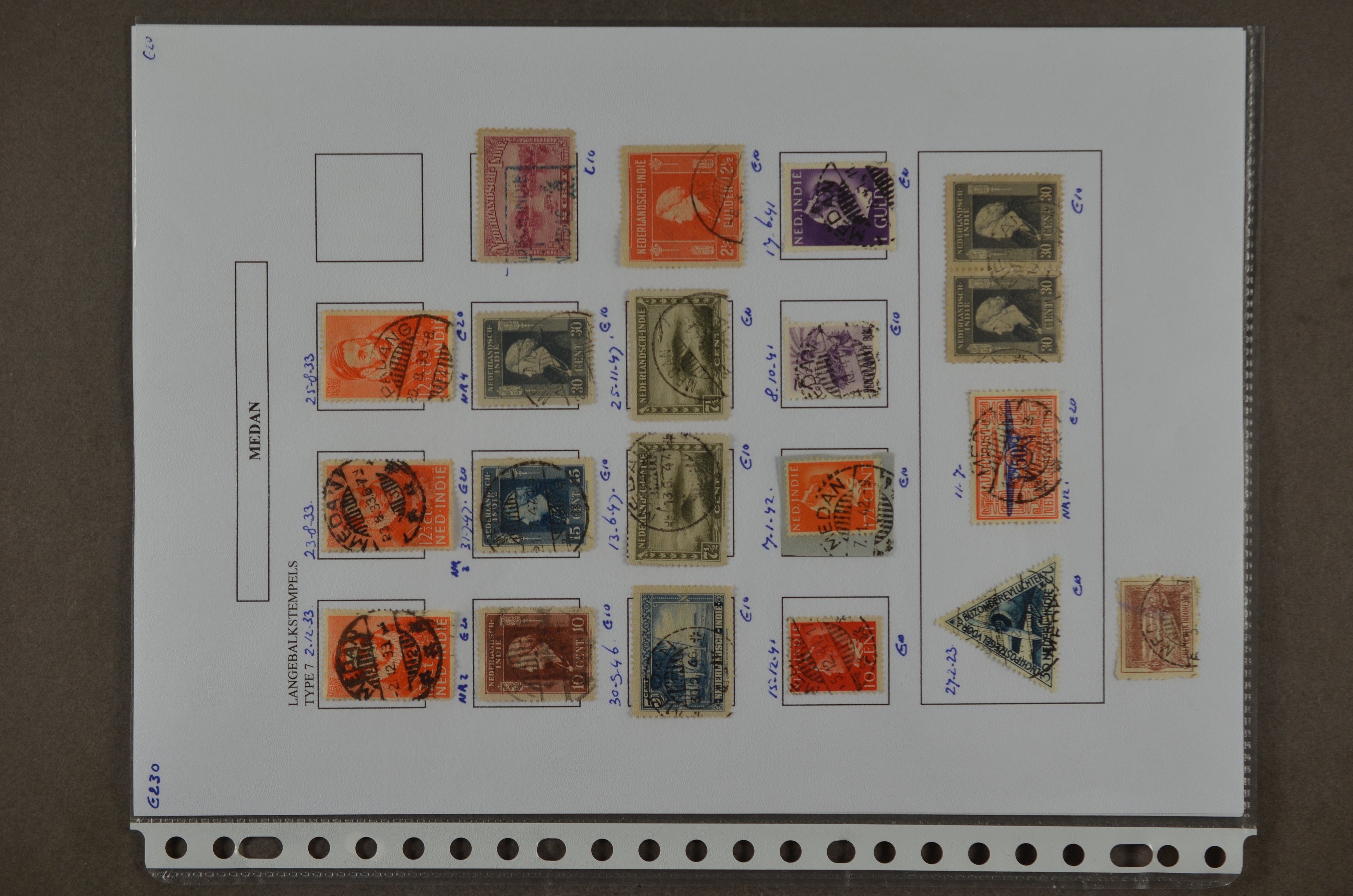 NED.- INDIË Langebalkstempels vanaf 1917, uitgebreide collectie met meerdere schaarse kantoren, verschillende typen per kantoor, veel mooie afstempelingen, ook andere typen als KB, PV1, PV2, LBnr, opgezet op bladen (w.o. door verzamelaar diverse foutief genoemde kantoornamen) in 8 ringbanden