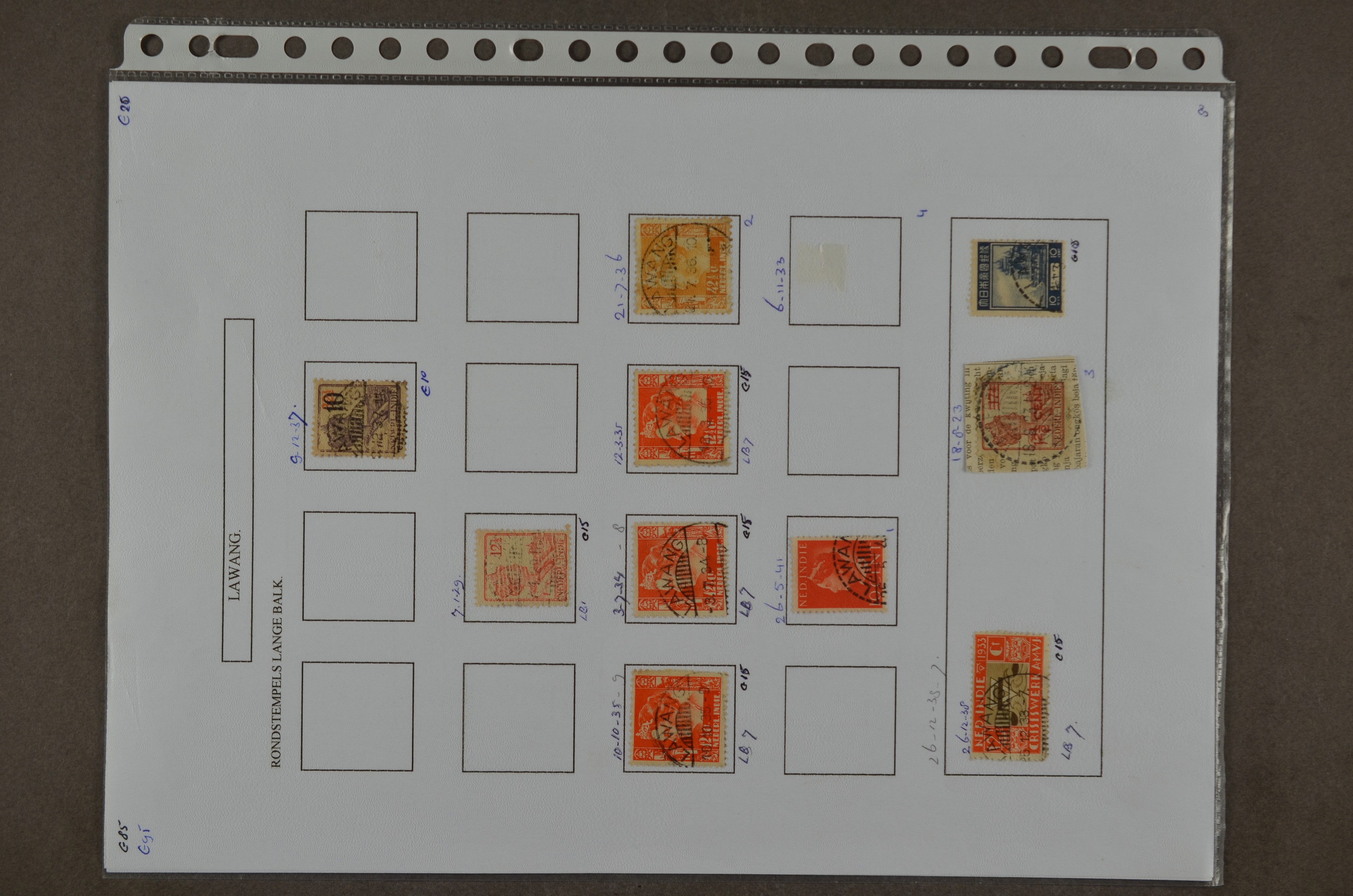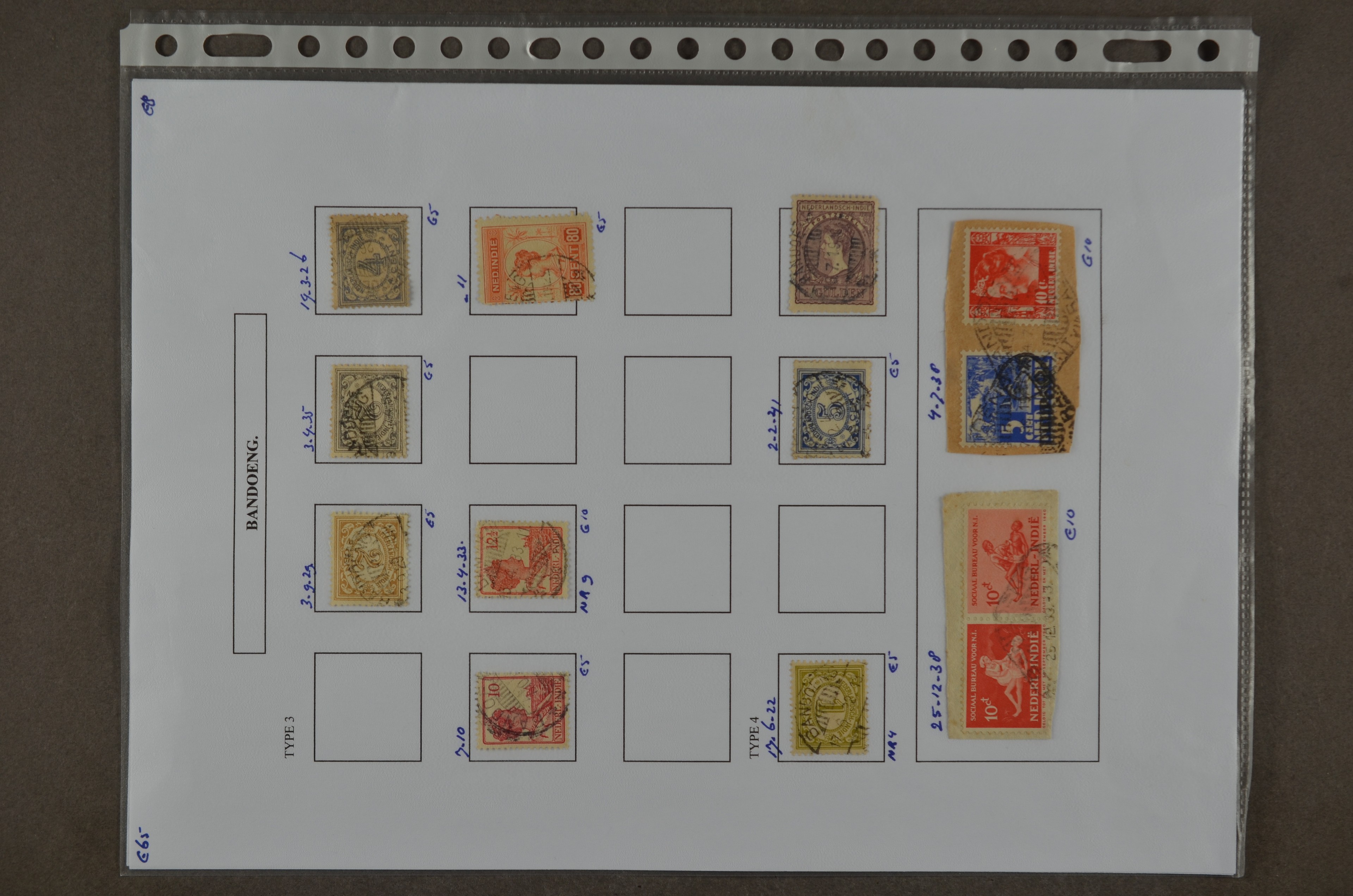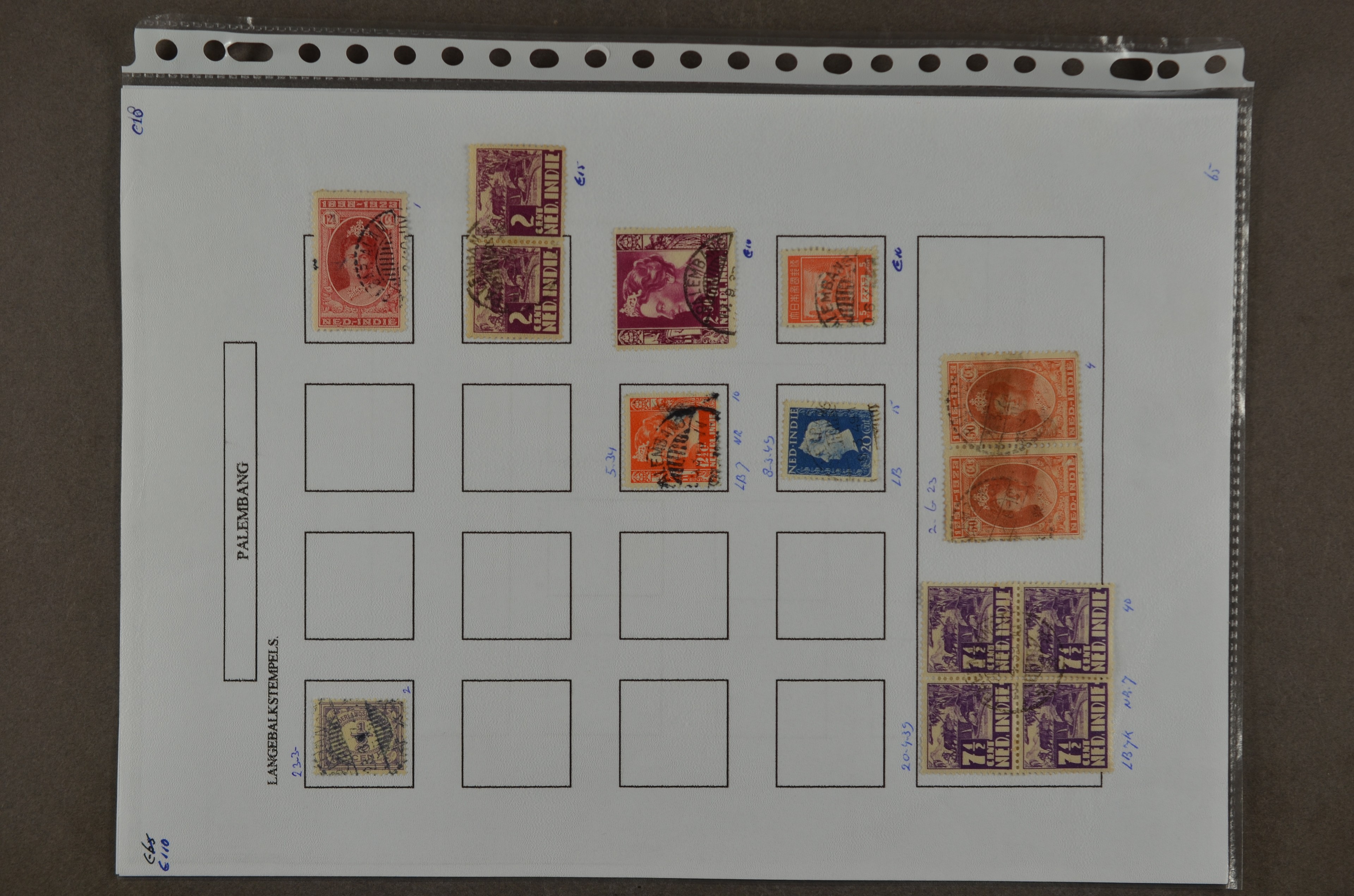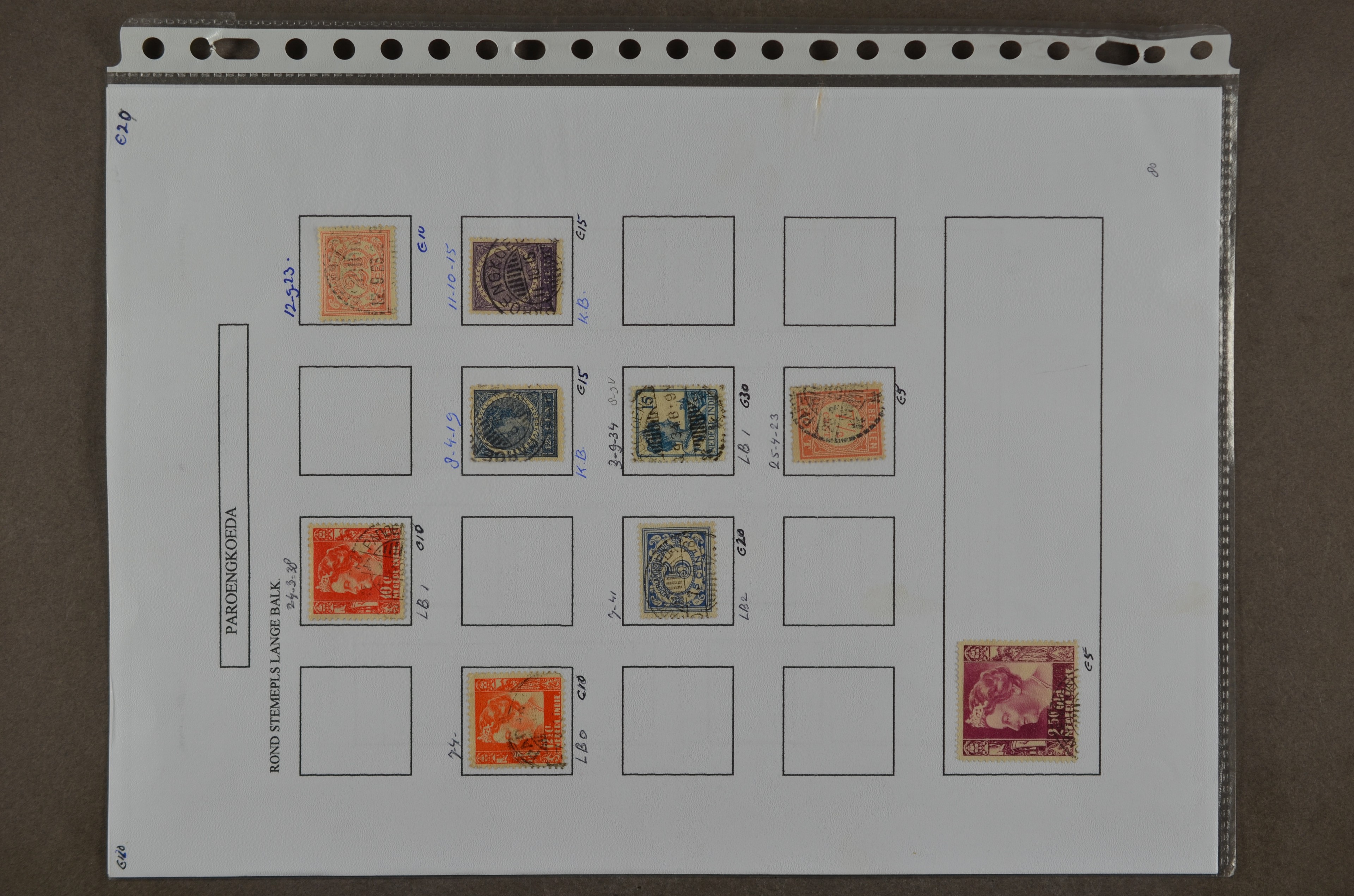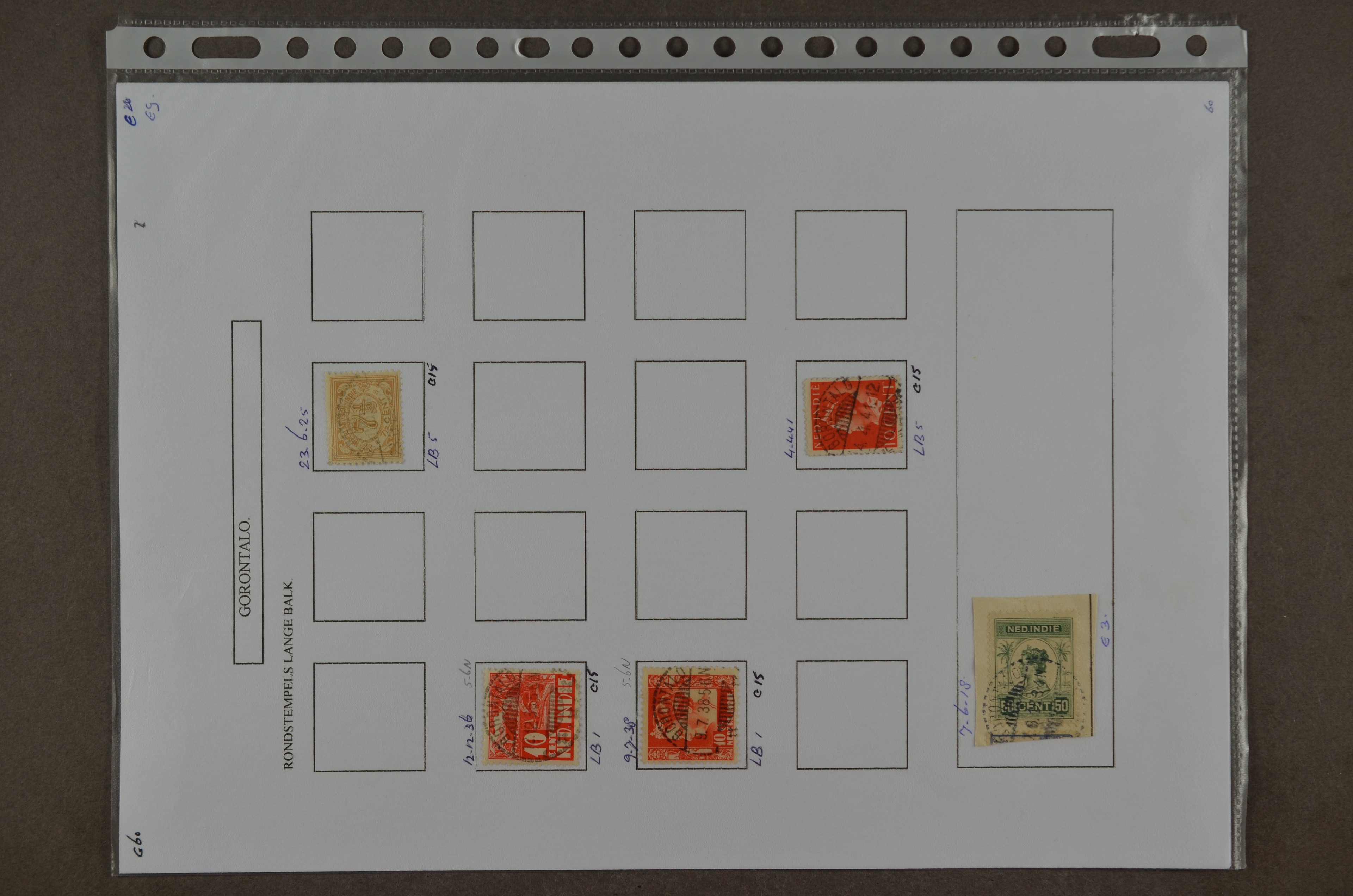 NED.- INDIË Langebalkstempels vanaf 1917, uitgebreide collectie met meerdere schaarse kantoren, verschillende typen per kantoor, veel mooie afstempelingen, ook andere typen als KB, PV1, PV2, LBnr, opgezet op bladen (w.o. door verzamelaar diverse foutief genoemde kantoornamen) in 8 ringbanden