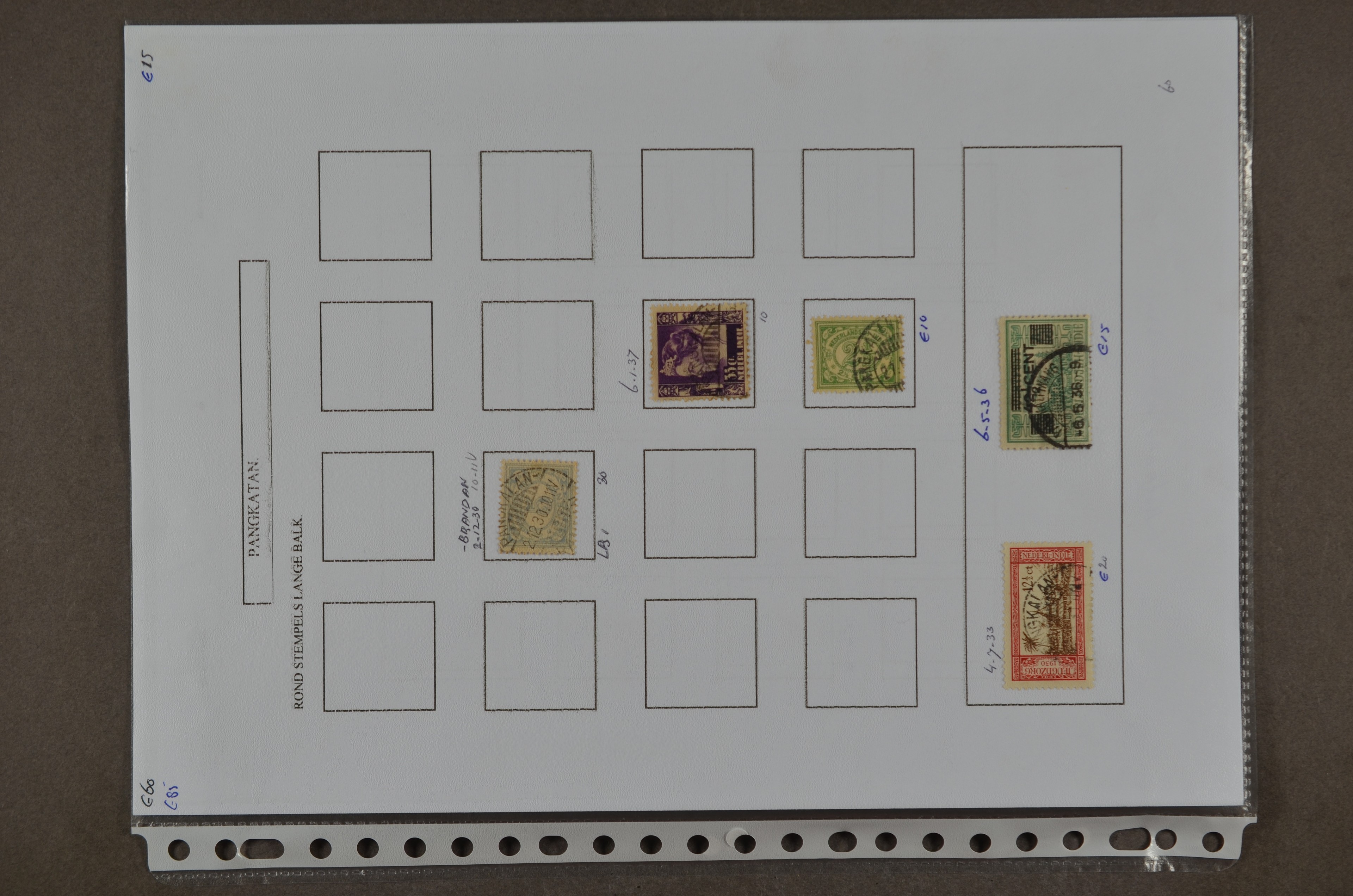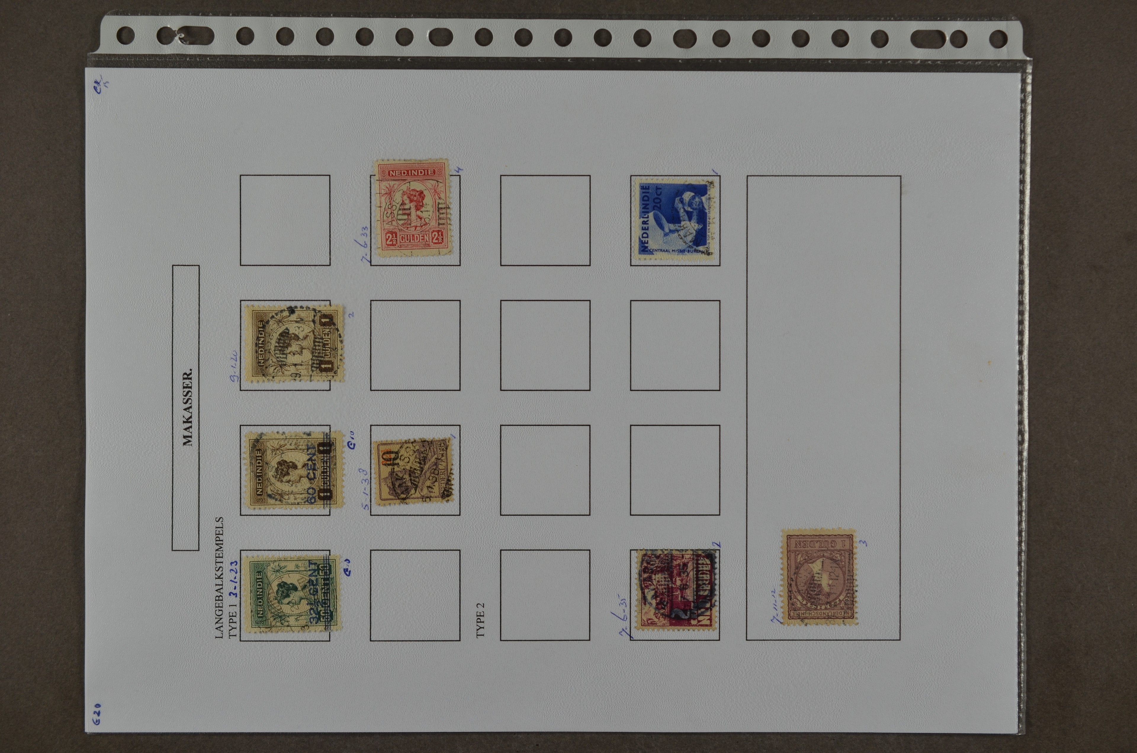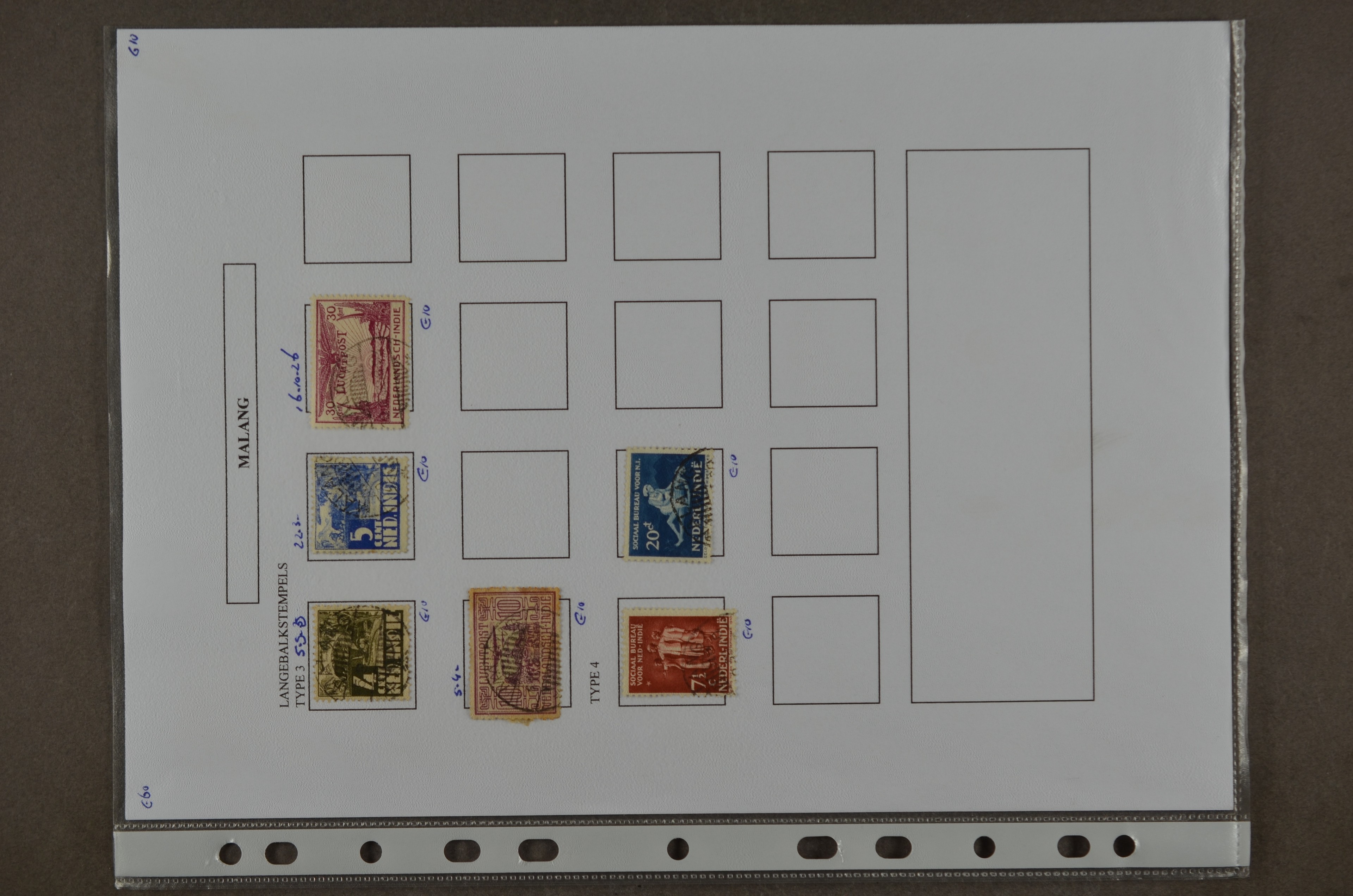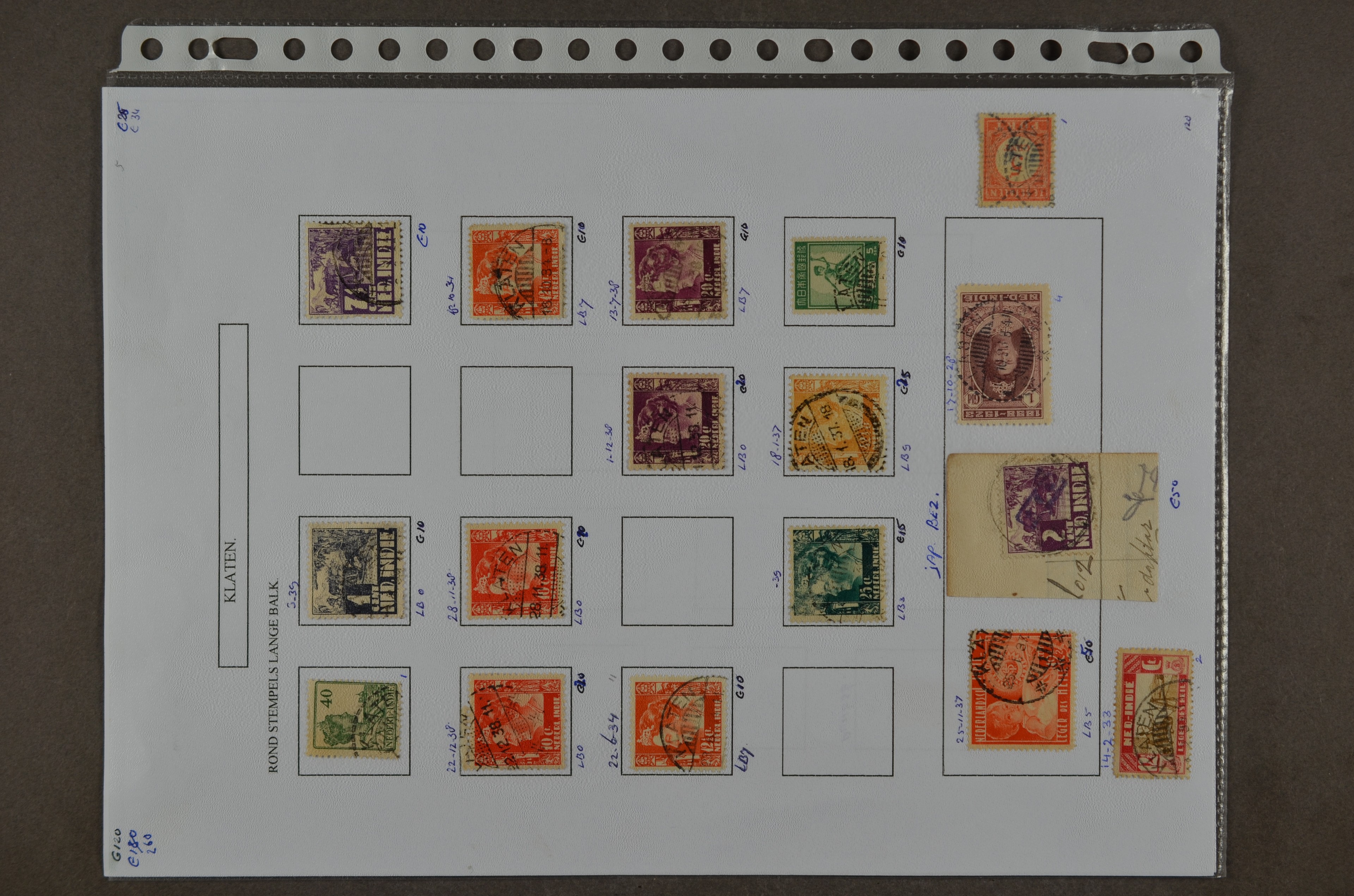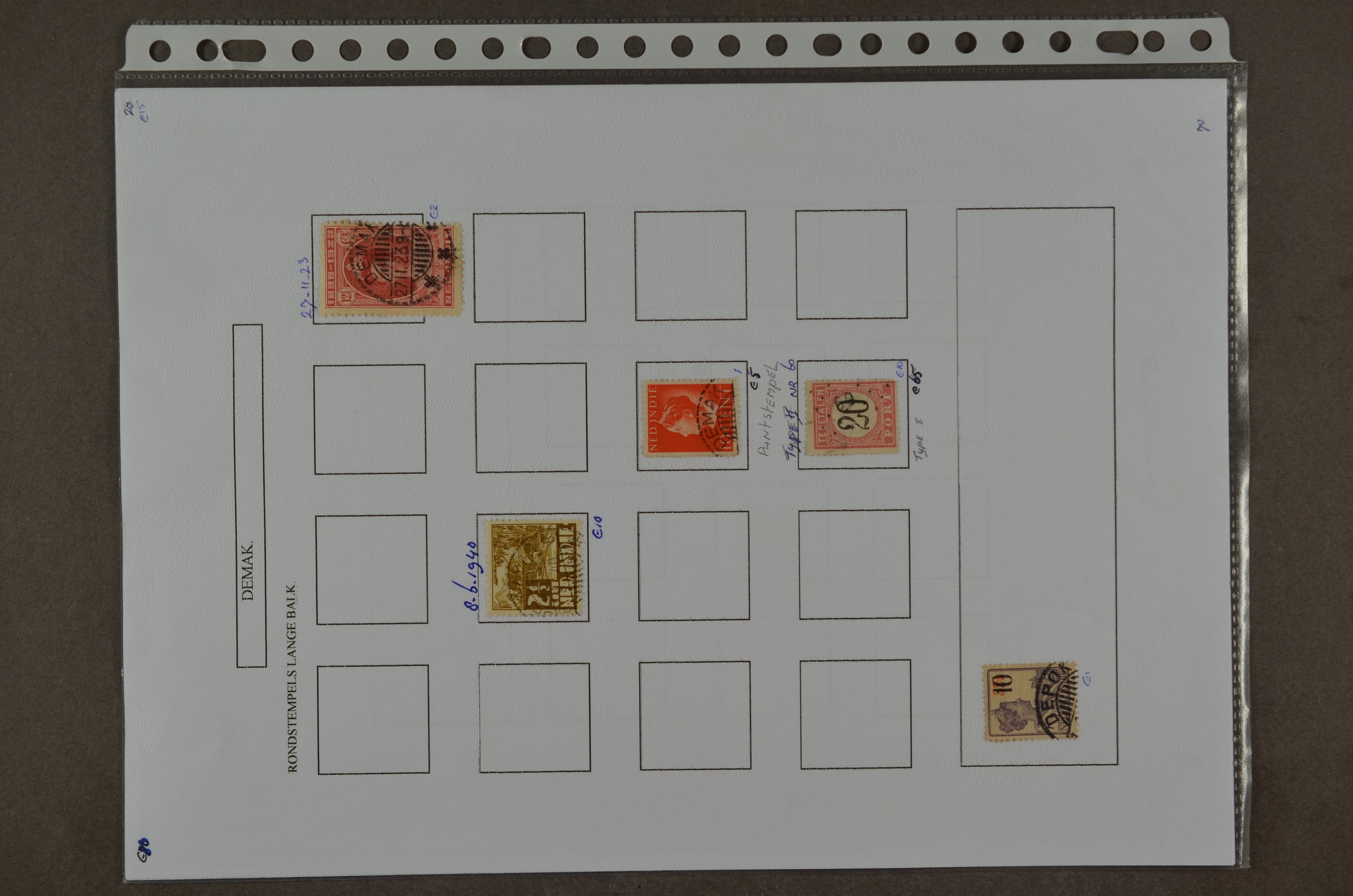 NED.- INDIË Langebalkstempels vanaf 1917, uitgebreide collectie met meerdere schaarse kantoren, verschillende typen per kantoor, veel mooie afstempelingen, ook andere typen als KB, PV1, PV2, LBnr, opgezet op bladen (w.o. door verzamelaar diverse foutief genoemde kantoornamen) in 8 ringbanden