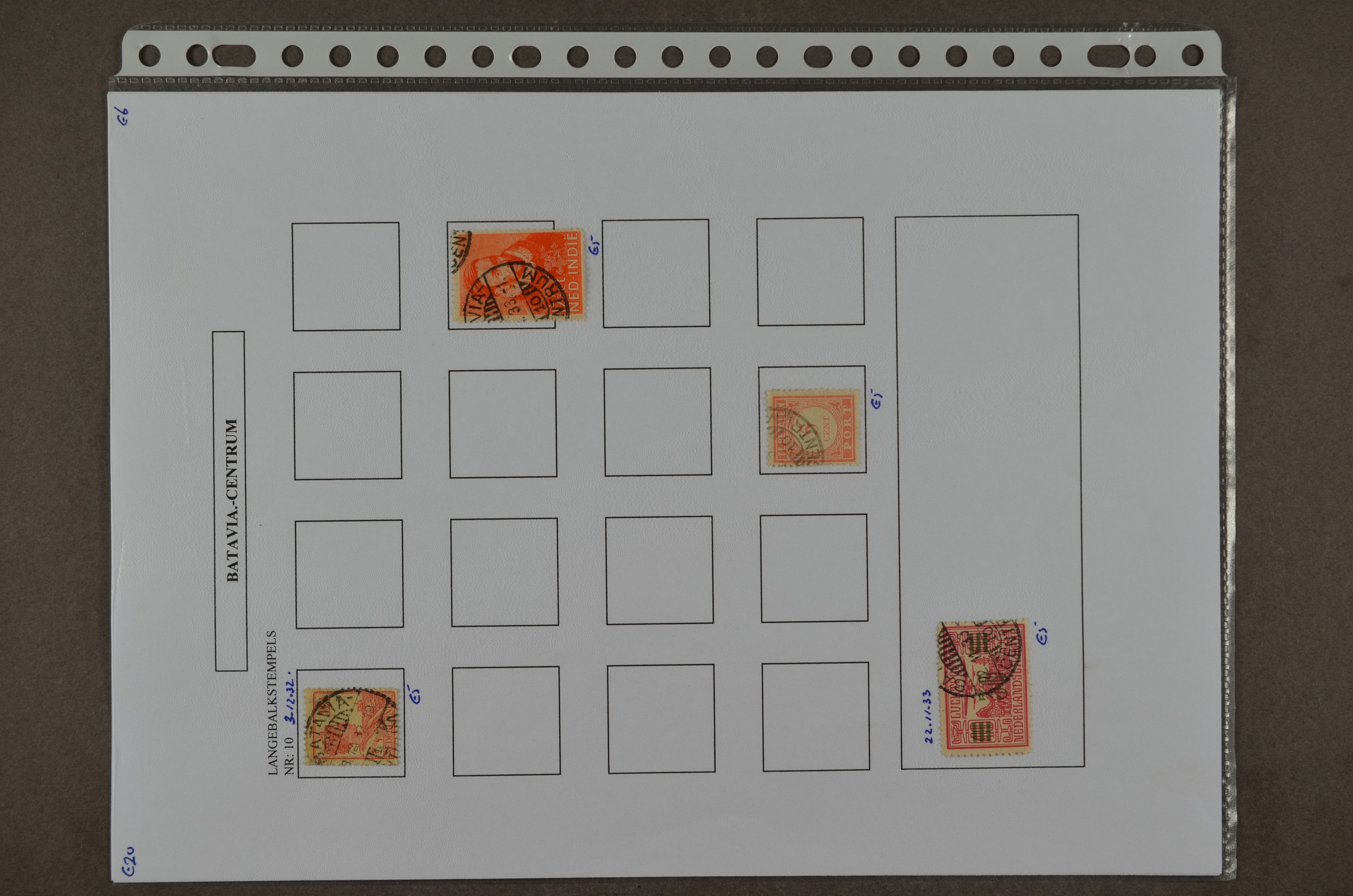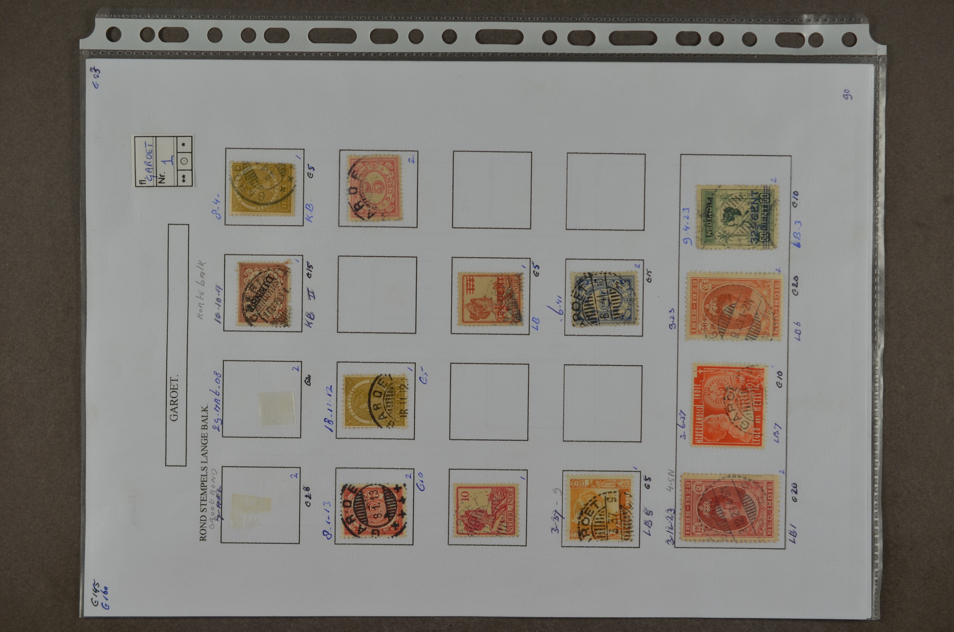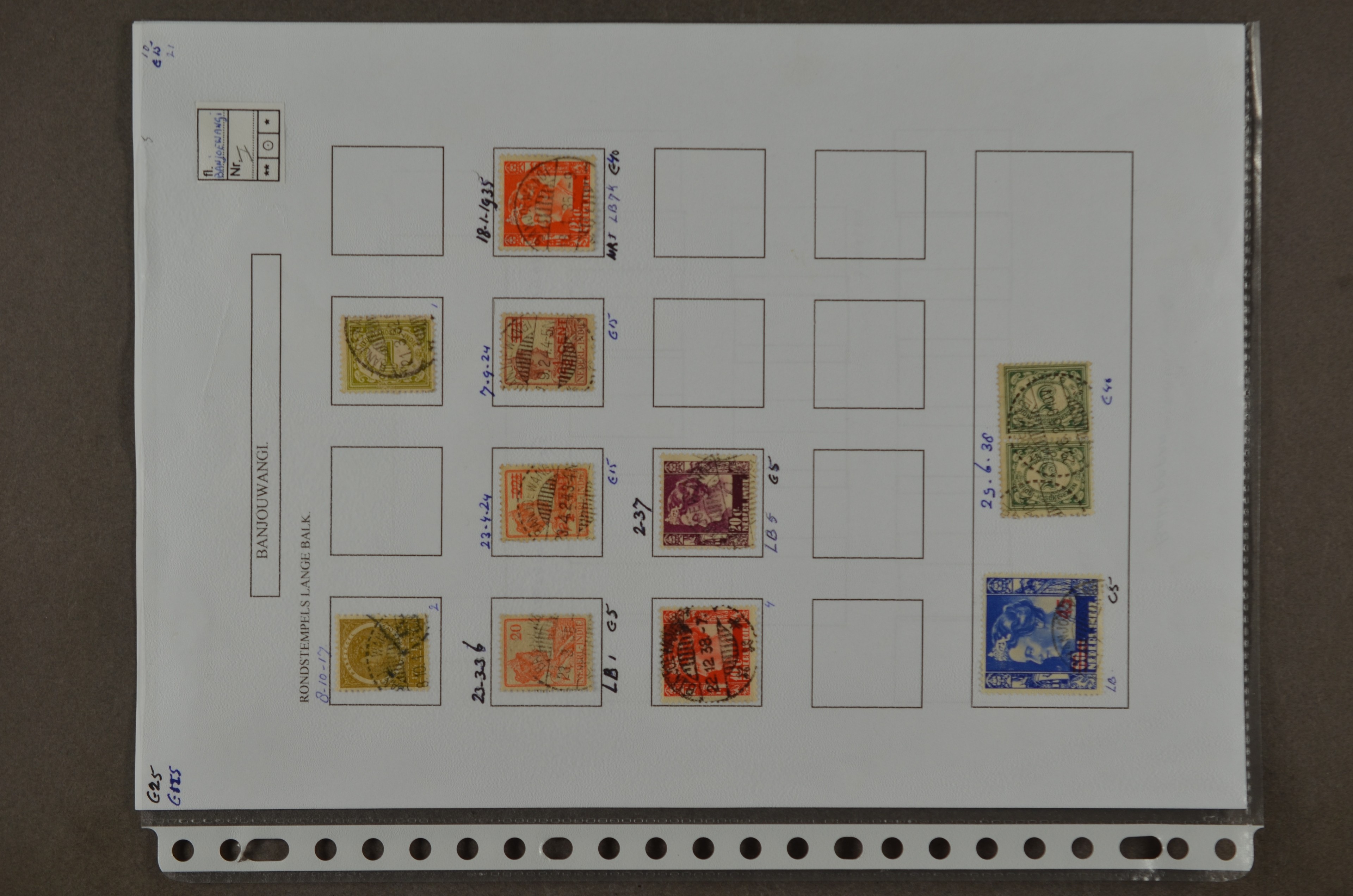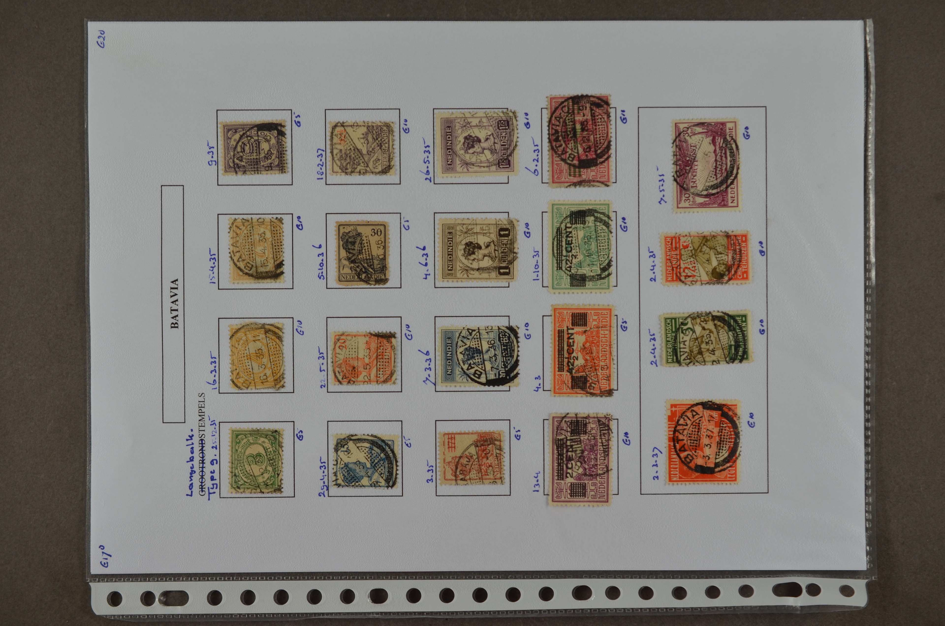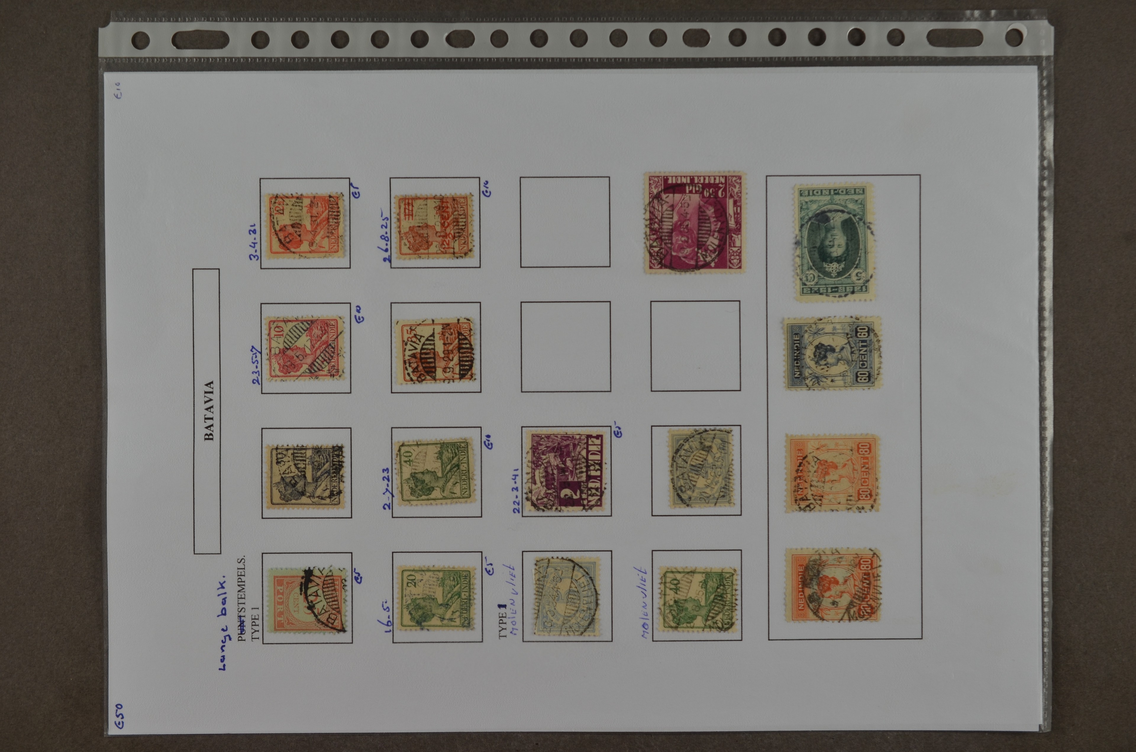 NED.- INDIË Langebalkstempels vanaf 1917, uitgebreide collectie met meerdere schaarse kantoren, verschillende typen per kantoor, veel mooie afstempelingen, ook andere typen als KB, PV1, PV2, LBnr, opgezet op bladen (w.o. door verzamelaar diverse foutief genoemde kantoornamen) in 8 ringbanden